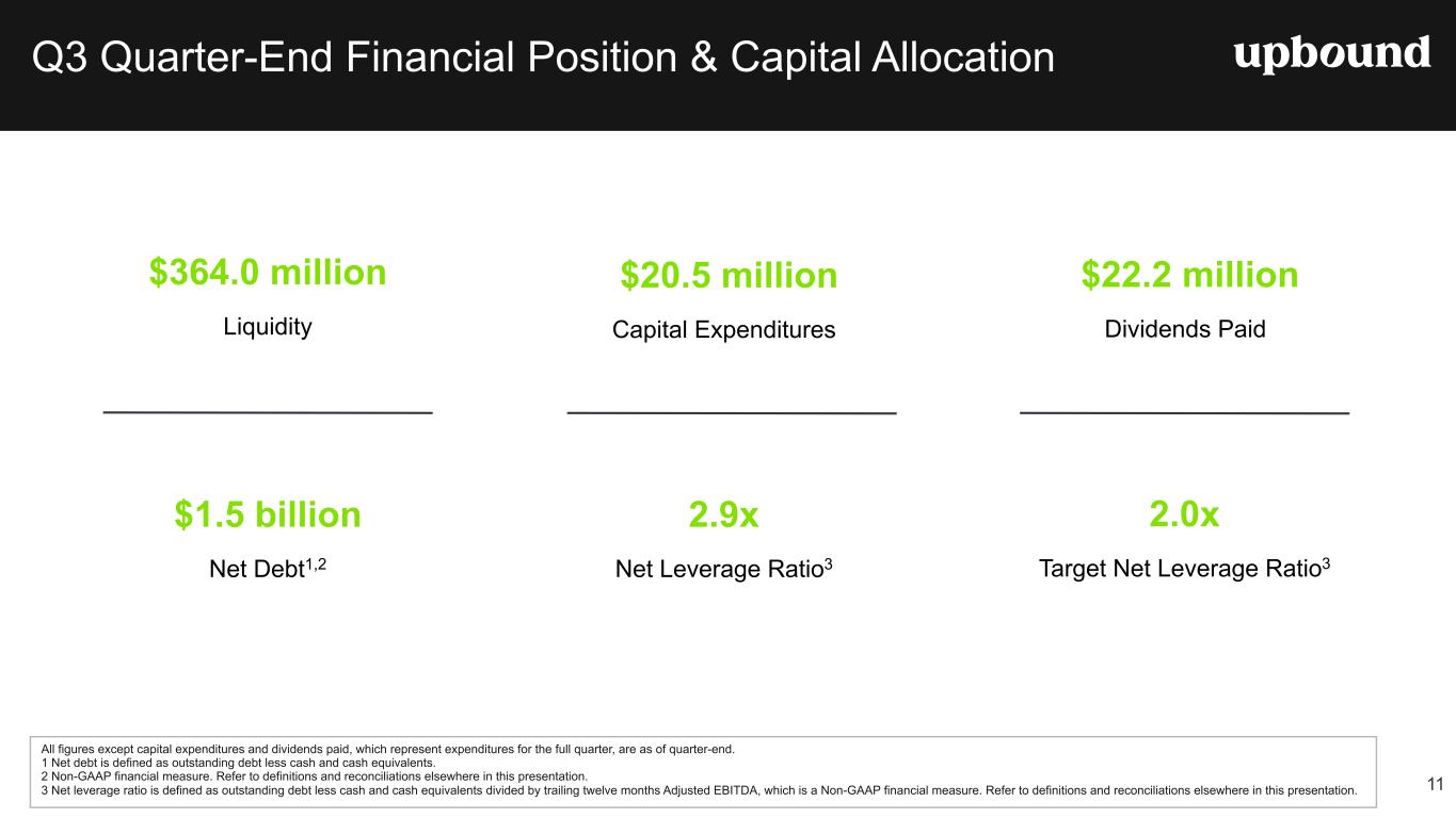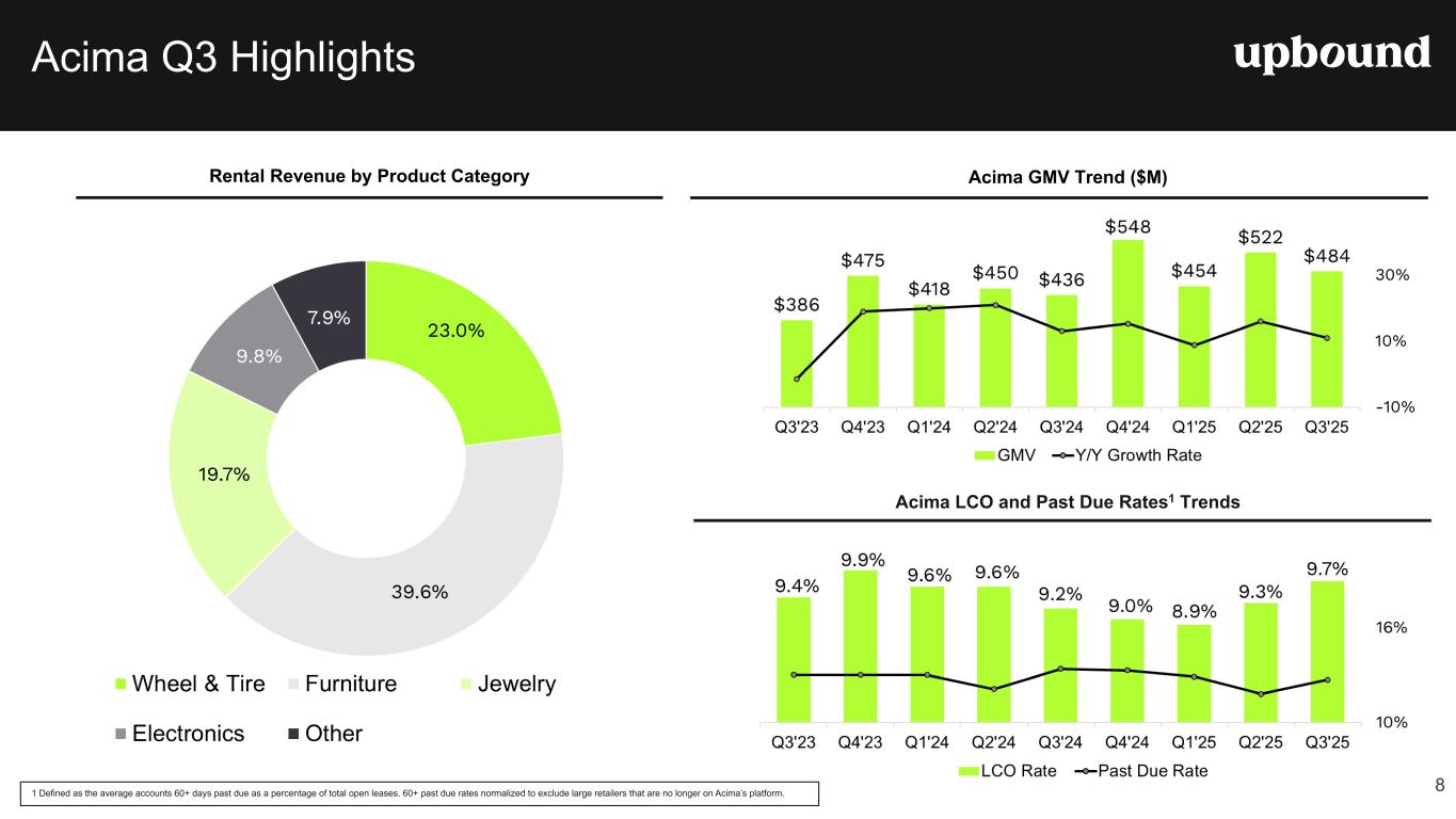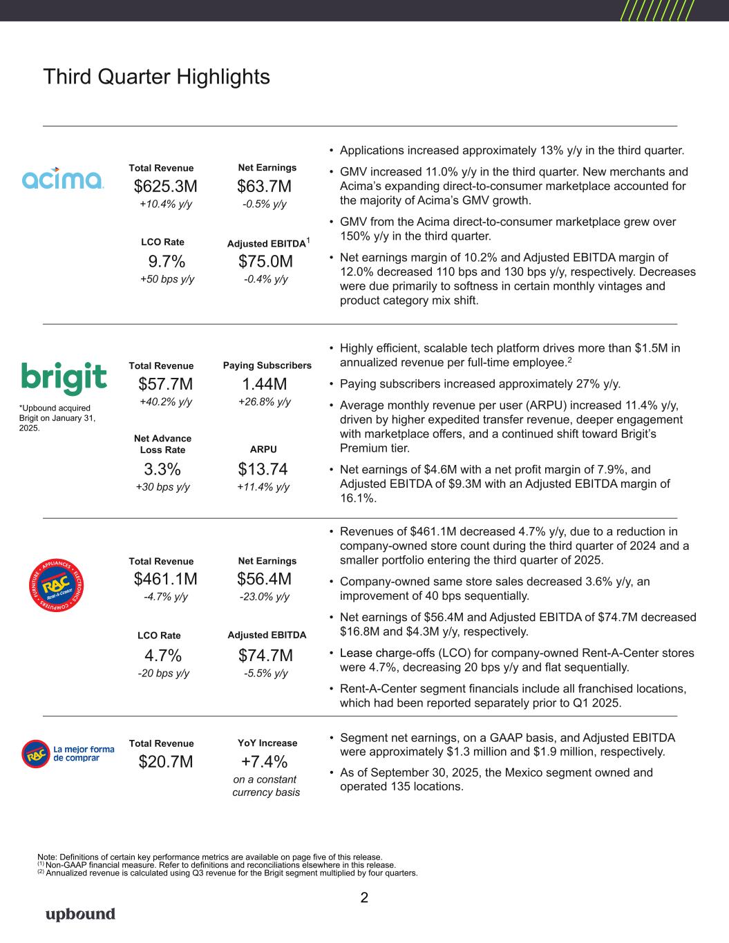 LCO Rate Third Quarter Highlights $625.3M +10.4% y/y Revenue YoY Increase$63.7M -0.5% y/y • Applications increased approximately 13% y/y in the third quarter. • GMV increased 11.0% y/y in the third quarter. New merchants and Acima’s expanding direct-to-consumer marketplace accounted for the majority of Acima’s GMV growth. • GMV from the Acima direct-to-consumer marketplace grew over 150% y/y in the third quarter. • Net earnings margin of 10.2% and Adjusted EBITDA margin of 12.0% decreased 110 bps and 130 bps y/y, respectively. Decreases were due primarily to softness in certain monthly vintages and product category mix shift. Total Revenue Net Earnings 9.7% +50 bps y/y $75.0M -0.4% y/y LCO Rate Adjusted EBITDA1 $461.1M -4.7% y/y Revenue YoY Increase $56.4M -23.0% y/y • Revenues of $461.1M decreased 4.7% y/y, due to a reduction in company-owned store count during the third quarter of 2024 and a smaller portfolio entering the third quarter of 2025. • Company-owned same store sales decreased 3.6% y/y, an improvement of 40 bps sequentially. • Net earnings of $56.4M and Adjusted EBITDA of $74.7M decreased $16.8M and $4.3M y/y, respectively. • Lease charge-offs (LCO) for company-owned Rent-A-Center stores were 4.7%, decreasing 20 bps y/y and flat sequentially. • Rent-A-Center segment financials include all franchised locations, which had been reported separately prior to Q1 2025. Total Revenue Net Earnings 4.7% -20 bps y/y $74.7M -5.5% y/y Adjusted EBITDA $57.7M +40.2% y/y 1.44M +26.8% y/y • Highly efficient, scalable tech platform drives more than $1.5M in annualized revenue per full-time employee.2 • Paying subscribers increased approximately 27% y/y. • Average monthly revenue per user (ARPU) increased 11.4% y/y, driven by higher expedited transfer revenue, deeper engagement with marketplace offers, and a continued shift toward Brigit’s Premium tier. • Net earnings of $4.6M with a net profit margin of 7.9%, and Adjusted EBITDA of $9.3M with an Adjusted EBITDA margin of 16.1%. Total Revenue Paying Subscribers 3.3% +30 bps y/y $13.74 +11.4% y/y Net Advance Loss Rate ARPU $20.7M +7.4% on a constant currency basis • Segment net earnings, on a GAAP basis, and Adjusted EBITDA were approximately $1.3 million and $1.9 million, respectively. • As of September 30, 2025, the Mexico segment owned and operated 135 locations. Total Revenue YoY Increase 2 Note: Definitions of certain key performance metrics are available on page five of this release. (1) Non-GAAP financial measure. Refer to definitions and reconciliations elsewhere in this release. (2) Annualized revenue is calculated using Q3 revenue for the Brigit segment multiplied by four quarters. *Upbound acquired Brigit on January 31, 2025.