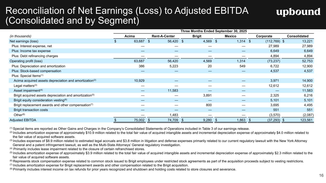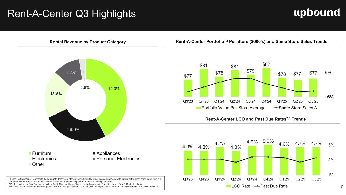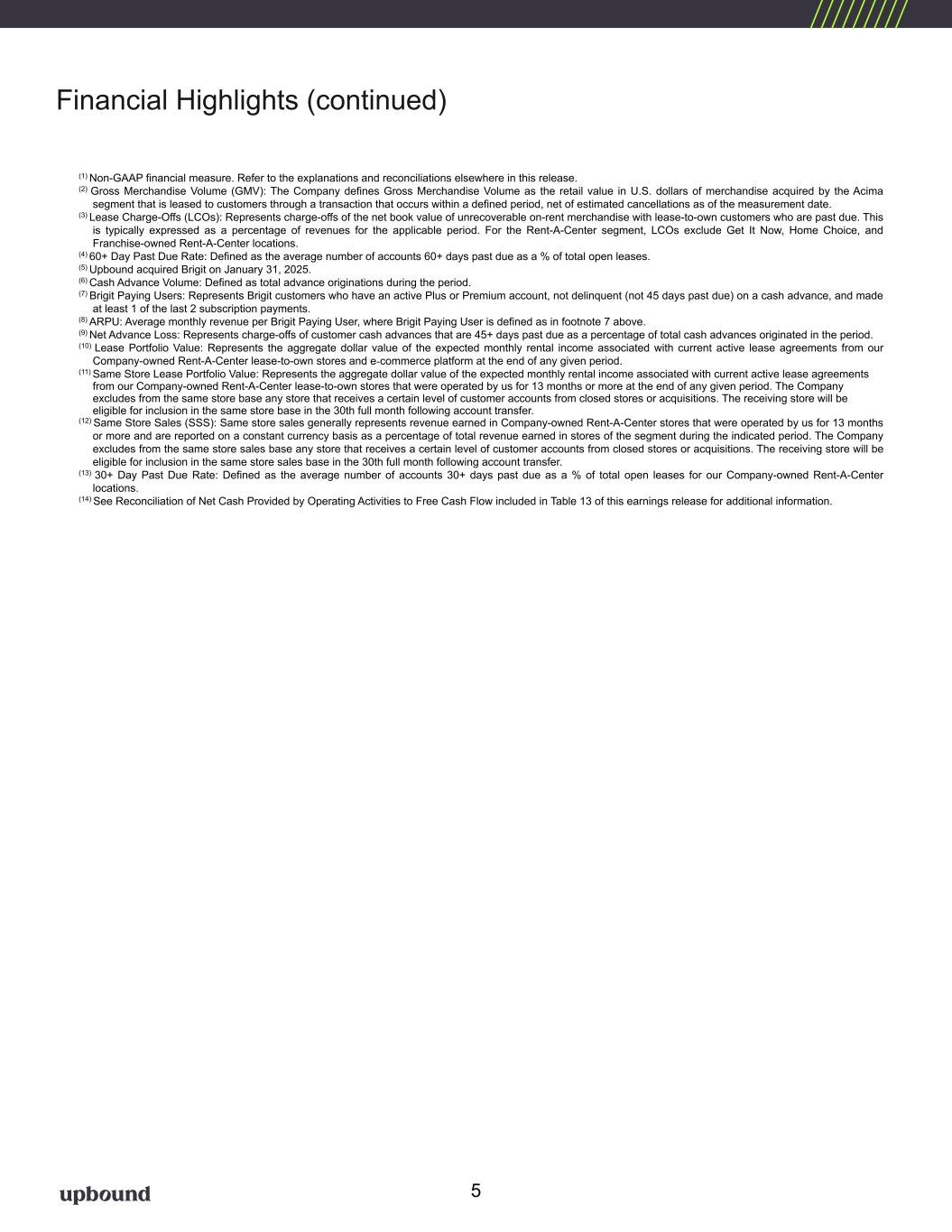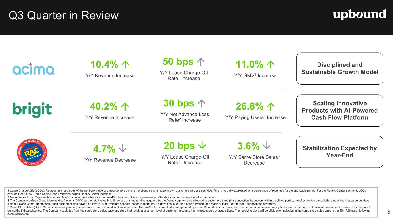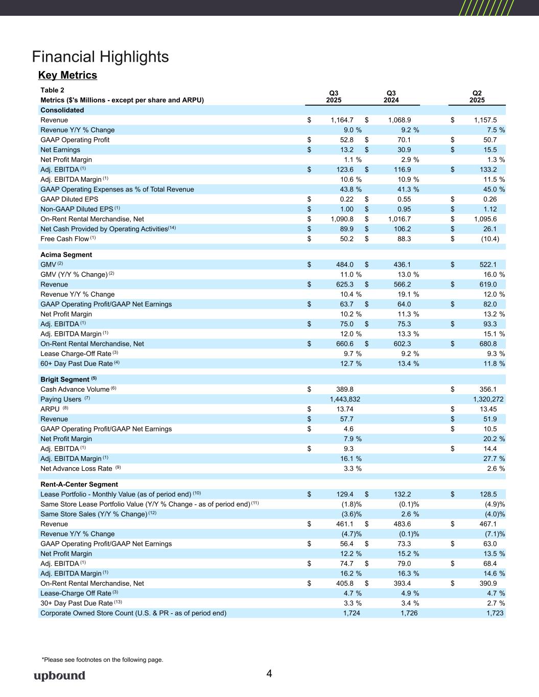 Table 2 Q3 2025 Q3 2024 Q2 2025Metrics ($'s Millions - except per share and ARPU) Consolidated Revenue $ 1,164.7 $ 1,068.9 $ 1,157.5 Revenue Y/Y % Change 9.0 % 9.2 % 7.5 % GAAP Operating Profit $ 52.8 $ 70.1 $ 50.7 Net Earnings $ 13.2 $ 30.9 $ 15.5 Net Profit Margin 1.1 % 2.9 % 1.3 % Adj. EBITDA (1) $ 123.6 $ 116.9 $ 133.2 Adj. EBITDA Margin (1) 10.6 % 10.9 % 11.5 % GAAP Operating Expenses as % of Total Revenue 43.8 % 41.3 % 45.0 % GAAP Diluted EPS $ 0.22 $ 0.55 $ 0.26 Non-GAAP Diluted EPS (1) $ 1.00 $ 0.95 $ 1.12 On-Rent Rental Merchandise, Net $ 1,090.8 $ 1,016.7 $ 1,095.6 Net Cash Provided by Operating Activities(14) $ 89.9 $ 106.2 $ 26.1 Free Cash Flow (1) $ 50.2 $ 88.3 $ (10.4) Acima Segment GMV (2) $ 484.0 $ 436.1 $ 522.1 GMV (Y/Y % Change) (2) 11.0 % 13.0 % 16.0 % Revenue $ 625.3 $ 566.2 $ 619.0 Revenue Y/Y % Change 10.4 % 19.1 % 12.0 % GAAP Operating Profit/GAAP Net Earnings $ 63.7 $ 64.0 $ 82.0 Net Profit Margin 10.2 % 11.3 % 13.2 % Adj. EBITDA (1) $ 75.0 $ 75.3 $ 93.3 Adj. EBITDA Margin (1) 12.0 % 13.3 % 15.1 % On-Rent Rental Merchandise, Net $ 660.6 $ 602.3 $ 680.8 Lease Charge-Off Rate (3) 9.7 % 9.2 % 9.3 % 60+ Day Past Due Rate (4) 12.7 % 13.4 % 11.8 % Brigit Segment (5) Cash Advance Volume (6) $ 389.8 $ 356.1 Paying Users (7) 1,443,832 1,320,272 ARPU (8) $ 13.74 $ 13.45 Revenue $ 57.7 $ 51.9 GAAP Operating Profit/GAAP Net Earnings $ 4.6 $ 10.5 Net Profit Margin 7.9 % 20.2 % Adj. EBITDA (1) $ 9.3 $ 14.4 Adj. EBITDA Margin (1) 16.1 % 27.7 % Net Advance Loss Rate (9) 3.3 % 2.6 % Rent-A-Center Segment Lease Portfolio - Monthly Value (as of period end) (10) $ 129.4 $ 132.2 $ 128.5 Same Store Lease Portfolio Value (Y/Y % Change - as of period end) (11) (1.8) % (0.1) % (4.9) % Same Store Sales (Y/Y % Change) (12) (3.6) % 2.6 % (4.0) % Revenue $ 461.1 $ 483.6 $ 467.1 Revenue Y/Y % Change (4.7) % (0.1) % (7.1) % GAAP Operating Profit/GAAP Net Earnings $ 56.4 $ 73.3 $ 63.0 Net Profit Margin 12.2 % 15.2 % 13.5 % Adj. EBITDA (1) $ 74.7 $ 79.0 $ 68.4 Adj. EBITDA Margin (1) 16.2 % 16.3 % 14.6 % On-Rent Rental Merchandise, Net $ 405.8 $ 393.4 $ 390.9 Lease-Charge Off Rate (3) 4.7 % 4.9 % 4.7 % 30+ Day Past Due Rate (13) 3.3 % 3.4 % 2.7 % Corporate Owned Store Count (U.S. & PR - as of period end) 1,724 1,726 1,723 Financial Highlights *Please see footnotes on the following page. Key Metrics 4