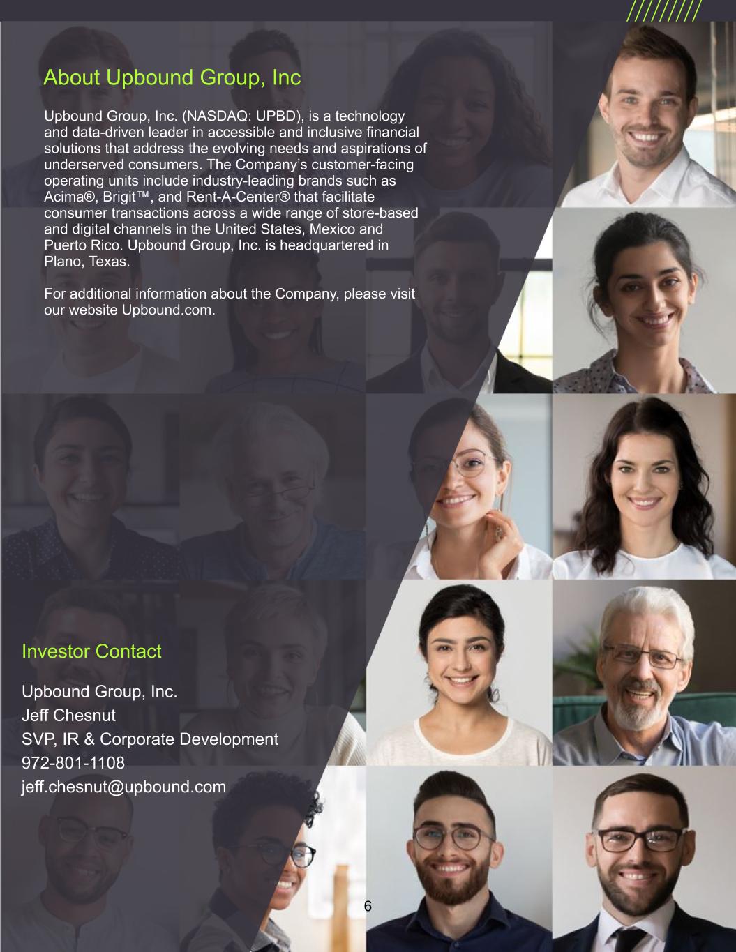 About Upbound Group, Inc Upbound Group, Inc. (NASDAQ: UPBD), is a technology and data-driven leader in accessible and inclusive financial solutions that address the evolving needs and aspirations of underserved consumers. The Company’s customer-facing operating units include industry-leading brands such as Acima®, Brigit™, and Rent-A-Center® that facilitate consumer transactions across a wide range of store-based and digital channels in the United States, Mexico and Puerto Rico. Upbound Group, Inc. is headquartered in Plano, Texas. For additional information about the Company, please visit our website Upbound.com. Investor Contact Upbound Group, Inc. Jeff Chesnut SVP, IR & Corporate Development 972-801-1108 jeff.chesnut@upbound.com 6