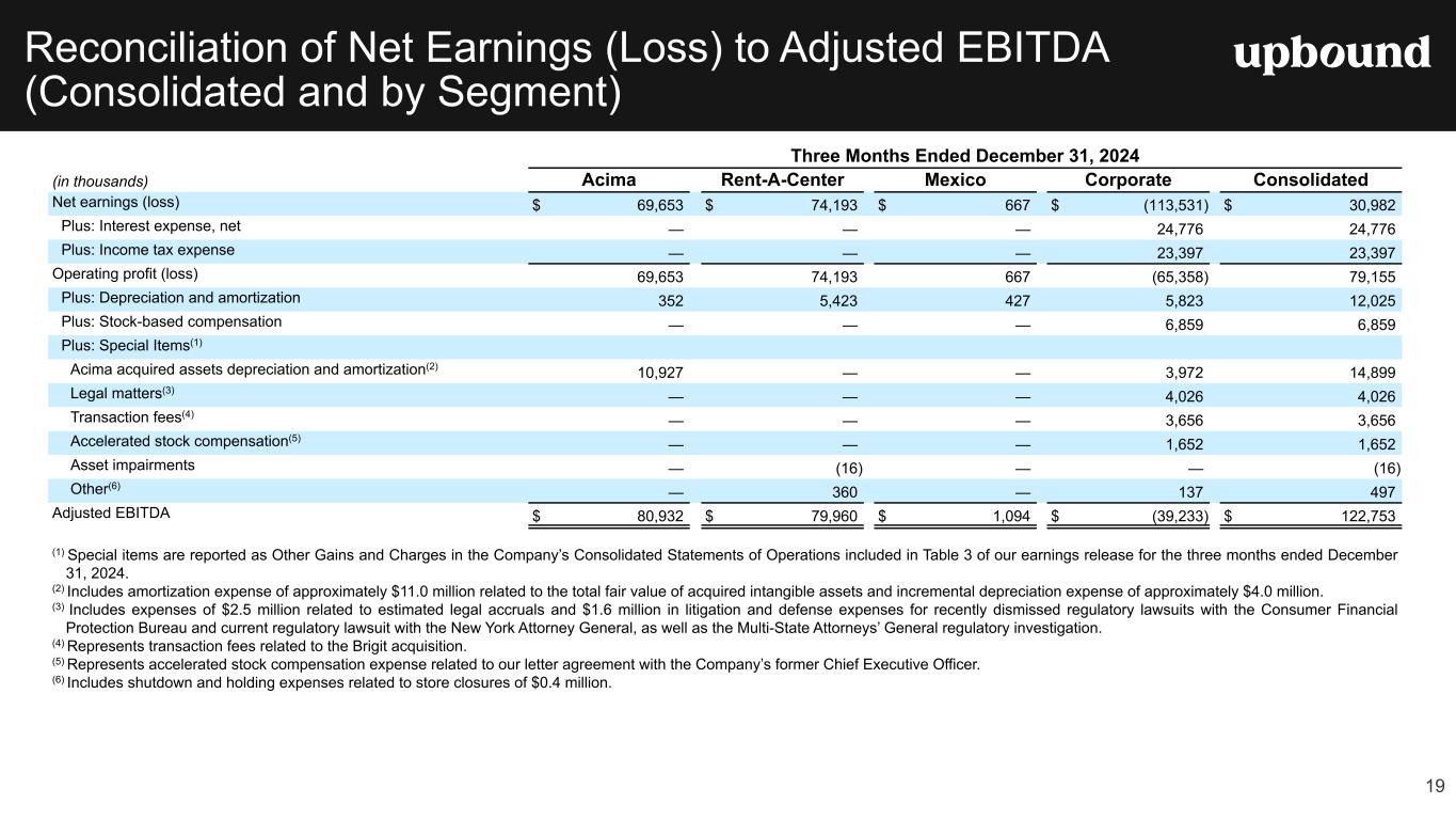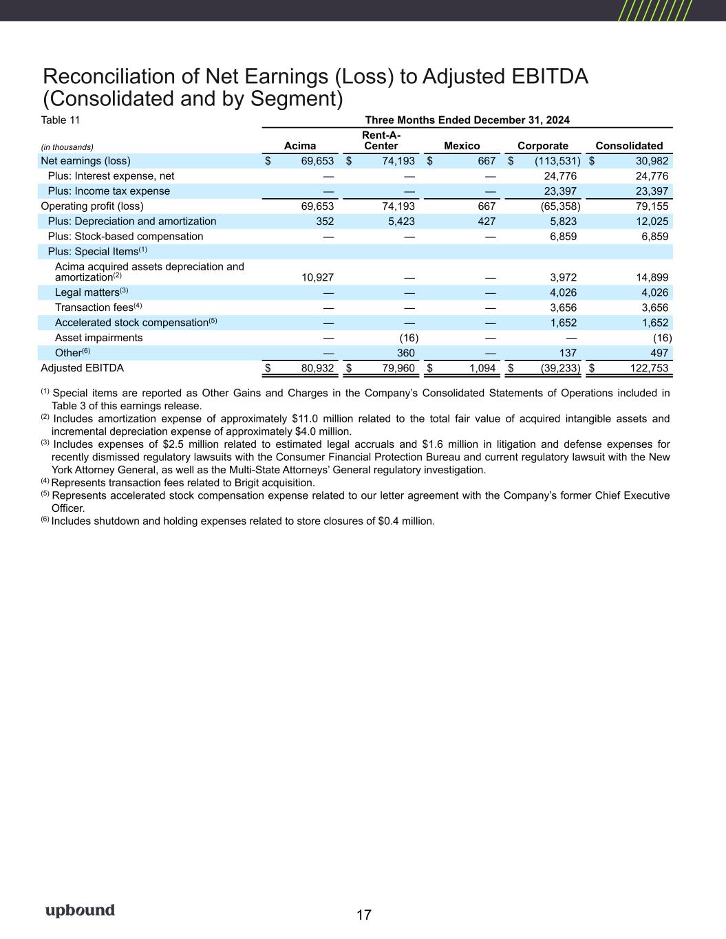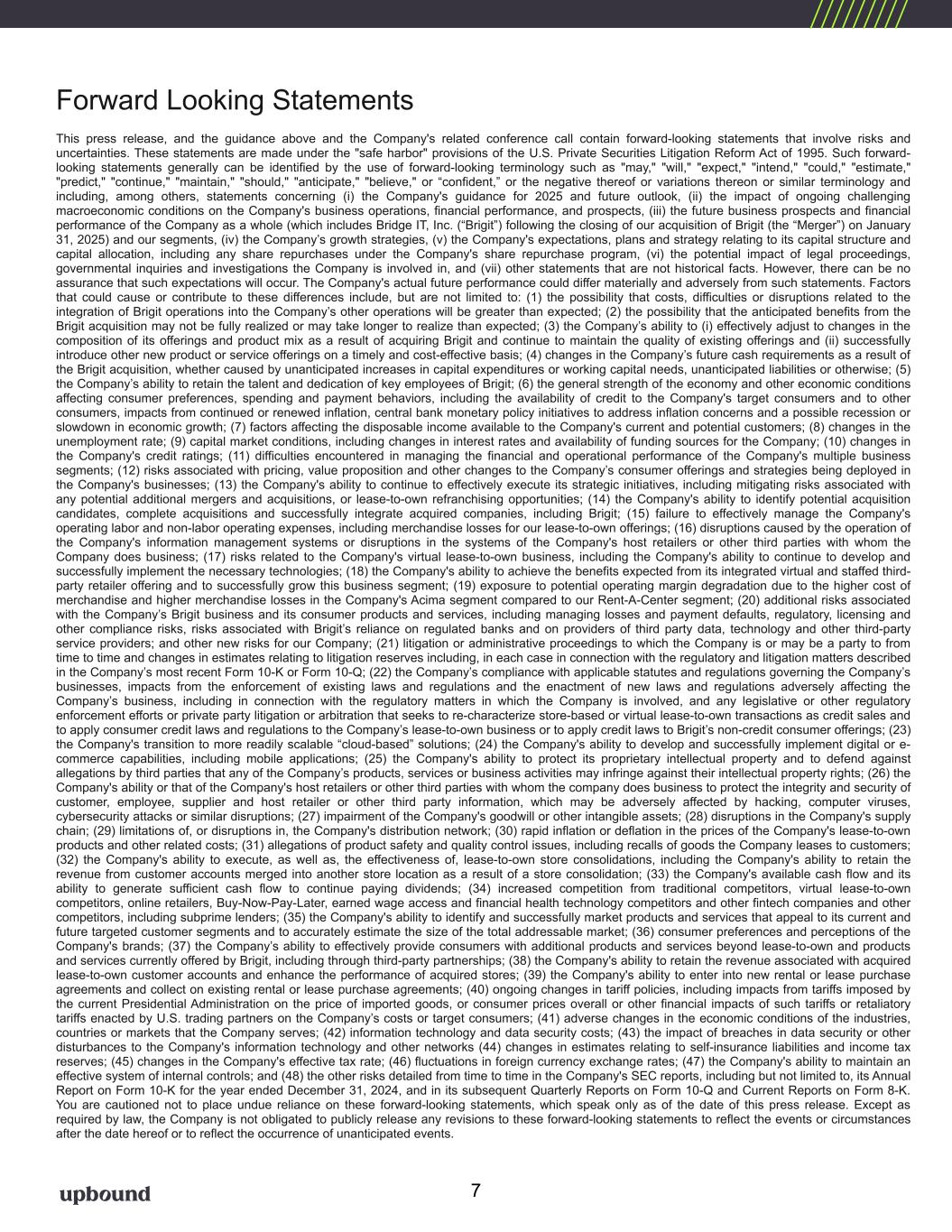 Forward Looking Statements This press release, and the guidance above and the Company's related conference call contain forward-looking statements that involve risks and uncertainties. These statements are made under the "safe harbor" provisions of the U.S. Private Securities Litigation Reform Act of 1995. Such forward- looking statements generally can be identified by the use of forward-looking terminology such as "may," "will," "expect," "intend," "could," "estimate," "predict," "continue," "maintain," "should," "anticipate," "believe," or “confident,” or the negative thereof or variations thereon or similar terminology and including, among others, statements concerning (i) the Company's guidance for 2025 and future outlook, (ii) the impact of ongoing challenging macroeconomic conditions on the Company's business operations, financial performance, and prospects, (iii) the future business prospects and financial performance of the Company as a whole (which includes Bridge IT, Inc. (“Brigit”) following the closing of our acquisition of Brigit (the “Merger”) on January 31, 2025) and our segments, (iv) the Company’s growth strategies, (v) the Company's expectations, plans and strategy relating to its capital structure and capital allocation, including any share repurchases under the Company's share repurchase program, (vi) the potential impact of legal proceedings, governmental inquiries and investigations the Company is involved in, and (vii) other statements that are not historical facts. However, there can be no assurance that such expectations will occur. The Company's actual future performance could differ materially and adversely from such statements. Factors that could cause or contribute to these differences include, but are not limited to: (1) the possibility that costs, difficulties or disruptions related to the integration of Brigit operations into the Company’s other operations will be greater than expected; (2) the possibility that the anticipated benefits from the Brigit acquisition may not be fully realized or may take longer to realize than expected; (3) the Company’s ability to (i) effectively adjust to changes in the composition of its offerings and product mix as a result of acquiring Brigit and continue to maintain the quality of existing offerings and (ii) successfully introduce other new product or service offerings on a timely and cost-effective basis; (4) changes in the Company’s future cash requirements as a result of the Brigit acquisition, whether caused by unanticipated increases in capital expenditures or working capital needs, unanticipated liabilities or otherwise; (5) the Company’s ability to retain the talent and dedication of key employees of Brigit; (6) the general strength of the economy and other economic conditions affecting consumer preferences, spending and payment behaviors, including the availability of credit to the Company's target consumers and to other consumers, impacts from continued or renewed inflation, central bank monetary policy initiatives to address inflation concerns and a possible recession or slowdown in economic growth; (7) factors affecting the disposable income available to the Company's current and potential customers; (8) changes in the unemployment rate; (9) capital market conditions, including changes in interest rates and availability of funding sources for the Company; (10) changes in the Company's credit ratings; (11) difficulties encountered in managing the financial and operational performance of the Company's multiple business segments; (12) risks associated with pricing, value proposition and other changes to the Company’s consumer offerings and strategies being deployed in the Company's businesses; (13) the Company's ability to continue to effectively execute its strategic initiatives, including mitigating risks associated with any potential additional mergers and acquisitions, or lease-to-own refranchising opportunities; (14) the Company's ability to identify potential acquisition candidates, complete acquisitions and successfully integrate acquired companies, including Brigit; (15) failure to effectively manage the Company's operating labor and non-labor operating expenses, including merchandise losses for our lease-to-own offerings; (16) disruptions caused by the operation of the Company's information management systems or disruptions in the systems of the Company's host retailers or other third parties with whom the Company does business; (17) risks related to the Company's virtual lease-to-own business, including the Company's ability to continue to develop and successfully implement the necessary technologies; (18) the Company's ability to achieve the benefits expected from its integrated virtual and staffed third- party retailer offering and to successfully grow this business segment; (19) exposure to potential operating margin degradation due to the higher cost of merchandise and higher merchandise losses in the Company's Acima segment compared to our Rent-A-Center segment; (20) additional risks associated with the Company’s Brigit business and its consumer products and services, including managing losses and payment defaults, regulatory, licensing and other compliance risks, risks associated with Brigit’s reliance on regulated banks and on providers of third party data, technology and other third-party service providers; and other new risks for our Company; (21) litigation or administrative proceedings to which the Company is or may be a party to from time to time and changes in estimates relating to litigation reserves including, in each case in connection with the regulatory and litigation matters described in the Company’s most recent Form 10-K or Form 10-Q; (22) the Company’s compliance with applicable statutes and regulations governing the Company’s businesses, impacts from the enforcement of existing laws and regulations and the enactment of new laws and regulations adv