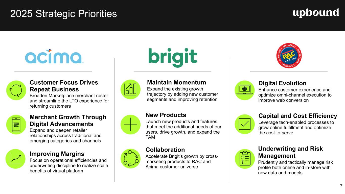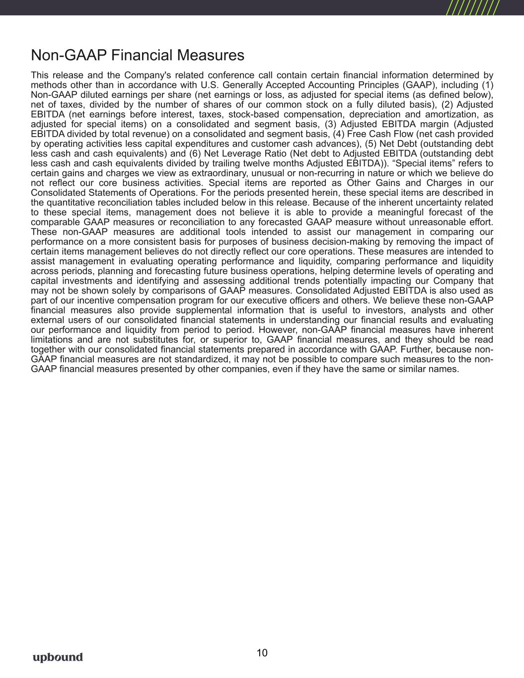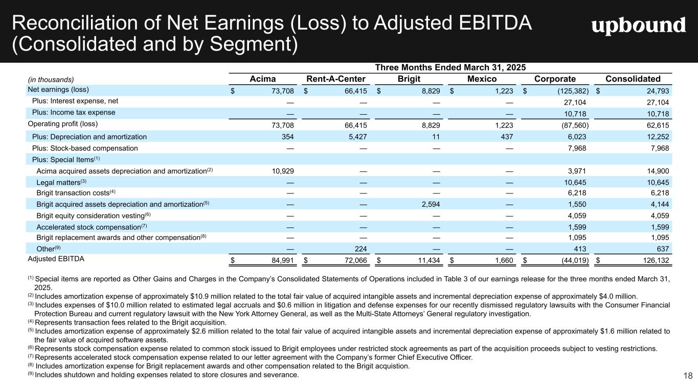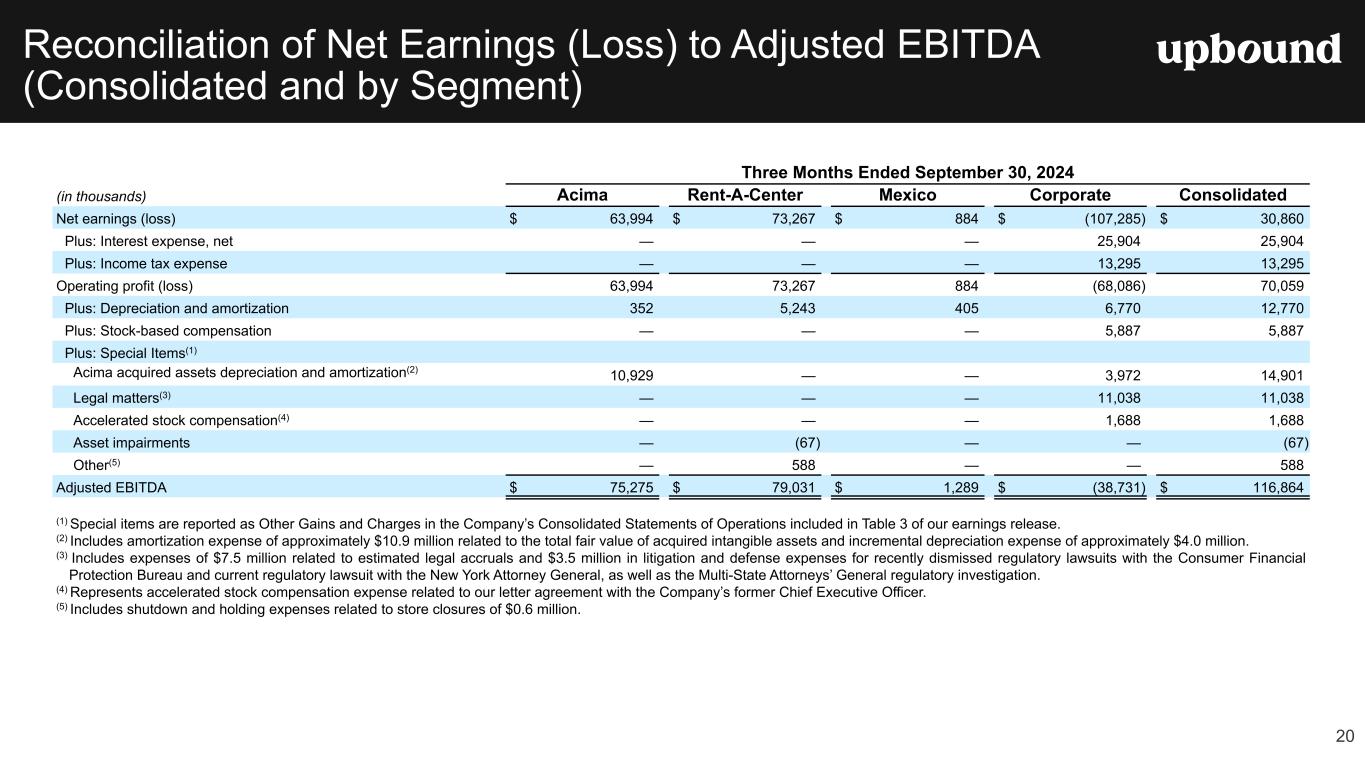 Forward Looking Statements This press release, and the guidance above and the Company's related conference call contain forward-looking statements that involve risks and uncertainties. These statements are made under the "safe harbor" provisions of the U.S. Private Securities Litigation Reform Act of 1995. Such forward- looking statements generally can be identified by the use of forward-looking terminology such as "may," "will," "expect," "intend," "could," "estimate," "predict," "continue," "maintain," "should," "anticipate," "believe," or “confident,” or the negative thereof or variations thereon or similar terminology and including, among others, statements concerning (i) the Company's guidance for 2025 and future outlook, (ii) the impact of ongoing challenging macroeconomic conditions on the Company's business operations, financial performance, and prospects, (iii) the future business prospects and financial performance of the Company as a whole (which includes Bridge IT, Inc. (“Brigit”) following the closing of our acquisition of Brigit (the “Merger”) on January 31, 2025) and our segments, (iv) the Company’s growth strategies, (v) the Company's expectations, plans and strategy relating to its capital structure and capital allocation, including any share repurchases under the Company's share repurchase program, (vi) the potential impact of legal proceedings, governmental inquiries and investigations the Company is involved in, and (vii) other statements that are not historical facts. However, there can be no assurance that such expectations will occur. The Company's actual future performance could differ materially and adversely from such statements. Factors that could cause or contribute to these differences include, but are not limited to: (1) the possibility that costs, difficulties or disruptions related to the integration of Brigit operations into the Company’s other operations will be greater than expected; (2) the possibility that the anticipated benefits from the Brigit acquisition may not be fully realized or may take longer to realize than expected; (3) the Company’s ability to (i) effectively adjust to changes in the composition of its offerings and product mix as a result of acquiring Brigit and continue to maintain the quality of existing offerings and (ii) successfully introduce other new product or service offerings on a timely and cost-effective basis; (4) changes in the Company’s future cash requirements as a result of the Brigit acquisition, whether caused by unanticipated increases in capital expenditures or working capital needs, unanticipated liabilities or otherwise; (5) the Company’s ability to retain the talent and dedication of key employees of Brigit; (6) the general strength of the economy and other economic conditions affecting consumer preferences, spending and payment behaviors, including the availability of credit to the Company's target consumers and to other consumers, impacts from continued or renewed inflation, central bank monetary policy initiatives to address inflation concerns and a possible recession or slowdown in economic growth; (7) factors affecting the disposable income available to the Company's current and potential customers; (8) changes in the unemployment rate; (9) capital market conditions, including changes in interest rates and availability of funding sources for the Company; (10) changes in the Company's credit ratings; (11) difficulties encountered in managing the financial and operational performance of the Company's multiple business segments; (12) risks associated with pricing, value proposition and other changes to the Company’s consumer offerings and strategies being deployed in the Company's businesses; (13) the Company's ability to continue to effectively execute its strategic initiatives, including mitigating risks associated with any potential additional mergers and acquisitions, or lease-to-own refranchising opportunities; (14) the Company's ability to identify potential acquisition candidates, complete acquisitions and successfully integrate acquired companies, including Brigit; (15) failure to effectively manage the Company's operating labor and non-labor operating expenses, including merchandise losses for our lease-to-own offerings; (16) disruptions caused by the operation of the Company's information management systems or disruptions in the systems of the Company's host retailers or other third parties with whom the Company does business; (17) risks related to the Company's virtual lease-to-own business, including the Company's ability to continue to develop and successfully implement the necessary technologies; (18) the Company's ability to achieve the benefits expected from its integrated virtual and staffed third- party retailer offering and to successfully grow this business segment; (19) exposure to potential operating margin degradation due to the higher cost of merchandise and higher merchandise losses in the Company's Acima segment compared to our Rent-A-Center segment; (20) additional risks associated with the Company’s Brigit business and its consumer products and services, including managing losses and payment defaults, regulatory, licensing and other compliance risks, risks associated with Brigit’s reliance on regulated banks and on providers of third party data, technology and other third-party service providers; and other new risks for our Company; (21) litigation or administrative proceedings to which the Company is or may be a party to from time to time and changes in estimates relating to litigation reserves including, in each case in connection with the regulatory and litigation matters described in the Company’s most recent Form 10-K or Form 10-Q; (22) the Company’s compliance with applicable statutes and regulations governing the Company’s businesses, impacts from the enforcement of existing laws and regulations and the enactment of new laws and regulations adv