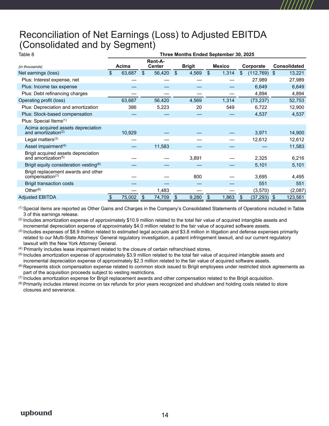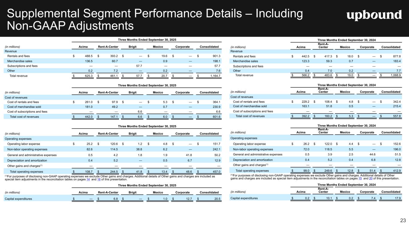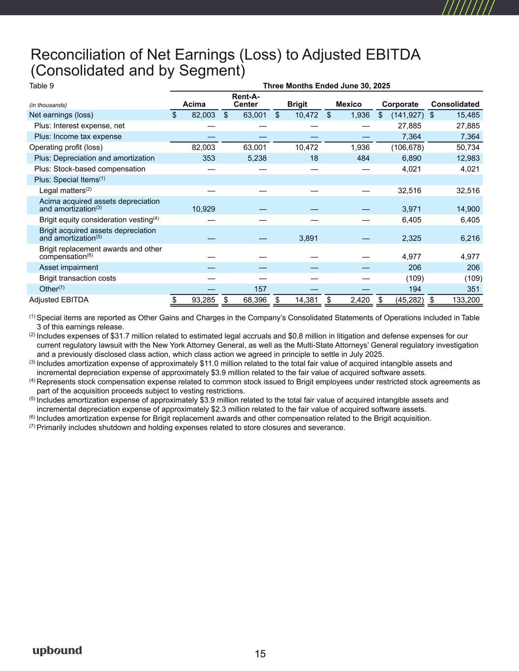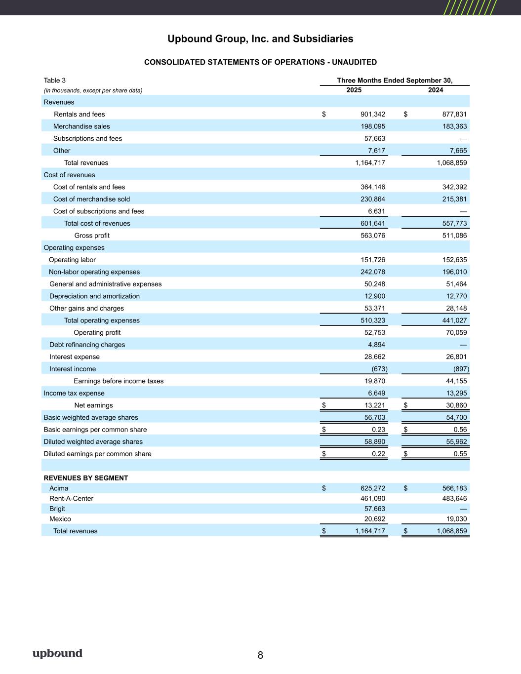 Upbound Group, Inc. and Subsidiaries CONSOLIDATED STATEMENTS OF OPERATIONS - UNAUDITED Table 3 Three Months Ended September 30, (in thousands, except per share data) 2025 2024 Revenues Rentals and fees $ 901,342 $ 877,831 Merchandise sales 198,095 183,363 Subscriptions and fees 57,663 — Other 7,617 7,665 Total revenues 1,164,717 1,068,859 Cost of revenues Cost of rentals and fees 364,146 342,392 Cost of merchandise sold 230,864 215,381 Cost of subscriptions and fees 6,631 — Total cost of revenues 601,641 557,773 Gross profit 563,076 511,086 Operating expenses Operating labor 151,726 152,635 Non-labor operating expenses 242,078 196,010 General and administrative expenses 50,248 51,464 Depreciation and amortization 12,900 12,770 Other gains and charges 53,371 28,148 Total operating expenses 510,323 441,027 Operating profit 52,753 70,059 Debt refinancing charges 4,894 — Interest expense 28,662 26,801 Interest income (673) (897) Earnings before income taxes 19,870 44,155 Income tax expense 6,649 13,295 Net earnings $ 13,221 $ 30,860 Basic weighted average shares 56,703 54,700 Basic earnings per common share $ 0.23 $ 0.56 Diluted weighted average shares 58,890 55,962 Diluted earnings per common share $ 0.22 $ 0.55 REVENUES BY SEGMENT Acima $ 625,272 $ 566,183 Rent-A-Center 461,090 483,646 Brigit 57,663 — Mexico 20,692 19,030 Total revenues $ 1,164,717 $ 1,068,859 8
