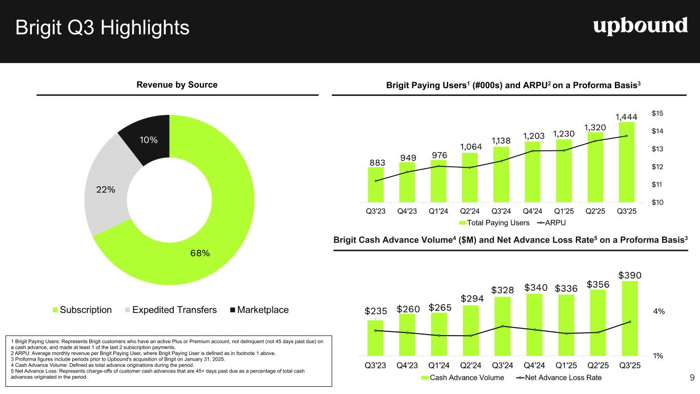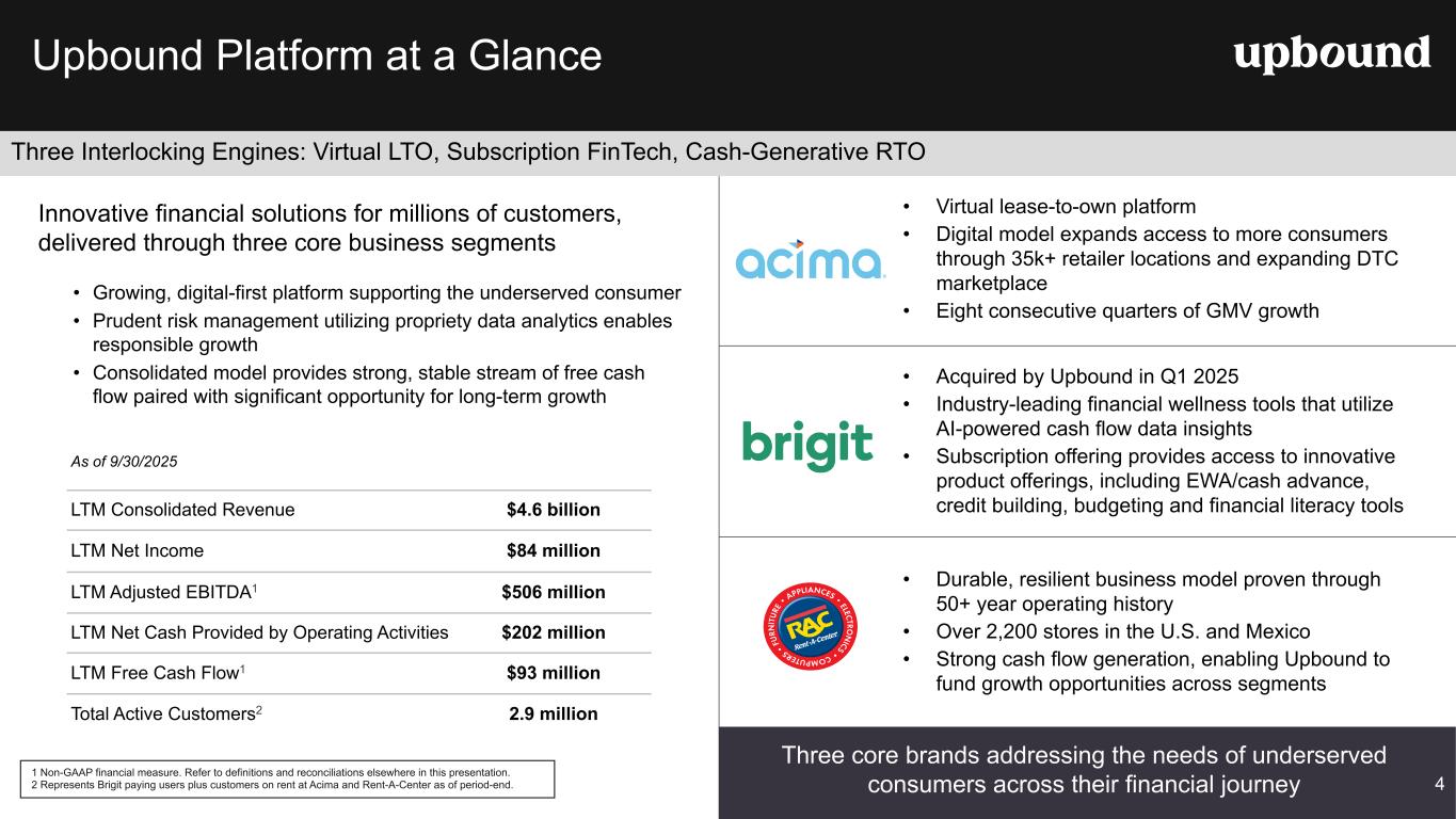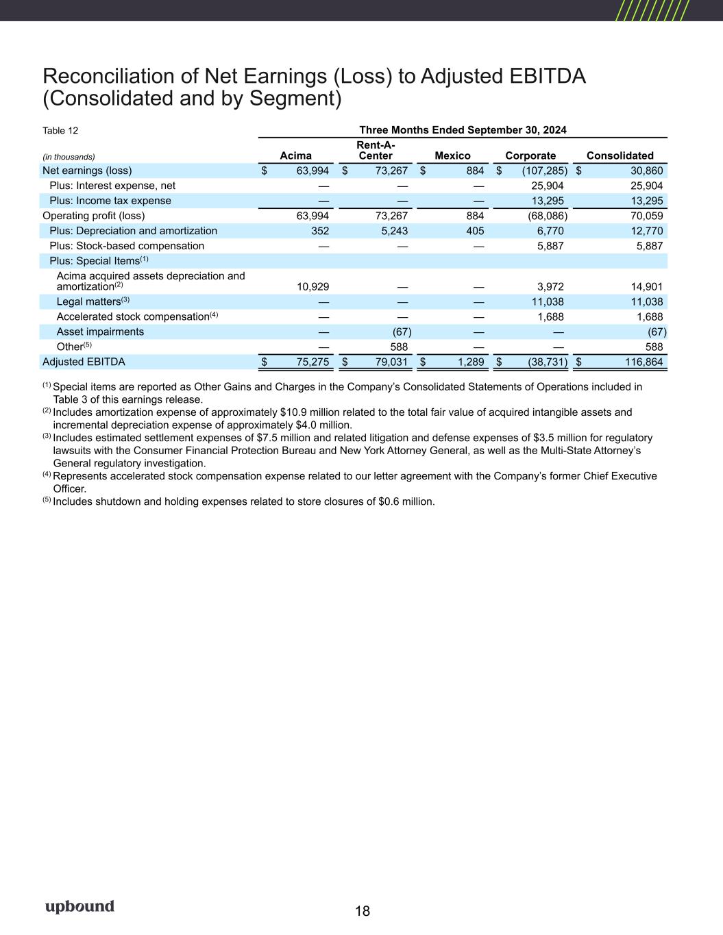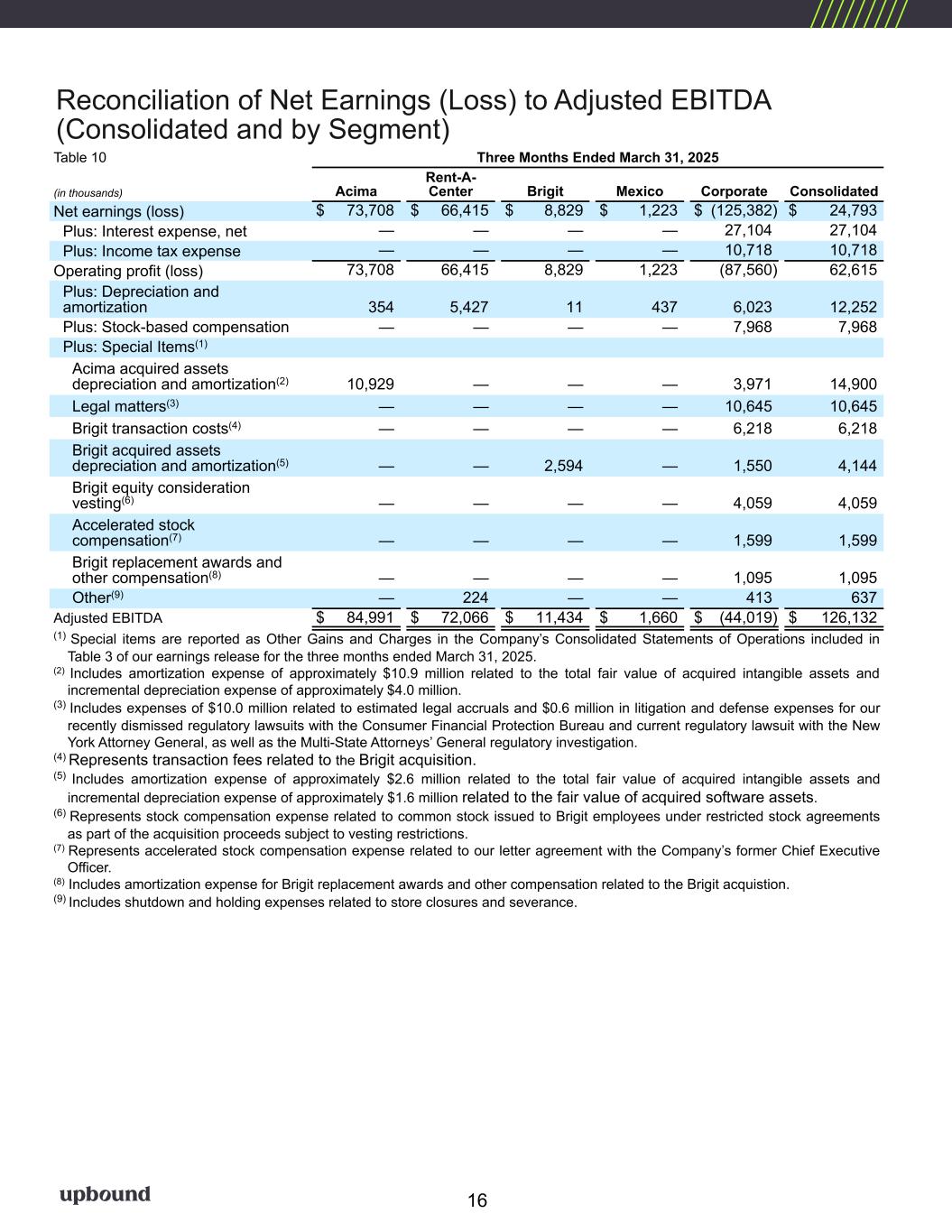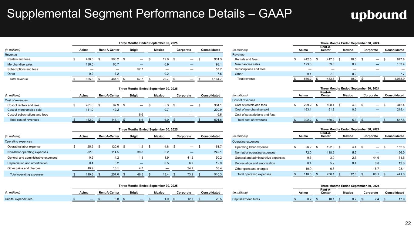 Upbound Group, Inc. and Subsidiaries CONSOLIDATED STATEMENTS OF OPERATIONS - UNAUDITED Table 3 Three Months Ended September 30, (in thousands, except per share data) 2025 2024 Revenues Rentals and fees $ 901,342 $ 877,831 Merchandise sales 198,095 183,363 Subscriptions and fees 57,663 — Other 7,617 7,665 Total revenues 1,164,717 1,068,859 Cost of revenues Cost of rentals and fees 364,146 342,392 Cost of merchandise sold 230,864 215,381 Cost of subscriptions and fees 6,631 — Total cost of revenues 601,641 557,773 Gross profit 563,076 511,086 Operating expenses Operating labor 151,726 152,635 Non-labor operating expenses 242,078 196,010 General and administrative expenses 50,248 51,464 Depreciation and amortization 12,900 12,770 Other gains and charges 53,371 28,148 Total operating expenses 510,323 441,027 Operating profit 52,753 70,059 Debt refinancing charges 4,894 — Interest expense 28,662 26,801 Interest income (673) (897) Earnings before income taxes 19,870 44,155 Income tax expense 6,649 13,295 Net earnings $ 13,221 $ 30,860 Basic weighted average shares 56,703 54,700 Basic earnings per common share $ 0.23 $ 0.56 Diluted weighted average shares 58,890 55,962 Diluted earnings per common share $ 0.22 $ 0.55 REVENUES BY SEGMENT Acima $ 625,272 $ 566,183 Rent-A-Center 461,090 483,646 Brigit 57,663 — Mexico 20,692 19,030 Total revenues $ 1,164,717 $ 1,068,859 8