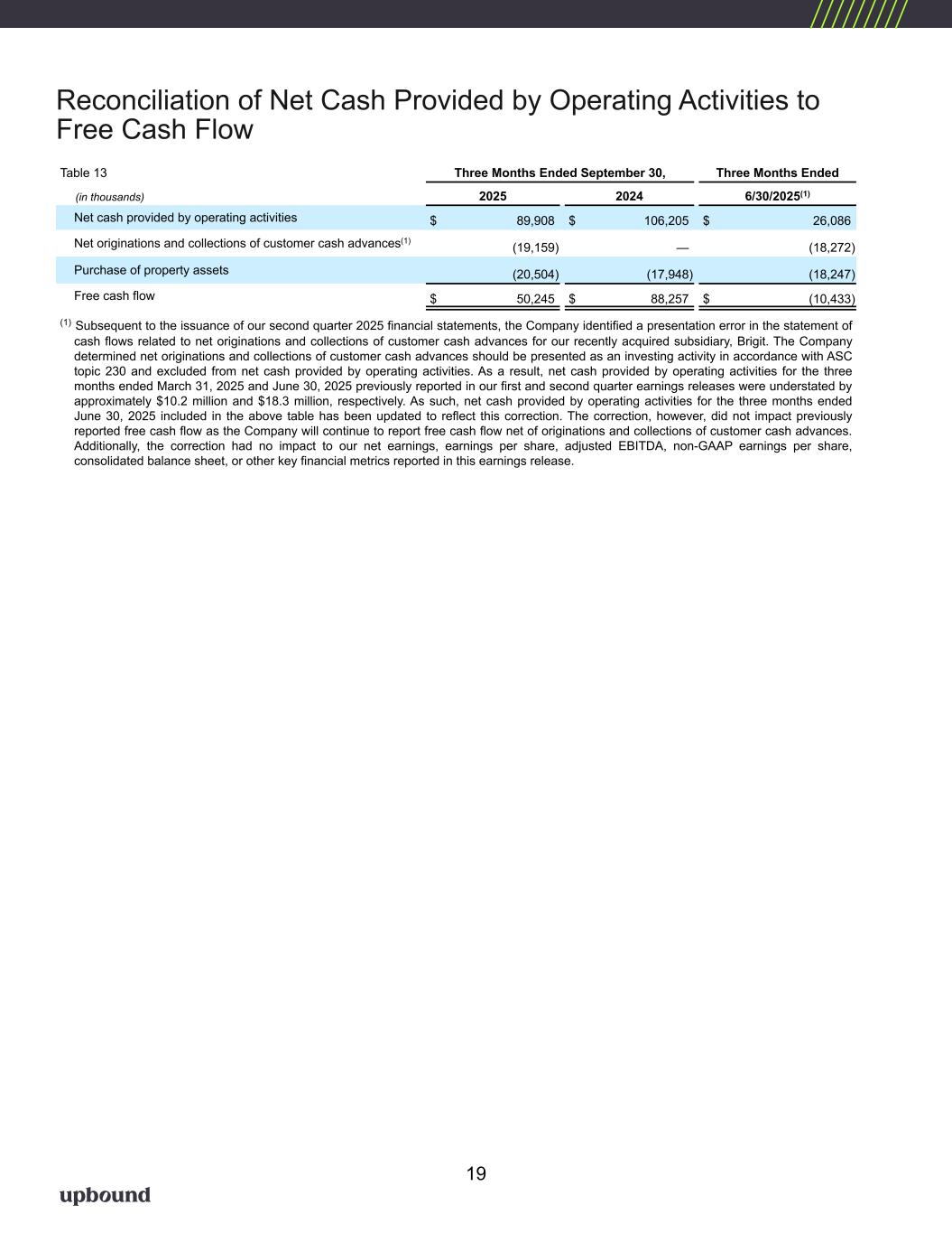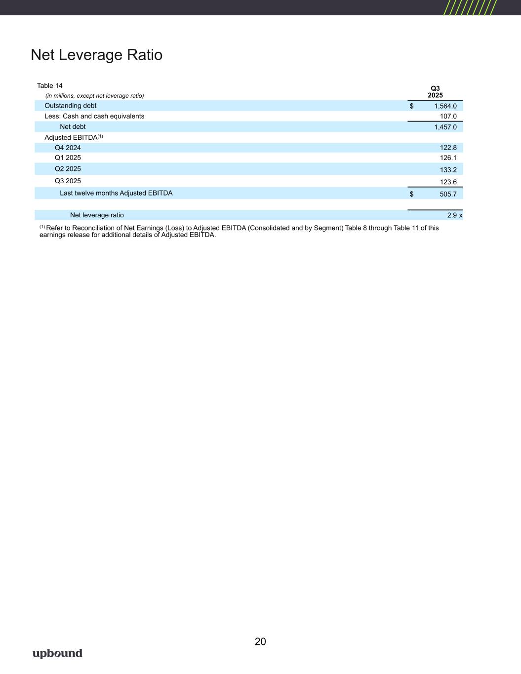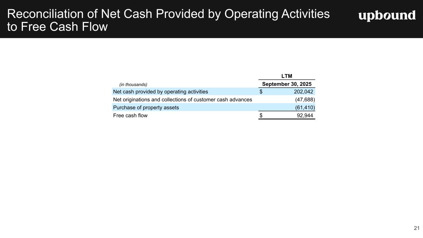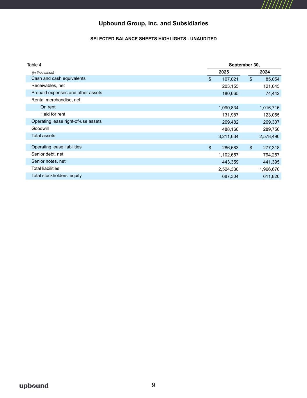Upbound Group, Inc. and Subsidiaries SELECTED BALANCE SHEETS HIGHLIGHTS - UNAUDITED Table 4 September 30, (in thousands) 2025 2024 Cash and cash equivalents $ 107,021 $ 85,054 Receivables, net 203,155 121,645 Prepaid expenses and other assets 180,665 74,442 Rental merchandise, net On rent 1,090,834 1,016,716 Held for rent 131,987 123,055 Operating lease right-of-use assets 269,482 269,307 Goodwill 488,160 289,750 Total assets 3,211,634 2,578,490 Operating lease liabilities $ 286,683 $ 277,318 Senior debt, net 1,102,657 794,257 Senior notes, net 443,359 441,395 Total liabilities 2,524,330 1,966,670 Total stockholders’ equity 687,304 611,820 9