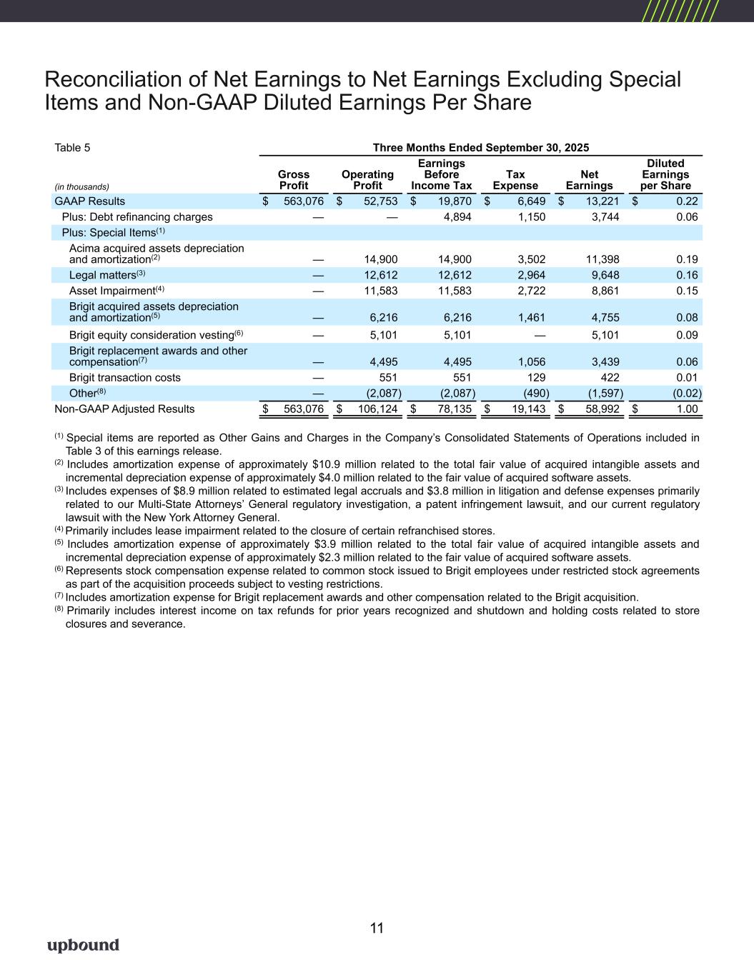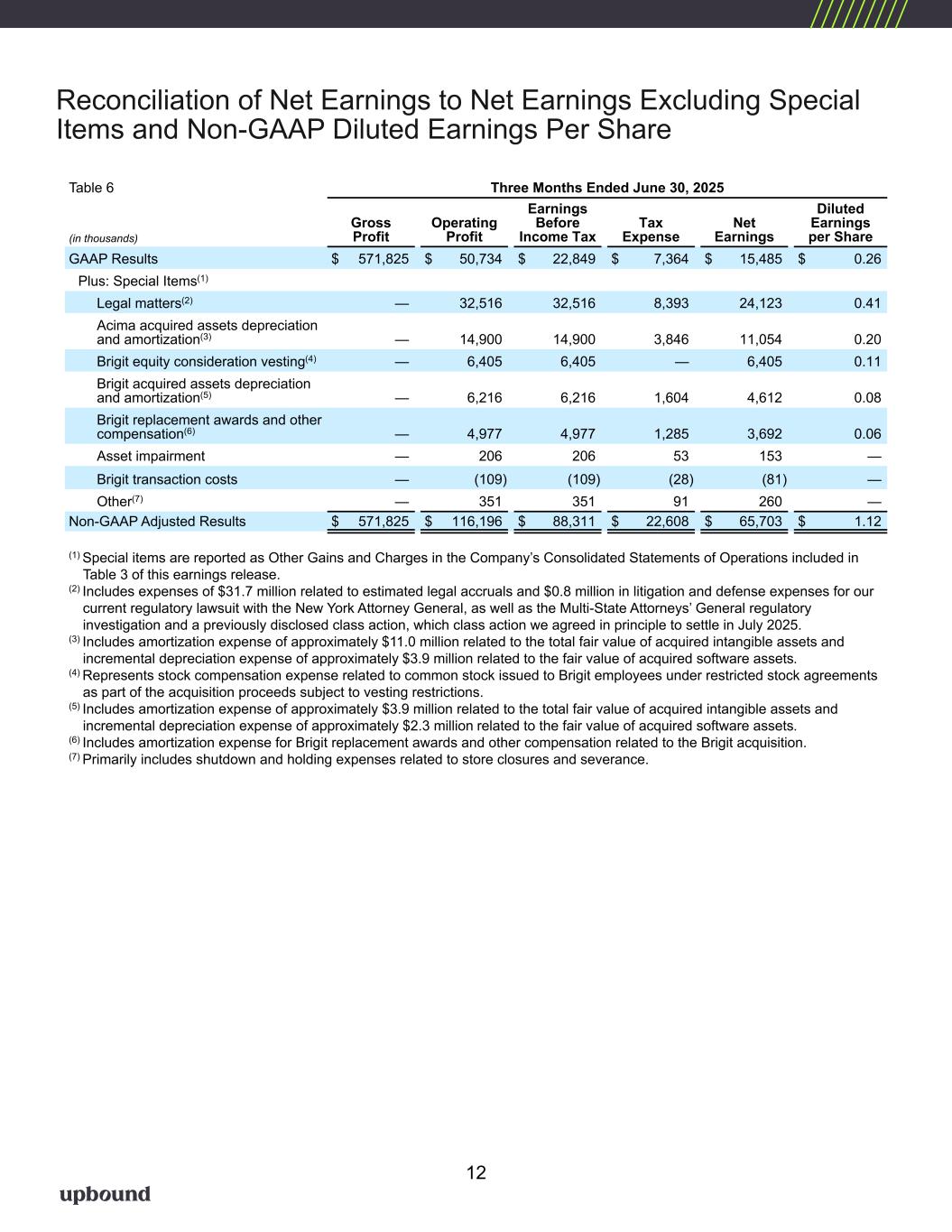 Reconciliation of Net Earnings to Net Earnings Excluding Special Items and Non-GAAP Diluted Earnings Per Share Table 5 Three Months Ended September 30, 2025 (in thousands) Gross Profit Operating Profit Earnings Before Income Tax Tax Expense Net Earnings Diluted Earnings per Share GAAP Results $ 563,076 $ 52,753 $ 19,870 $ 6,649 $ 13,221 $ 0.22 Plus: Debt refinancing charges — — 4,894 1,150 3,744 0.06 Plus: Special Items(1) Acima acquired assets depreciation and amortization(2) — 14,900 14,900 3,502 11,398 0.19 Legal matters(3) — 12,612 12,612 2,964 9,648 0.16 Asset Impairment(4) — 11,583 11,583 2,722 8,861 0.15 Brigit acquired assets depreciation and amortization(5) — 6,216 6,216 1,461 4,755 0.08 Brigit equity consideration vesting(6) — 5,101 5,101 — 5,101 0.09 Brigit replacement awards and other compensation(7) — 4,495 4,495 1,056 3,439 0.06 Brigit transaction costs — 551 551 129 422 0.01 Other(8) — (2,087) (2,087) (490) (1,597) (0.02) Non-GAAP Adjusted Results $ 563,076 $ 106,124 $ 78,135 $ 19,143 $ 58,992 $ 1.00 (1) Special items are reported as Other Gains and Charges in the Company’s Consolidated Statements of Operations included in Table 3 of this earnings release. (2) Includes amortization expense of approximately $10.9 million related to the total fair value of acquired intangible assets and incremental depreciation expense of approximately $4.0 million related to the fair value of acquired software assets. (3) Includes expenses of $8.9 million related to estimated legal accruals and $3.8 million in litigation and defense expenses primarily related to our Multi-State Attorneys’ General regulatory investigation, a patent infringement lawsuit, and our current regulatory lawsuit with the New York Attorney General. (4) Primarily includes lease impairment related to the closure of certain refranchised stores. (5) Includes amortization expense of approximately $3.9 million related to the total fair value of acquired intangible assets and incremental depreciation expense of approximately $2.3 million related to the fair value of acquired software assets. (6) Represents stock compensation expense related to common stock issued to Brigit employees under restricted stock agreements as part of the acquisition proceeds subject to vesting restrictions. (7) Includes amortization expense for Brigit replacement awards and other compensation related to the Brigit acquisition. (8) Primarily includes interest income on tax refunds for prior years recognized and shutdown and holding costs related to store closures and severance. 11