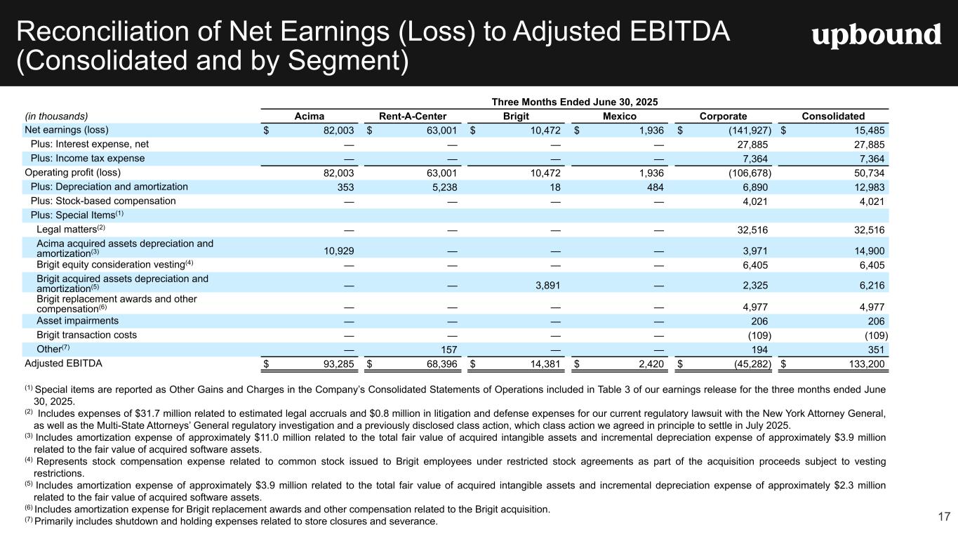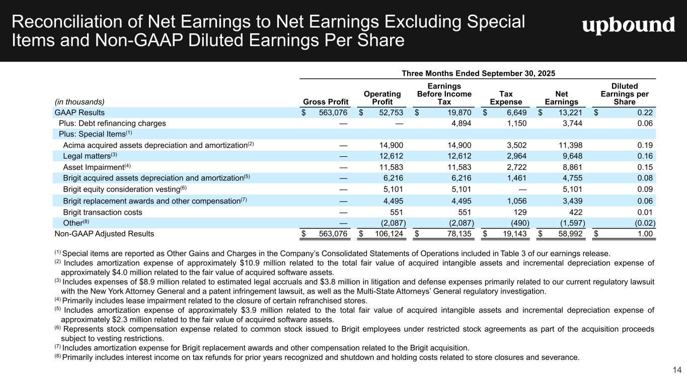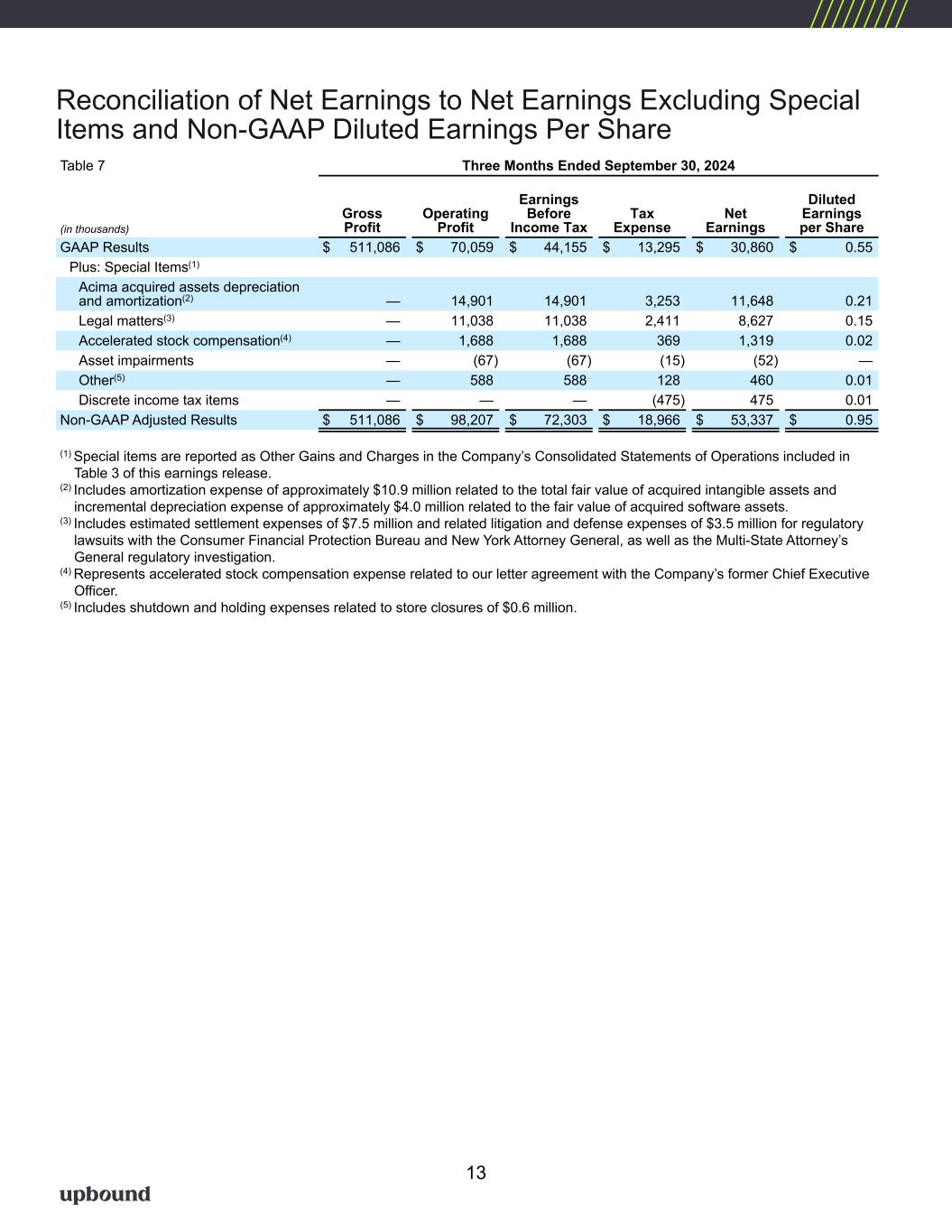 Reconciliation of Net Earnings to Net Earnings Excluding Special Items and Non-GAAP Diluted Earnings Per Share 12 Table 6 Three Months Ended June 30, 2025 (in thousands) Gross Profit Operating Profit Earnings Before Income Tax Tax Expense Net Earnings Diluted Earnings per Share GAAP Results $ 571,825 $ 50,734 $ 22,849 $ 7,364 $ 15,485 $ 0.26 Plus: Special Items(1) Legal matters(2) — 32,516 32,516 8,393 24,123 0.41 Acima acquired assets depreciation and amortization(3) — 14,900 14,900 3,846 11,054 0.20 Brigit equity consideration vesting(4) — 6,405 6,405 — 6,405 0.11 Brigit acquired assets depreciation and amortization(5) — 6,216 6,216 1,604 4,612 0.08 Brigit replacement awards and other compensation(6) — 4,977 4,977 1,285 3,692 0.06 Asset impairment — 206 206 53 153 — Brigit transaction costs — (109) (109) (28) (81) — Other(7) — 351 351 91 260 — Non-GAAP Adjusted Results $ 571,825 $ 116,196 $ 88,311 $ 22,608 $ 65,703 $ 1.12 (1) Special items are reported as Other Gains and Charges in the Company’s Consolidated Statements of Operations included in Table 3 of this earnings release. (2) Includes expenses of $31.7 million related to estimated legal accruals and $0.8 million in litigation and defense expenses for our current regulatory lawsuit with the New York Attorney General, as well as the Multi-State Attorneys’ General regulatory investigation and a previously disclosed class action, which class action we agreed in principle to settle in July 2025. (3) Includes amortization expense of approximately $11.0 million related to the total fair value of acquired intangible assets and incremental depreciation expense of approximately $3.9 million related to the fair value of acquired software assets. (4) Represents stock compensation expense related to common stock issued to Brigit employees under restricted stock agreements as part of the acquisition proceeds subject to vesting restrictions. (5) Includes amortization expense of approximately $3.9 million related to the total fair value of acquired intangible assets and incremental depreciation expense of approximately $2.3 million related to the fair value of acquired software assets. (6) Includes amortization expense for Brigit replacement awards and other compensation related to the Brigit acquisition. (7) Primarily includes shutdown and holding expenses related to store closures and severance.