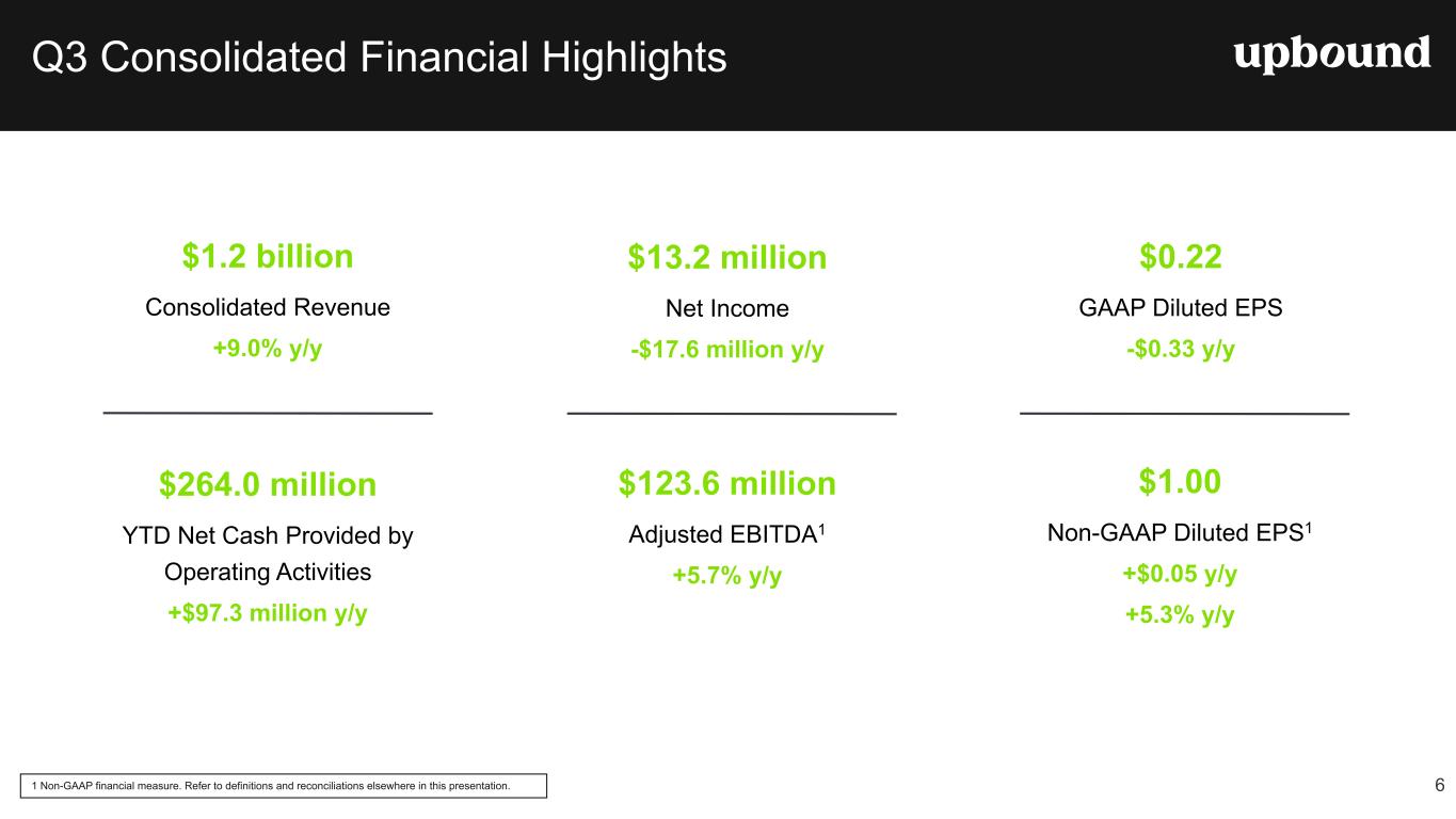 Financial Highlights (continued) (1) Non-GAAP financial measure. Refer to the explanations and reconciliations elsewhere in this release. (2) Gross Merchandise Volume (GMV): The Company defines Gross Merchandise Volume as the retail value in U.S. dollars of merchandise acquired by the Acima segment that is leased to customers through a transaction that occurs within a defined period, net of estimated cancellations as of the measurement date. (3) Lease Charge-Offs (LCOs): Represents charge-offs of the net book value of unrecoverable on-rent merchandise with lease-to-own customers who are past due. This is typically expressed as a percentage of revenues for the applicable period. For the Rent-A-Center segment, LCOs exclude Get It Now, Home Choice, and Franchise-owned Rent-A-Center locations. (4) 60+ Day Past Due Rate: Defined as the average number of accounts 60+ days past due as a % of total open leases. (5) Upbound acquired Brigit on January 31, 2025. (6) Cash Advance Volume: Defined as total advance originations during the period. (7) Brigit Paying Users: Represents Brigit customers who have an active Plus or Premium account, not delinquent (not 45 days past due) on a cash advance, and made at least 1 of the last 2 subscription payments. (8) ARPU: Average monthly revenue per Brigit Paying User, where Brigit Paying User is defined as in footnote 7 above. (9) Net Advance Loss: Represents charge-offs of customer cash advances that are 45+ days past due as a percentage of total cash advances originated in the period. (10) Lease Portfolio Value: Represents the aggregate dollar value of the expected monthly rental income associated with current active lease agreements from our Company-owned Rent-A-Center lease-to-own stores and e-commerce platform at the end of any given period. (11) Same Store Lease Portfolio Value: Represents the aggregate dollar value of the expected monthly rental income associated with current active lease agreements from our Company-owned Rent-A-Center lease-to-own stores that were operated by us for 13 months or more at the end of any given period. The Company excludes from the same store base any store that receives a certain level of customer accounts from closed stores or acquisitions. The receiving store will be eligible for inclusion in the same store base in the 30th full month following account transfer. (12) Same Store Sales (SSS): Same store sales generally represents revenue earned in Company-owned Rent-A-Center stores that were operated by us for 13 months or more and are reported on a constant currency basis as a percentage of total revenue earned in stores of the segment during the indicated period. The Company excludes from the same store sales base any store that receives a certain level of customer accounts from closed stores or acquisitions. The receiving store will be eligible for inclusion in the same store sales base in the 30th full month following account transfer. (13) 30+ Day Past Due Rate: Defined as the average number of accounts 30+ days past due as a % of total open leases for our Company-owned Rent-A-Center locations. (14) See Reconciliation of Net Cash Provided by Operating Activities to Free Cash Flow included in Table 13 of this earnings release for additional information. 5
