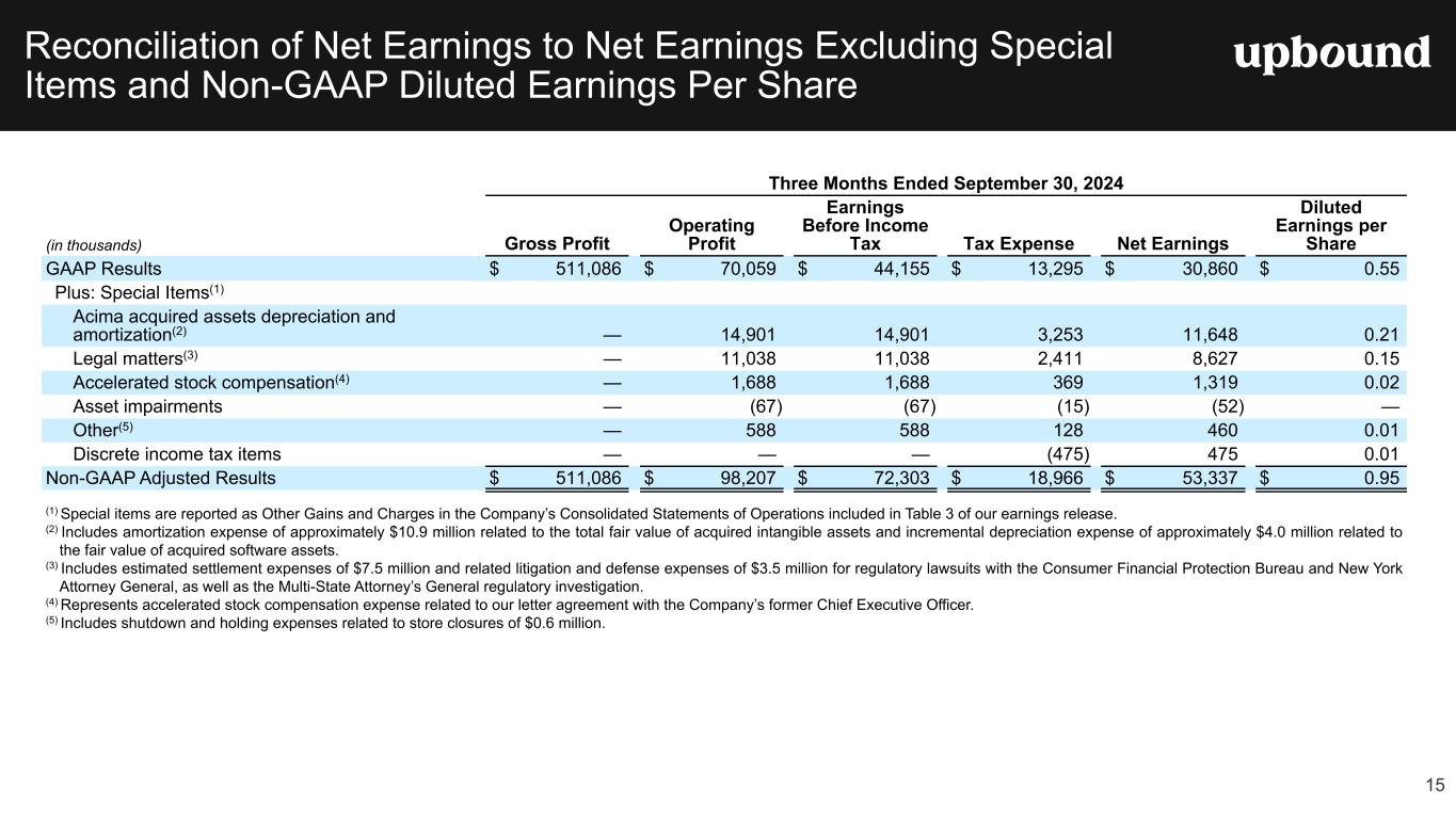 Reconciliation of Net Earnings to Net Earnings Excluding Special Items and Non-GAAP Diluted Earnings Per Share Table 7 Three Months Ended September 30, 2024 (in thousands) Gross Profit Operating Profit Earnings Before Income Tax Tax Expense Net Earnings Diluted Earnings per Share GAAP Results $ 511,086 $ 70,059 $ 44,155 $ 13,295 $ 30,860 $ 0.55 Plus: Special Items(1) Acima acquired assets depreciation and amortization(2) — 14,901 14,901 3,253 11,648 0.21 Legal matters(3) — 11,038 11,038 2,411 8,627 0.15 Accelerated stock compensation(4) — 1,688 1,688 369 1,319 0.02 Asset impairments — (67) (67) (15) (52) — Other(5) — 588 588 128 460 0.01 Discrete income tax items — — — (475) 475 0.01 Non-GAAP Adjusted Results $ 511,086 $ 98,207 $ 72,303 $ 18,966 $ 53,337 $ 0.95 (1) Special items are reported as Other Gains and Charges in the Company’s Consolidated Statements of Operations included in Table 3 of this earnings release. (2) Includes amortization expense of approximately $10.9 million related to the total fair value of acquired intangible assets and incremental depreciation expense of approximately $4.0 million related to the fair value of acquired software assets. (3) Includes estimated settlement expenses of $7.5 million and related litigation and defense expenses of $3.5 million for regulatory lawsuits with the Consumer Financial Protection Bureau and New York Attorney General, as well as the Multi-State Attorney’s General regulatory investigation. (4) Represents accelerated stock compensation expense related to our letter agreement with the Company’s former Chief Executive Officer. (5) Includes shutdown and holding expenses related to store closures of $0.6 million. 13