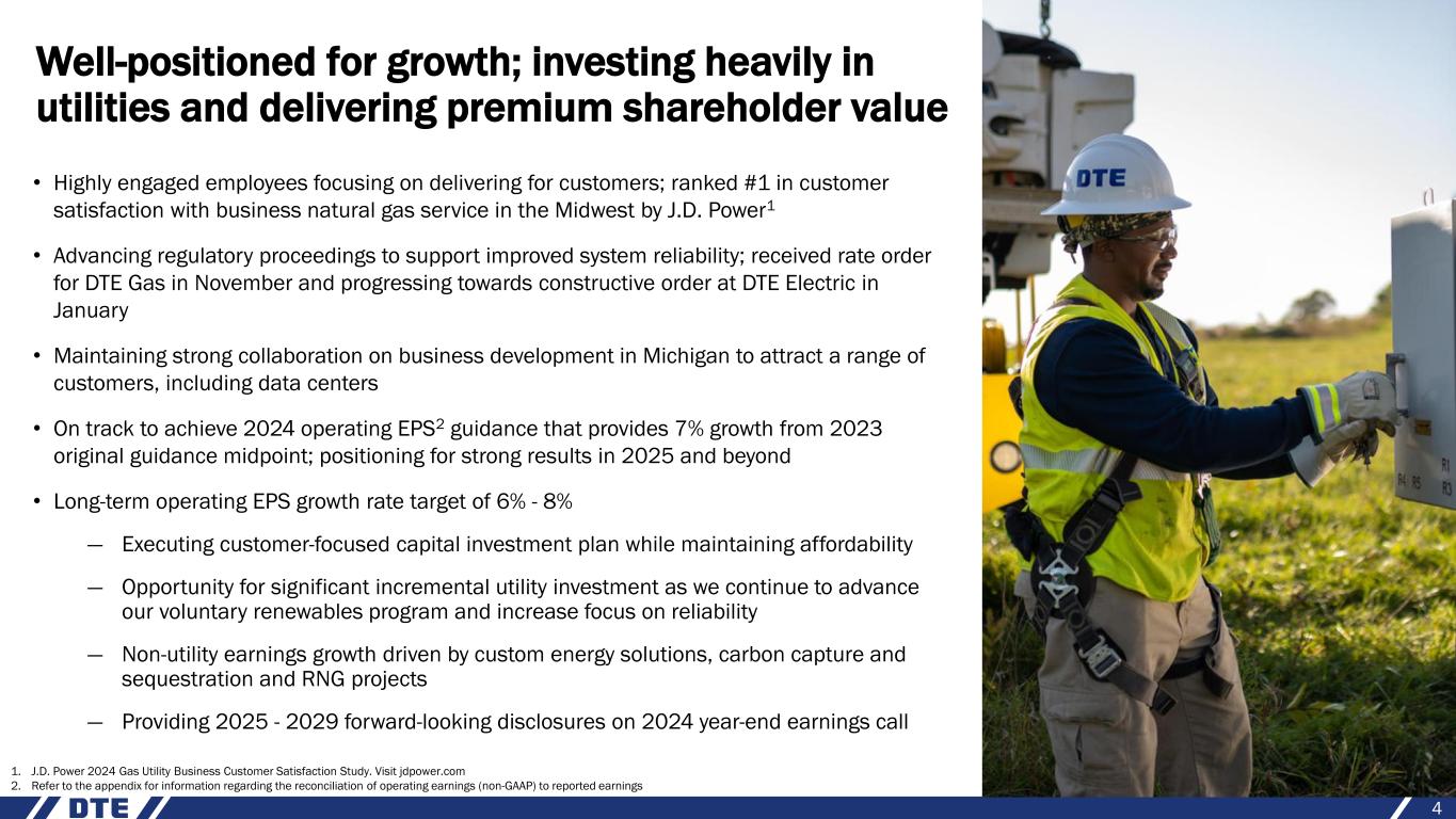 Recent business development progress supports long-term growth • Significant legislation recently passed through the Michigan House and Senate — Championed legislation that expands eligibility and doubles state funding for energy assistance for low-income customers — Strongly advocated for legislation to provide sales and use tax exemptions for data centers that was passed by Michigan lawmakers; will be sent to the Governor for signature • Executed non-binding term sheet and moving toward definitive agreements for data center complex with Switch, a leading data center developer/ operator, to be supported by Hyperscaler tenant(s) and other AI and enterprise customers — Anticipated load ramping up to 1.4 GW from 2026 – 2032; load ramp supported by a portion of existing capacity and additional capital for renewable generation and energy storage projects — Expected location will include a site currently owned by DTE • University of Michigan approved agreement for a 110 MW data center to support a high-performance computing and AI research facility; ongoing discussions with additional data centers • Continuing to progress on project development at DTE Vantage — Executed an agreement to design, build, own and operate the central utility plant to serve Ford Motor Company’s new facility currently under construction in Marshall, MI — Finalizing a transaction to design, build, own, operate and maintain a 42 MW combined heat and power project serving a large industrial customer — Two additional combined heat and power projects expected to close in 2025 • Increased annualized dividend 7% to $4.36 per share 3