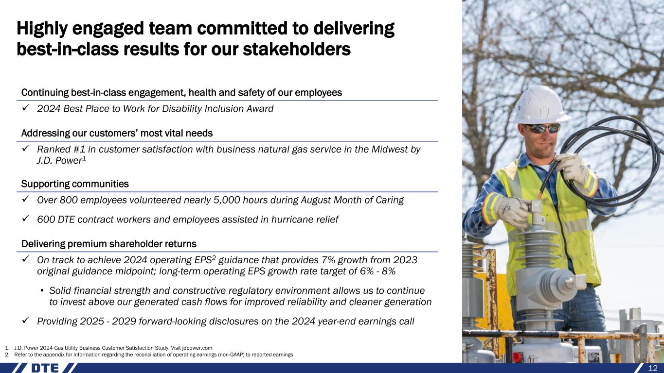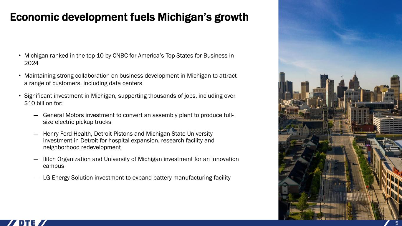 4 Well-positioned for growth; investing heavily in utilities and delivering premium shareholder value 1. J.D. Power 2024 Gas Utility Business Customer Satisfaction Study. Visit jdpower.com 2. Refer to the appendix for information regarding the reconciliation of operating earnings (non-GAAP) to reported earnings • Highly engaged employees focusing on delivering for customers; ranked #1 in customer satisfaction with business natural gas service in the Midwest by J.D. Power1 • Advancing regulatory proceedings to support improved system reliability; received rate order for DTE Gas in November and progressing towards constructive order at DTE Electric in January • Maintaining strong collaboration on business development in Michigan to attract a range of customers, including data centers • On track to achieve 2024 operating EPS2 guidance that provides 7% growth from 2023 original guidance midpoint; positioning for strong results in 2025 and beyond • Long-term operating EPS growth rate target of 6% - 8% — Executing customer-focused capital investment plan while maintaining affordability — Opportunity for significant incremental utility investment as we continue to advance our voluntary renewables program and increase focus on reliability — Non-utility earnings growth driven by custom energy solutions, carbon capture and sequestration and RNG projects — Providing 2025 - 2029 forward-looking disclosures on 2024 year-end earnings call