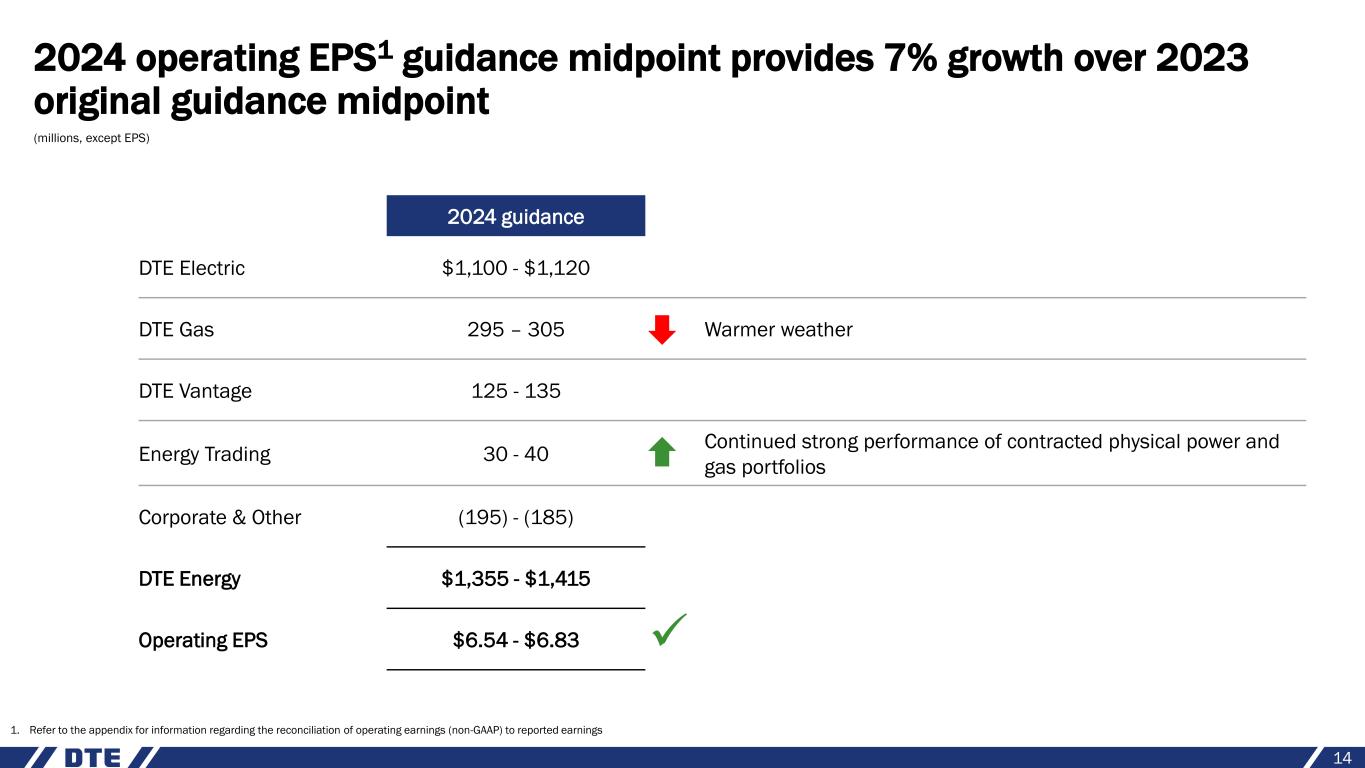 DTEエナジーは事業プレゼンテーションと本申請において、2024年の営業利益ガイダンスについて述べている。2024 年の報告業績に影響を与える特定の項目は営業業績から除外される可能性が高い。特定の項目(すなわち、将来の経常外項目、特定の時価調整、非継続事業)について信頼できる予測を提供することが不可能なため、比較可能な2024年の報告済み業績ガイダンスとの調整は行っていません。これらの項目は期ごとに大きく変動する可能性があり、報告された利益に大きな影響を与える可能性があります。