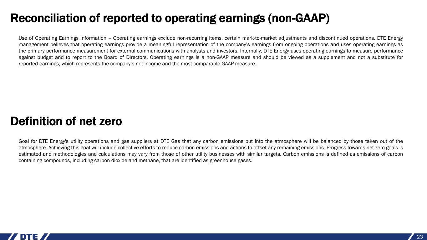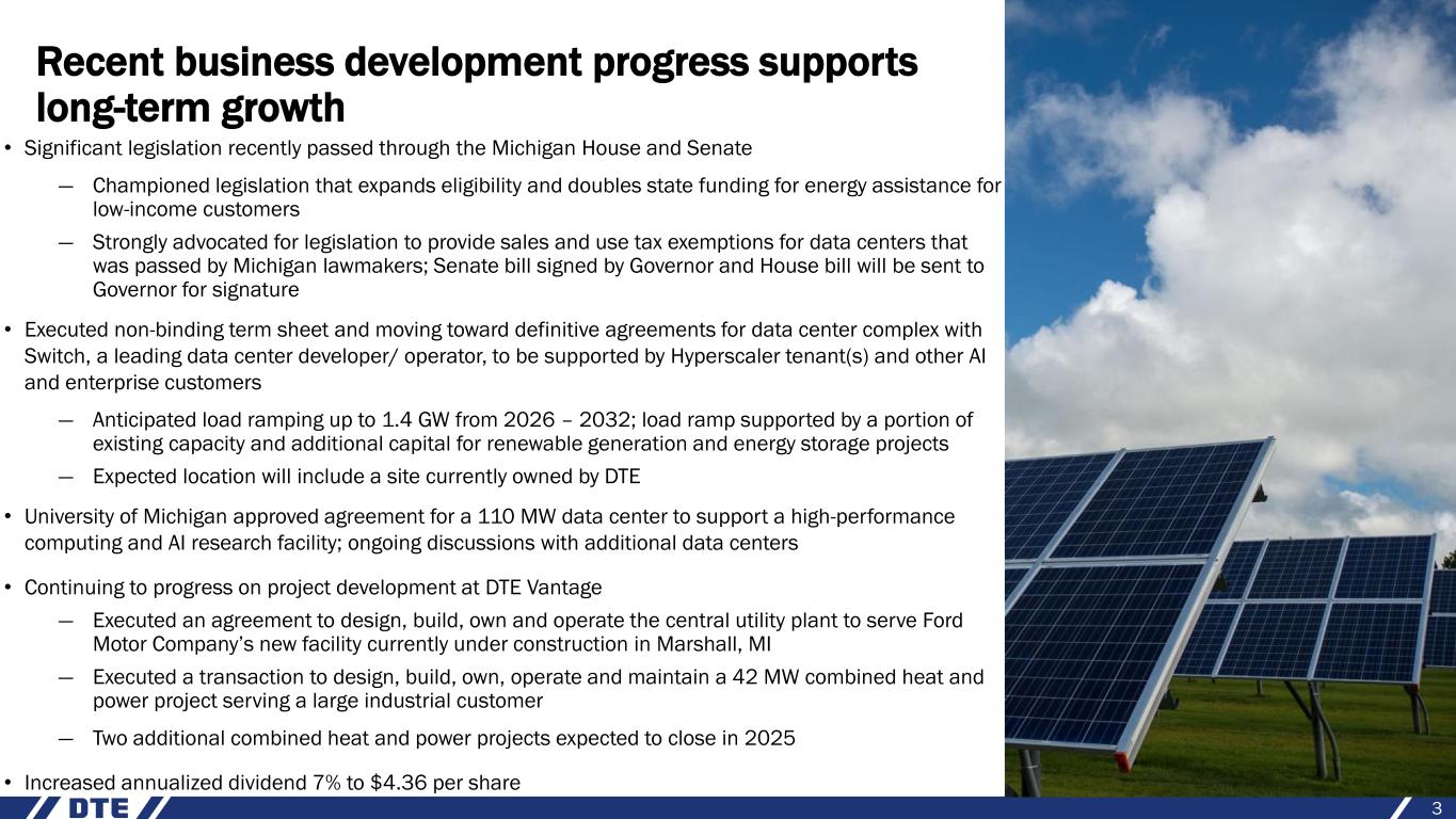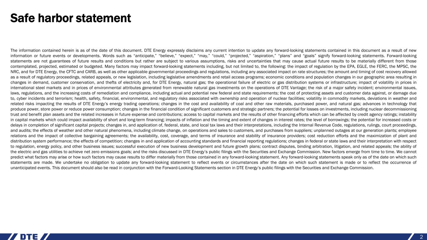 Safe harbor statement 2 The information contained herein is as of the date of this document. DTE Energy expressly disclaims any current intention to update any forward-looking statements contained in this document as a result of new information or future events or developments. Words such as “anticipate,” “believe,” “expect,” “may,” “could,” “projected,” “aspiration,” “plans” and “goals” signify forward-looking statements. Forward-looking statements are not guarantees of future results and conditions but rather are subject to various assumptions, risks and uncertainties that may cause actual future results to be materially different from those contemplated, projected, estimated or budgeted. Many factors may impact forward-looking statements including, but not limited to, the following: the impact of regulation by the EPA, EGLE, the FERC, the MPSC, the NRC, and for DTE Energy, the CFTC and CARB, as well as other applicable governmental proceedings and regulations, including any associated impact on rate structures; the amount and timing of cost recovery allowed as a result of regulatory proceedings, related appeals, or new legislation, including legislative amendments and retail access programs; economic conditions and population changes in our geographic area resulting in changes in demand, customer conservation, and thefts of electricity and, for DTE Energy, natural gas; the operational failure of electric or gas distribution systems or infrastructure; impact of volatility in prices in international steel markets and in prices of environmental attributes generated from renewable natural gas investments on the operations of DTE Vantage; the risk of a major safety incident; environmental issues, laws, regulations, and the increasing costs of remediation and compliance, including actual and potential new federal and state requirements; the cost of protecting assets and customer data against, or damage due to, cyber incidents and terrorism; health, safety, financial, environmental, and regulatory risks associated with ownership and operation of nuclear facilities; volatility in commodity markets, deviations in weather and related risks impacting the results of DTE Energy’s energy trading operations; changes in the cost and availability of coal and other raw materials, purchased power, and natural gas; advances in technology that produce power, store power or reduce power consumption; changes in the financial condition of significant customers and strategic partners; the potential for losses on investments, including nuclear decommissioning trust and benefit plan assets and the related increases in future expense and contributions; access to capital markets and the results of other financing efforts which can be affected by credit agency ratings; instability in capital markets which could impact availability of short and long-term financing; impacts of inflation and the timing and extent of changes in interest rates; the level of borrowings; the potential for increased costs or delays in completion of significant capital projects; changes in, and application of, federal, state, and local tax laws and their interpretations, including the Internal Revenue Code, regulations, rulings, court proceedings, and audits; the effects of weather and other natural phenomena, including climate change, on operations and sales to customers, and purchases from suppliers; unplanned outages at our generation plants; employee relations and the impact of collective bargaining agreements; the availability, cost, coverage, and terms of insurance and stability of insurance providers; cost reduction efforts and the maximization of plant and distribution system performance; the effects of competition; changes in and application of accounting standards and financial reporting regulations; changes in federal or state laws and their interpretation with respect to regulation, energy policy, and other business issues; successful execution of new business development and future growth plans; contract disputes, binding arbitration, litigation, and related appeals; the ability of the electric and gas utilities to achieve net zero emissions goals; and the risks discussed in DTE Energy’s public filings with the Securities and Exchange Commission. New factors emerge from time to time. We cannot predict what factors may arise or how such factors may cause results to differ materially from those contained in any forward-looking statement. Any forward-looking statements speak only as of the date on which such statements are made. We undertake no obligation to update any forward-looking statement to reflect events or circumstances after the date on which such statement is made or to reflect the occurrence of unanticipated events. This document should also be read in conjunction with the Forward-Looking Statements section in DTE Energy’s public filings with the Securities and Exchange Commission.