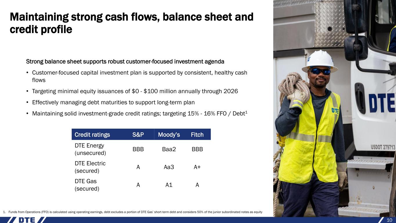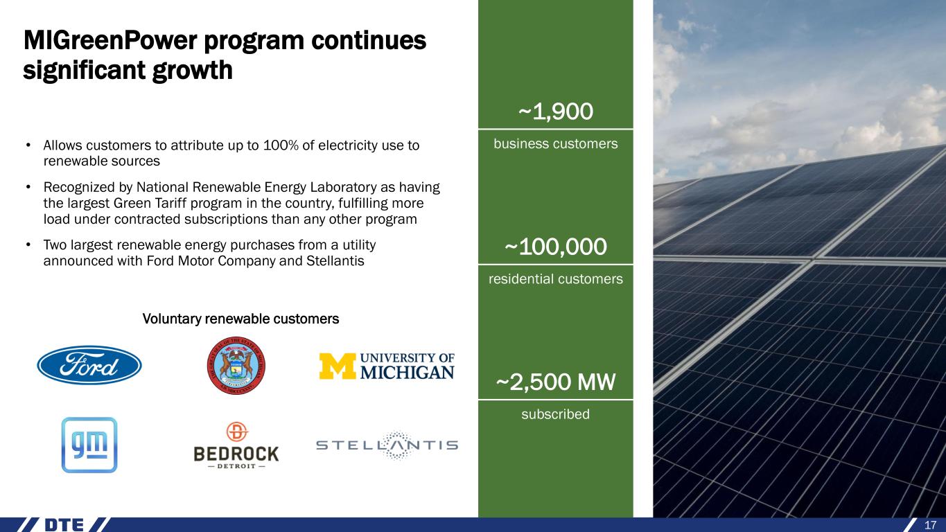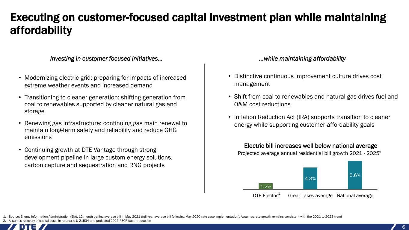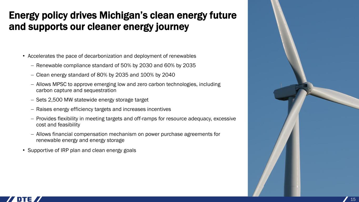 Safe harbor statement 2 The information contained herein is as of the date of this document. DTE Energy expressly disclaims any current intention to update any forward-looking statements contained in this document as a result of new information or future events or developments. Words such as “anticipate,” “believe,” “expect,” “may,” “could,” “projected,” “aspiration,” “plans” and “goals” signify forward-looking statements. Forward-looking statements are not guarantees of future results and conditions but rather are subject to various assumptions, risks and uncertainties that may cause actual future results to be materially different from those contemplated, projected, estimated or budgeted. Many factors may impact forward-looking statements including, but not limited to, the following: the impact of regulation by the EPA, EGLE, the FERC, the MPSC, the NRC, and for DTE Energy, the CFTC and CARB, as well as other applicable governmental proceedings and regulations, including any associated impact on rate structures; the amount and timing of cost recovery allowed as a result of regulatory proceedings, related appeals, or new legislation, including legislative amendments and retail access programs; economic conditions and population changes in our geographic area resulting in changes in demand, customer conservation, and thefts of electricity and, for DTE Energy, natural gas; the operational failure of electric or gas distribution systems or infrastructure; impact of volatility in prices in international steel markets and in prices of environmental attributes generated from renewable natural gas investments on the operations of DTE Vantage; the risk of a major safety incident; environmental issues, laws, regulations, and the increasing costs of remediation and compliance, including actual and potential new federal and state requirements; the cost of protecting assets and customer data against, or damage due to, cyber incidents and terrorism; health, safety, financial, environmental, and regulatory risks associated with ownership and operation of nuclear facilities; volatility in commodity markets, deviations in weather and related risks impacting the results of DTE Energy’s energy trading operations; changes in the cost and availability of coal and other raw materials, purchased power, and natural gas; advances in technology that produce power, store power or reduce power consumption; changes in the financial condition of significant customers and strategic partners; the potential for losses on investments, including nuclear decommissioning trust and benefit plan assets and the related increases in future expense and contributions; access to capital markets and the results of other financing efforts which can be affected by credit agency ratings; instability in capital markets which could impact availability of short and long-term financing; impacts of inflation and the timing and extent of changes in interest rates; the level of borrowings; the potential for increased costs or delays in completion of significant capital projects; changes in, and application of, federal, state, and local tax laws and their interpretations, including the Internal Revenue Code, regulations, rulings, court proceedings, and audits; the effects of weather and other natural phenomena, including climate change, on operations and sales to customers, and purchases from suppliers; unplanned outages at our generation plants; employee relations and the impact of collective bargaining agreements; the availability, cost, coverage, and terms of insurance and stability of insurance providers; cost reduction efforts and the maximization of plant and distribution system performance; the effects of competition; changes in and application of accounting standards and financial reporting regulations; changes in federal or state laws and their interpretation with respect to regulation, energy policy, and other business issues; successful execution of new business development and future growth plans; contract disputes, binding arbitration, litigation, and related appeals; the ability of the electric and gas utilities to achieve net zero emissions goals; and the risks discussed in DTE Energy’s public filings with the Securities and Exchange Commission. New factors emerge from time to time. We cannot predict what factors may arise or how such factors may cause results to differ materially from those contained in any forward-looking statement. Any forward-looking statements speak only as of the date on which such statements are made. We undertake no obligation to update any forward-looking statement to reflect events or circumstances after the date on which such statement is made or to reflect the occurrence of unanticipated events. This document should also be read in conjunction with the Forward-Looking Statements section in DTE Energy’s public filings with the Securities and Exchange Commission.