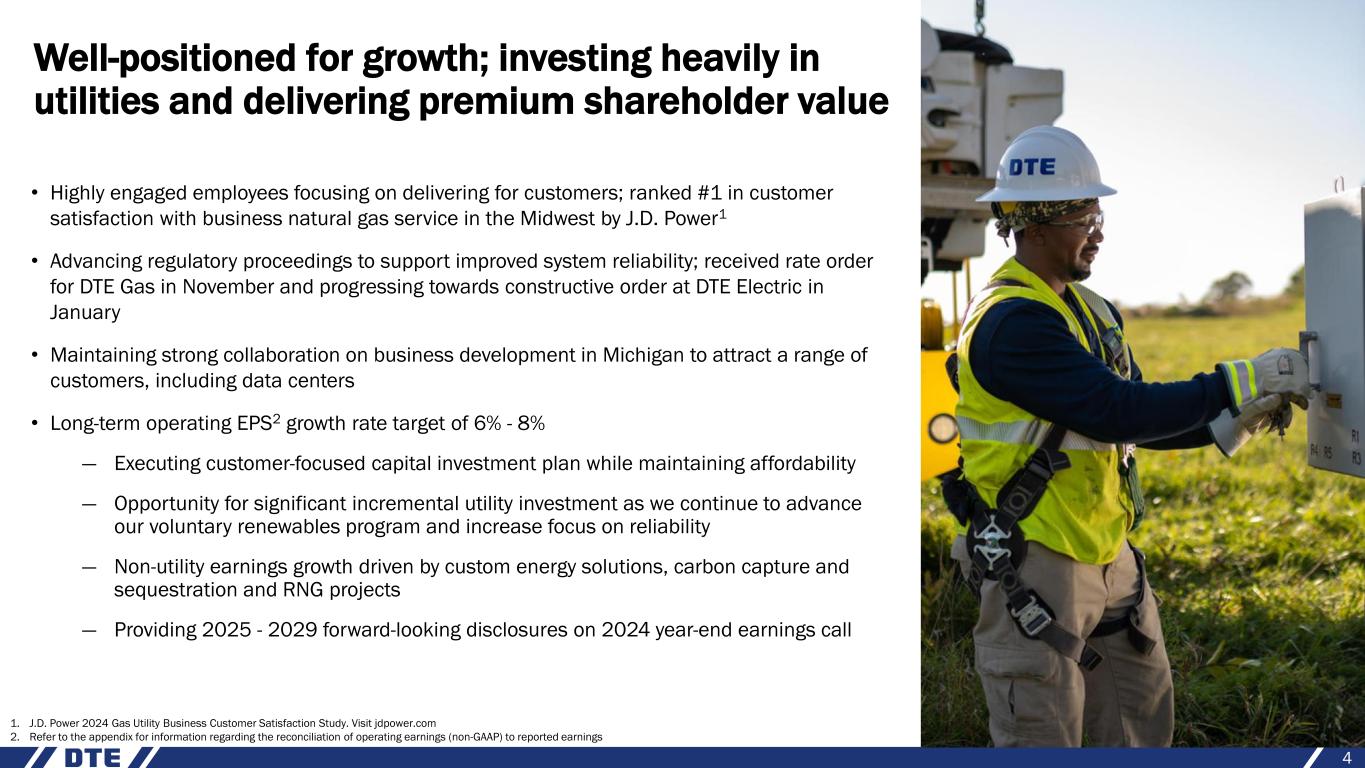 Recent business development progress supports long-term growth • Significant legislation recently passed through the Michigan House and Senate — Championed legislation that expands eligibility and doubles state funding for energy assistance for low-income customers — Strongly advocated for legislation to provide sales and use tax exemptions for data centers that was passed by Michigan lawmakers; Senate bill signed by Governor and House bill will be sent to Governor for signature • Executed non-binding term sheet and moving toward definitive agreements for data center complex with Switch, a leading data center developer/ operator, to be supported by Hyperscaler tenant(s) and other AI and enterprise customers — Anticipated load ramping up to 1.4 GW from 2026 – 2032; load ramp supported by a portion of existing capacity and additional capital for renewable generation and energy storage projects — Expected location will include a site currently owned by DTE • University of Michigan approved agreement for a 110 MW data center to support a high-performance computing and AI research facility; ongoing discussions with additional data centers • Continuing to progress on project development at DTE Vantage — Executed an agreement to design, build, own and operate the central utility plant to serve Ford Motor Company’s new facility currently under construction in Marshall, MI — Executed a transaction to design, build, own, operate and maintain a 42 MW combined heat and power project serving a large industrial customer — Two additional combined heat and power projects expected to close in 2025 • Increased annualized dividend 7% to $4.36 per share 3