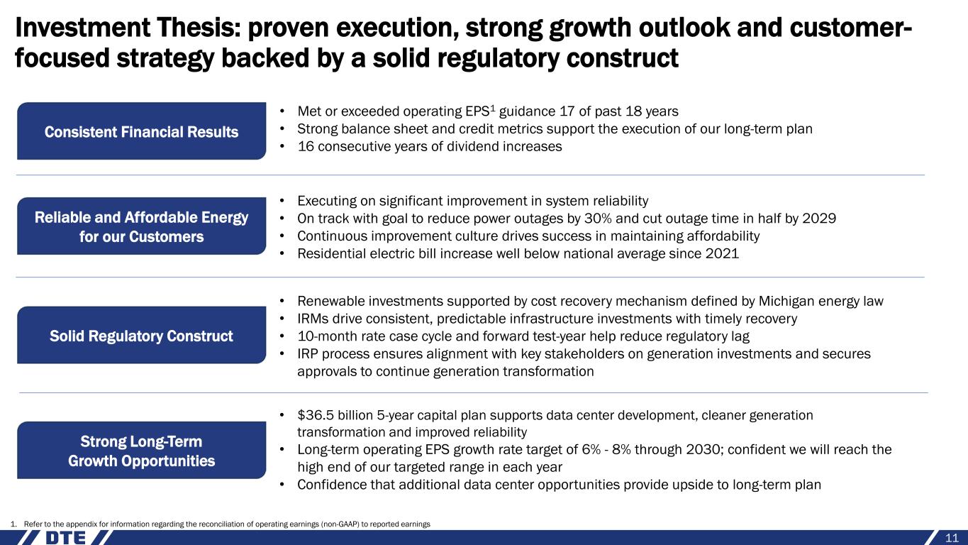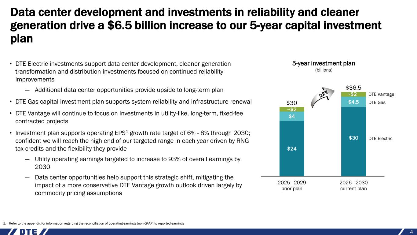 Continuing to deliver exceptional results for our stakeholders; well positioned for long-term growth 3 1. Refer to the appendix for information regarding the reconciliation of operating earnings (non-GAAP) to reported earnings ✓ Highly engaged team committed to delivering best-in-class results for our customers, communities and investors ✓ Well positioned to achieve high end of operating EPS1 guidance in 2025 ✓ 2026 operating EPS early outlook provides 6% - 8% growth over 2025 guidance midpoint; well positioned to achieve high end of the range ✓ Executed 1.4 GW data center agreement with an additional ~3 GW in late- stage negotiations • Data center development and investments in reliability and cleaner generation drive a $6.5 billion increase to our 5-year capital investment plan • Additional data center opportunities provide upside to long-term plan ✓ Investment plan supports shift to higher quality utility operating earnings over the 5-year plan; utility earnings targeted to increase to 93% of overall earnings by 2030 ✓ Long-term operating EPS growth rate target of 6% - 8% through 2030, with 2026 guidance midpoint as the base; confident we will reach the high end of our targeted range in each year driven by RNG tax credits and the flexibility they provide 2025 2026 2027 2028 2029 2030 $7.09 - $7.23 $7.59 - $7.73 EPS Guidance Range Confident to reach the high end of 6% - 8% operating EPS guidance each year (operating EPS guidance) Current target is high end of guidance range in each year Midpoint of 6% - 8% long-term operating EPS growth rate 8% 6%