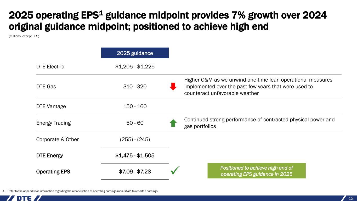 DTEエナジーは事業プレゼンテーションと本申請において、2025年と2026年の営業利益ガイダンスについて述べている。2025年および2026年の報告業績に影響を与える特定の項目は営業業績から除外される可能性が高い。特定の項目(すなわち、将来の経常外項目、特定の時価調整、非継続事業)について信頼できる予測を提供することが不可能なため、比較可能な2025年および2026年の報告済み業績ガイダンスとの調整は行っていません。これらの項目は期ごとに大きく変動する可能性があり、報告された利益に大きな影響を与える可能性があります。