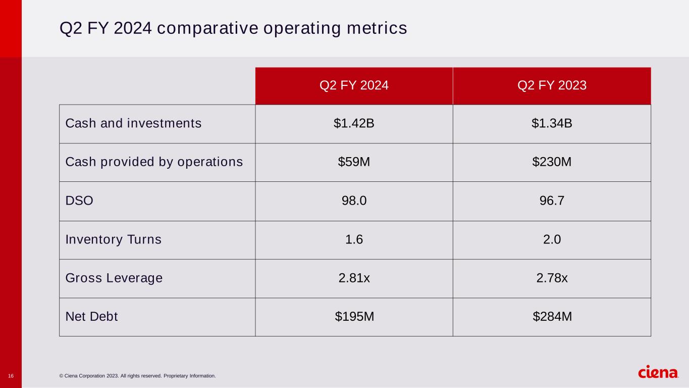 メリーランド州ハノーバー - 2024年6月6日 - ネットワーキング・システム、サービス、ソフトウェアのシエナ®・コーポレーション(NYSE: CIEN)は本日、2024年4月27日を期末とする会計年度第2四半期の未監査決算を発表した。