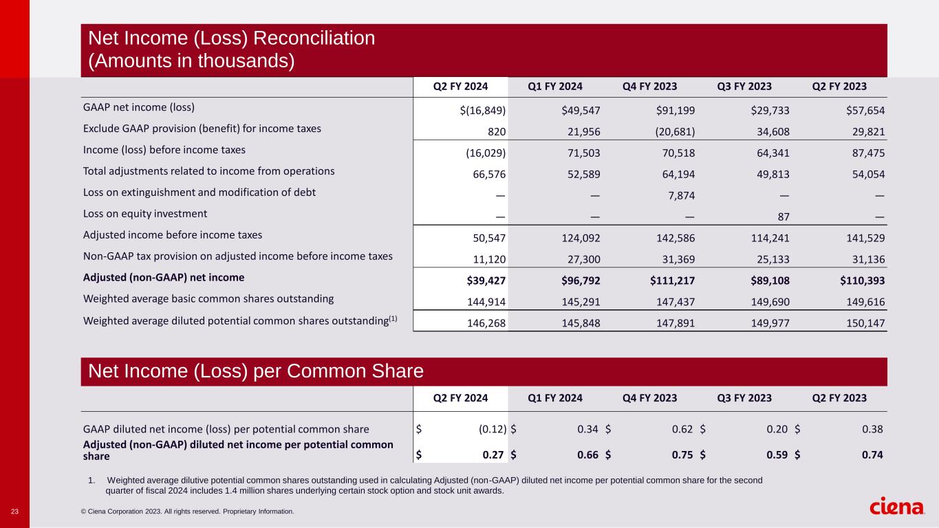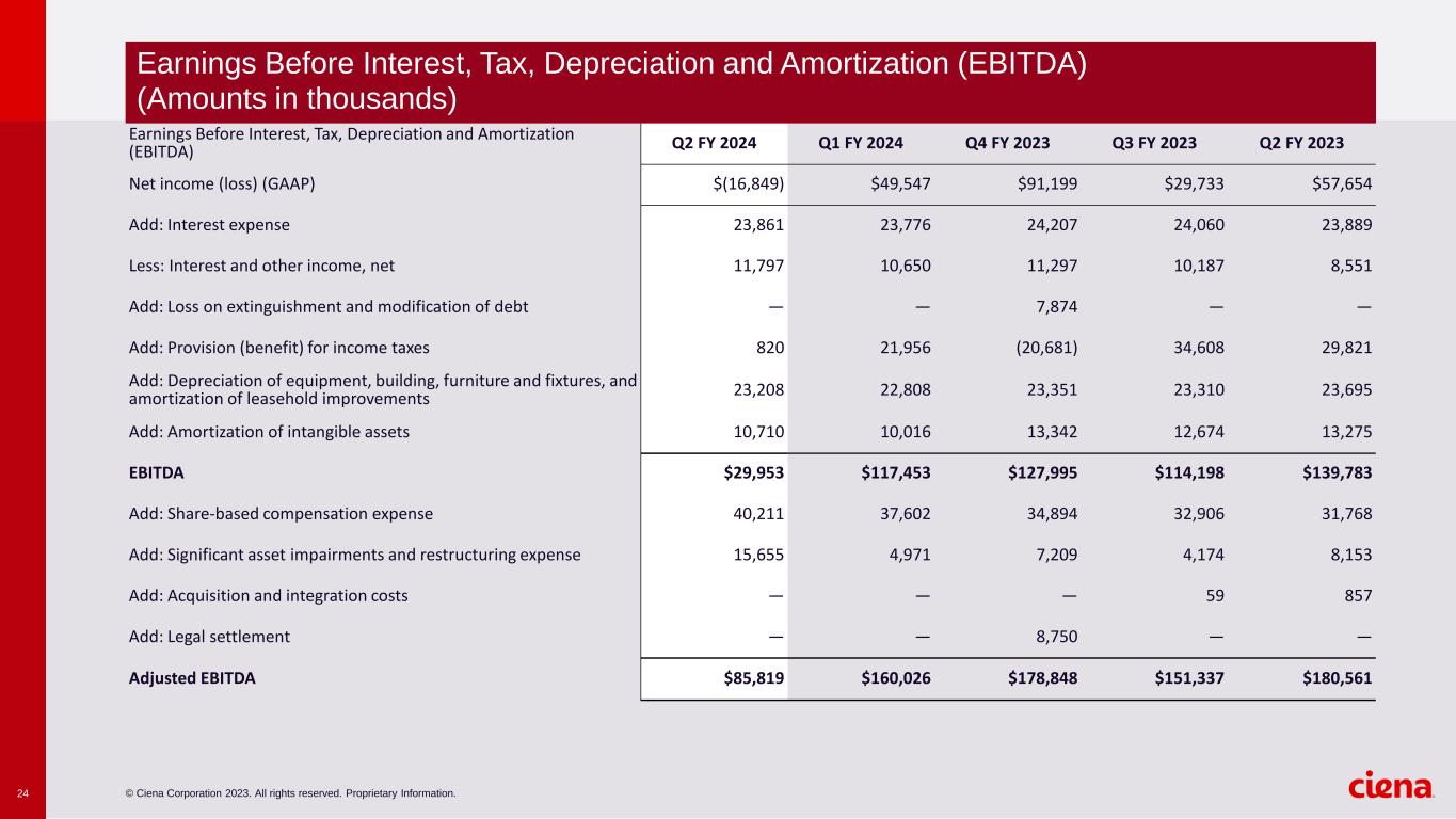 シエナの2024年度第2四半期のGAAP基準の純損失は1,680万ドル(希薄化後普通株式1株当たり0.12ドル)で、これに対して2023年度第2四半期のGAAP基準の純利益は5,770万ドル(希薄化後普通株式1株当たり0.38ドル)であった。