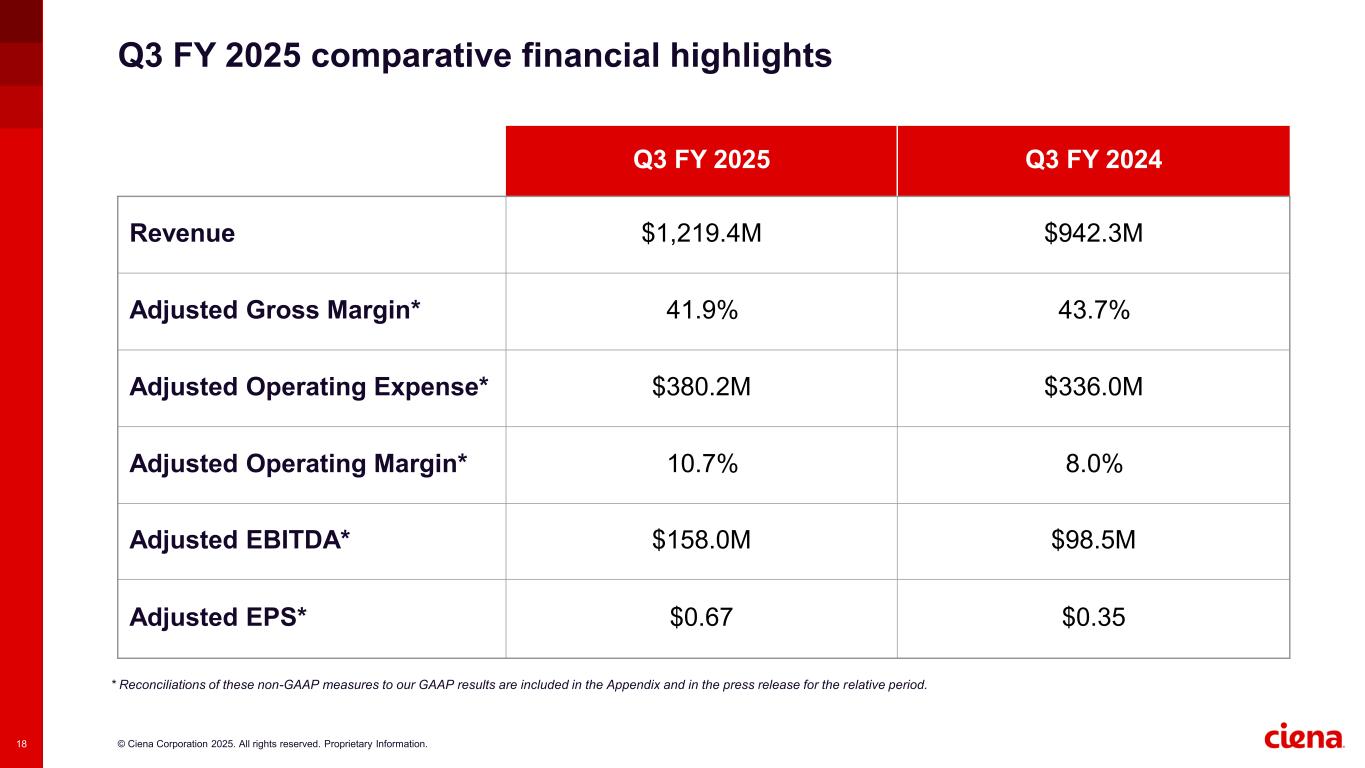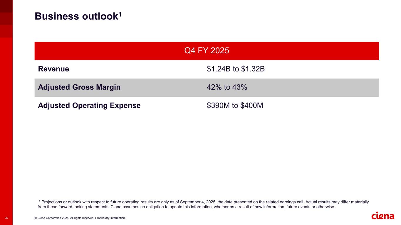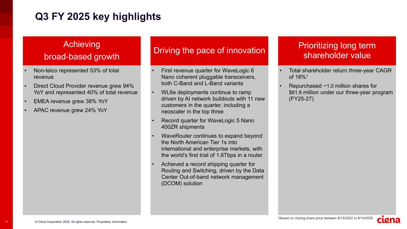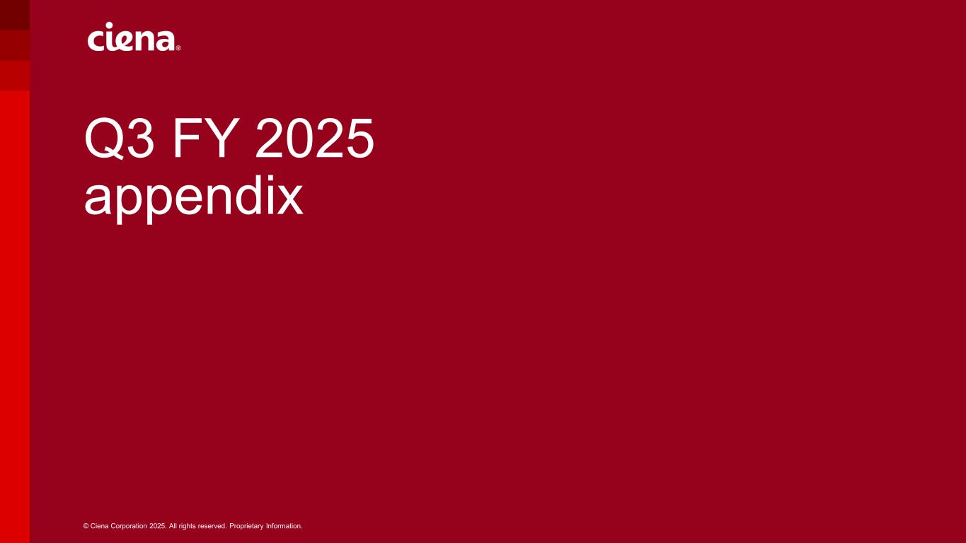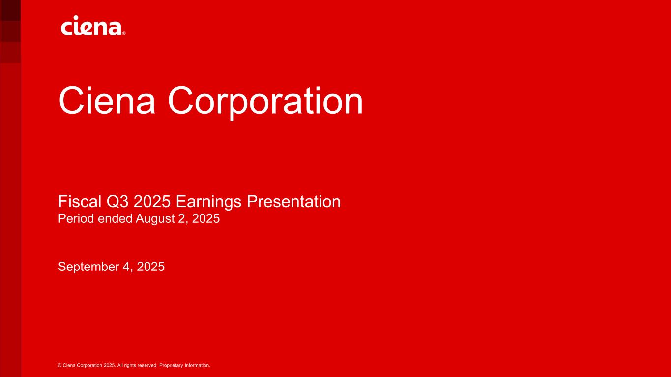 メリーランド州ハノーバー - 2025年9月4日 - ネットワーキング・システム、サービス、ソフトウェアのシエナ®・コーポレーション(NYSE: CIEN)は本日、2025年8月2日を期末とする会計年度第3四半期の未監査決算を発表した。