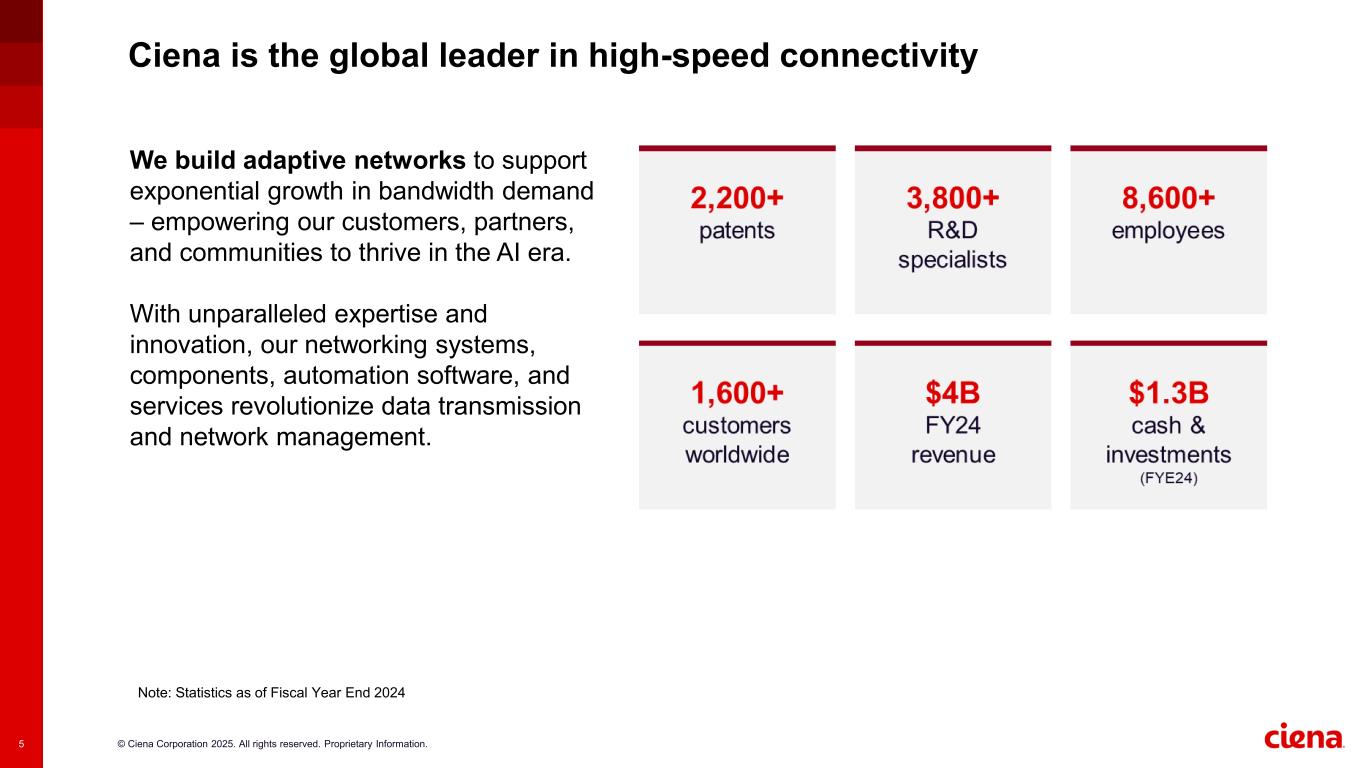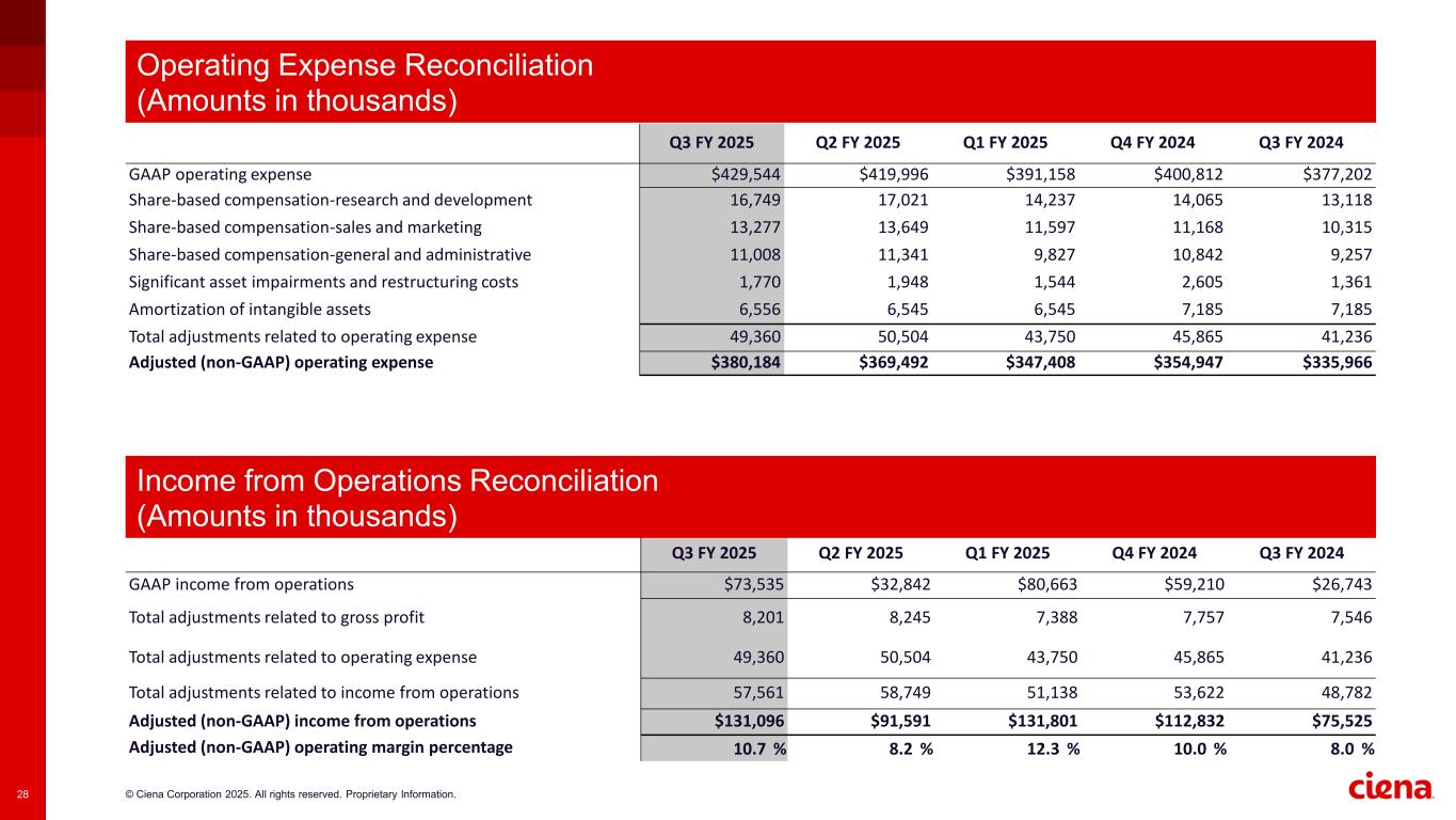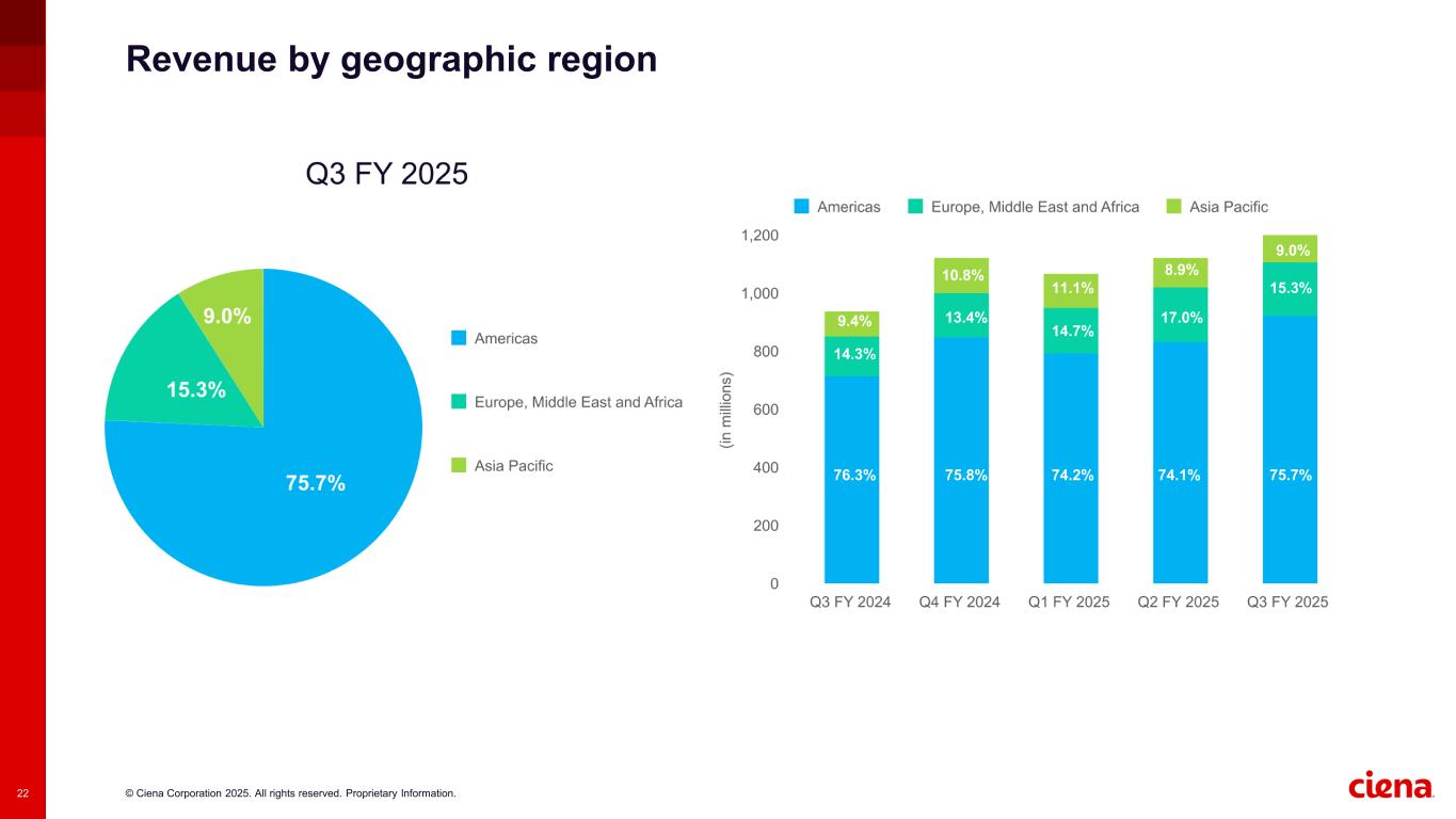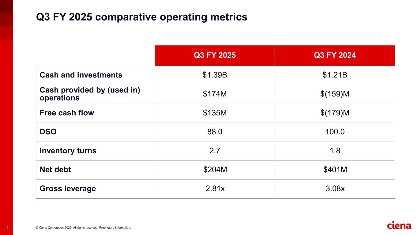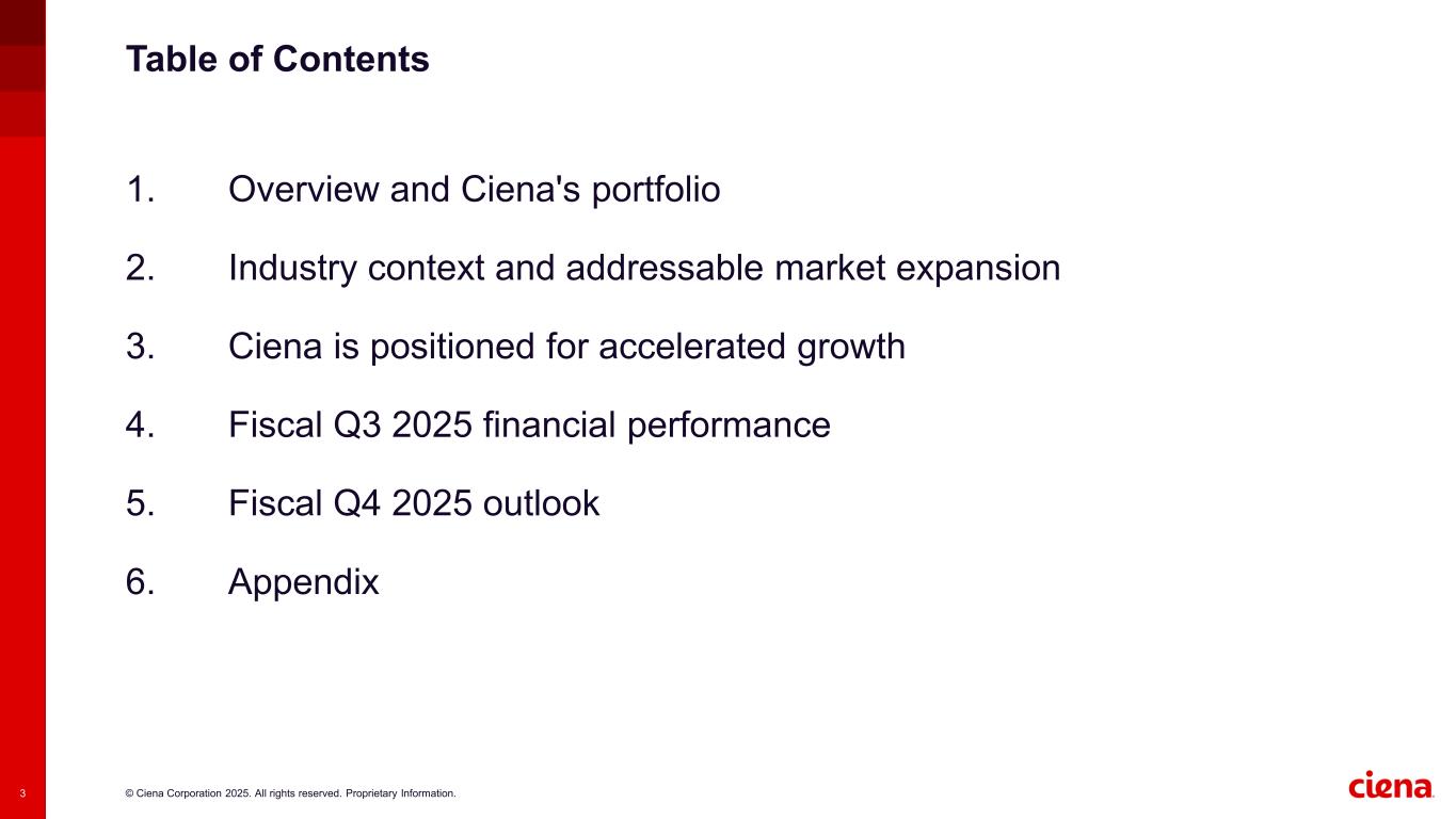 メリーランド州ハノーバー - 2025年9月4日 - ネットワーキング・システム、サービス、ソフトウェアのシエナ®・コーポレーション(NYSE: CIEN)は本日、2025年8月2日を期末とする会計年度第3四半期の未監査決算を発表した。