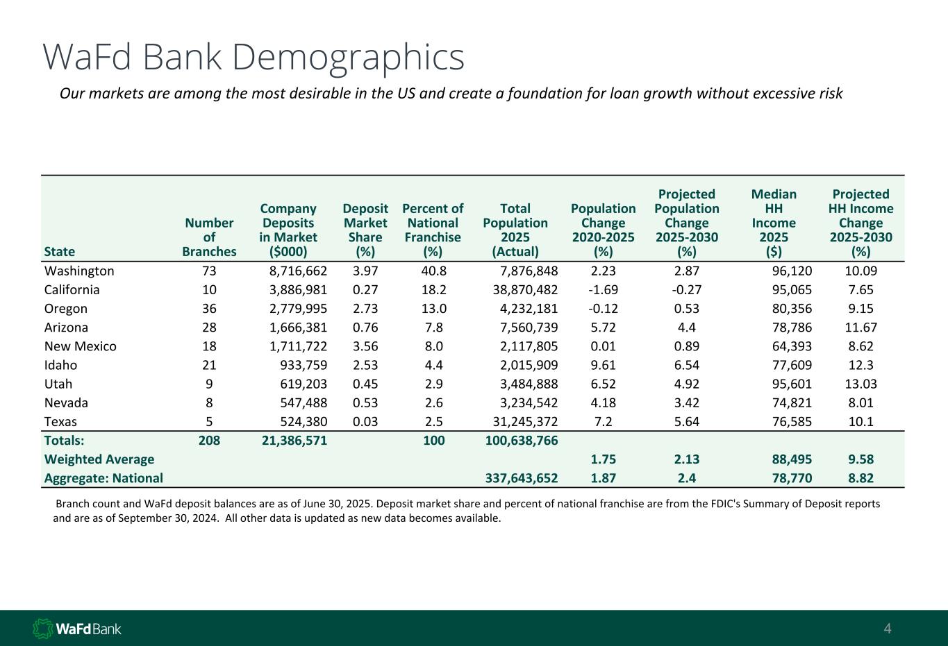 4 WaFd Bank Demographics Our markets are among the most desirable in the US and create a foundation for loan growth without excessive risk State Number of Branches Company Deposits in Market ($000) Deposit Market Share (%) Percent of National Franchise (%) Total Population 2025 (Actual) Population Change 2020-2025 (%) Projected Population Change 2025-2030 (%) Median HH Income 2025 ($) Projected HH Income Change 2025-2030 (%) Washington 73 8,716,662 3.97 40.8 7,876,848 2.23 2.87 96,120 10.09 California 10 3,886,981 0.27 18.2 38,870,482 -1.69 -0.27 95,065 7.65 Oregon 36 2,779,995 2.73 13.0 4,232,181 -0.12 0.53 80,356 9.15 Arizona 28 1,666,381 0.76 7.8 7,560,739 5.72 4.4 78,786 11.67 New Mexico 18 1,711,722 3.56 8.0 2,117,805 0.01 0.89 64,393 8.62 Idaho 21 933,759 2.53 4.4 2,015,909 9.61 6.54 77,609 12.3 Utah 9 619,203 0.45 2.9 3,484,888 6.52 4.92 95,601 13.03 Nevada 8 547,488 0.53 2.6 3,234,542 4.18 3.42 74,821 8.01 Texas 5 524,380 0.03 2.5 31,245,372 7.2 5.64 76,585 10.1 Totals: 208 21,386,571 100 100,638,766 Weighted Average 1.75 2.13 88,495 9.58 Aggregate: National 337,643,652 1.87 2.4 78,770 8.82 Branch count and WaFd deposit balances are as of June 30, 2025. Deposit market share and percent of national franchise are from the FDIC's Summary of Deposit reports and are as of September 30, 2024. All other data is updated as new data becomes available.
