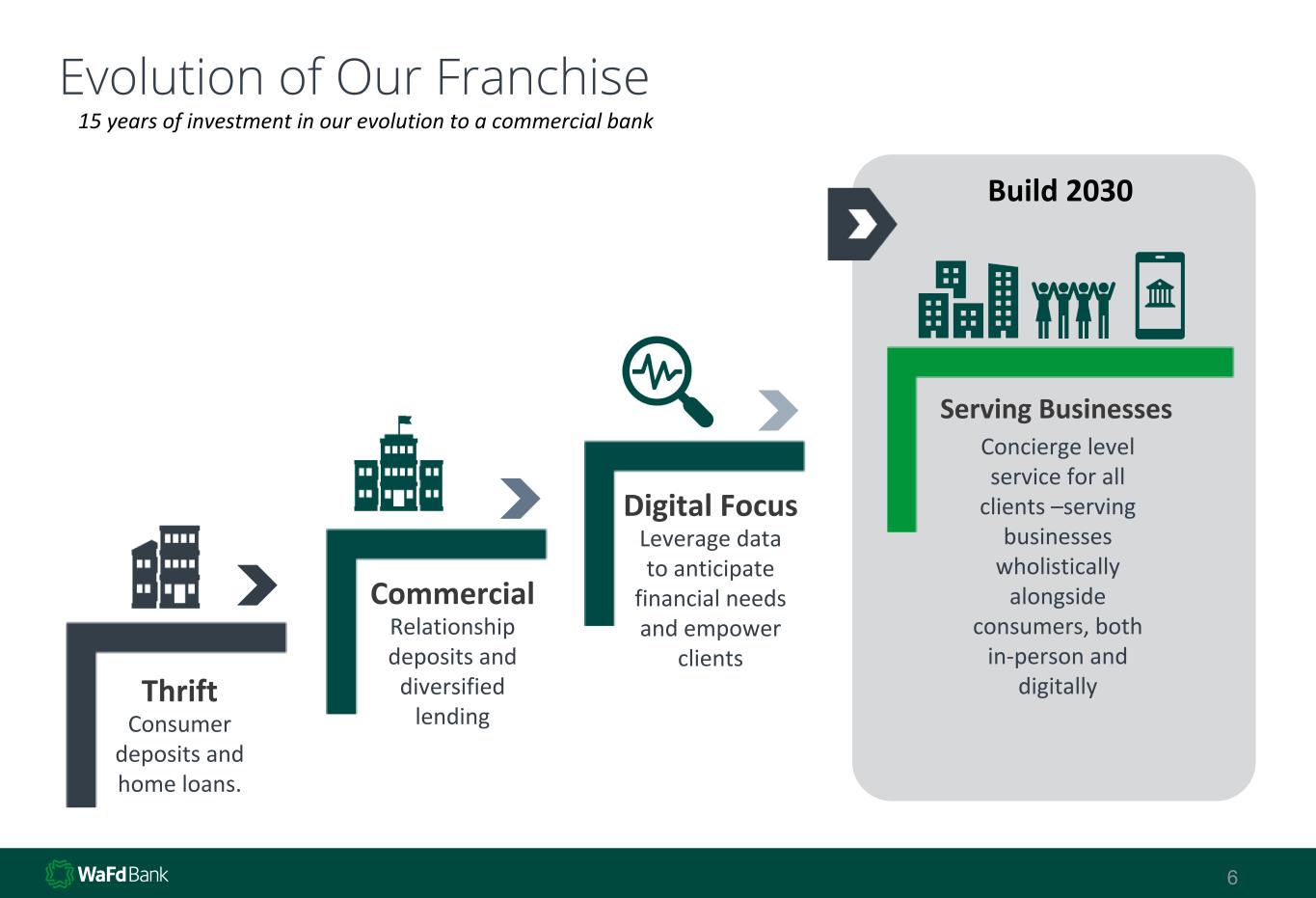 Organizational Structure & Objective: Business Banking and Commercial Real Estate Banking Segments have two primary objectives as a trusted advisor: 1.Deliver phenomenal , concierge-level customer service to all our clients - "everyone and every business deserves a WaFd banker". 2.Grow the business by delivering credit and treasury solutions that allow our clients to prosper. Build 2030 5
