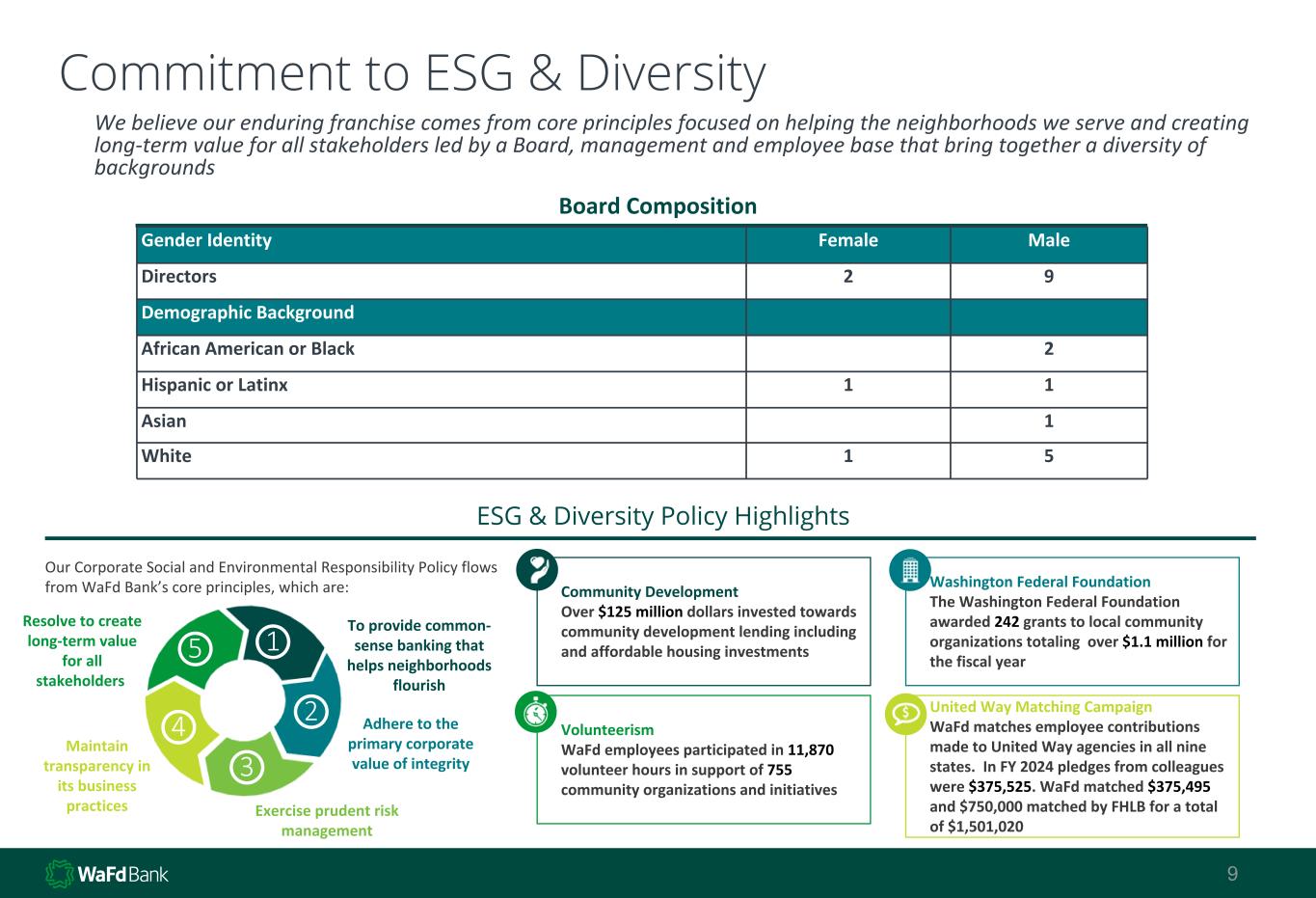 9 Commitment to ESG & Diversity We believe our enduring franchise comes from core principles focused on helping the neighborhoods we serve and creating long-term value for all stakeholders led by a Board, management and employee base that bring together a diversity of backgrounds Board Composition ESG & Diversity Policy Highlights Our Corporate Social and Environmental Responsibility Policy flows from WaFd Bank’s core principles, which are: To provide common- sense banking that helps neighborhoods flourish Adhere to the primary corporate value of integrity Exercise prudent risk management Maintain transparency in its business practices Resolve to create long-term value for all stakeholders 1 2 3 4 5 Community Development Over $125 million dollars invested towards community development lending including and affordable housing investments Washington Federal Foundation The Washington Federal Foundation awarded 242 grants to local community organizations totaling over $1.1 million for the fiscal year Volunteerism WaFd employees participated in 11,870 volunteer hours in support of 755 community organizations and initiatives United Way Matching Campaign WaFd matches employee contributions made to United Way agencies in all nine states. In FY 2024 pledges from colleagues were $375,525. WaFd matched $375,495 and $750,000 matched by FHLB for a total of $1,501,020 Gender Identity Female Male Directors 2 9 Demographic Background African American or Black 2 Hispanic or Latinx 1 1 Asian 1 White 1 5