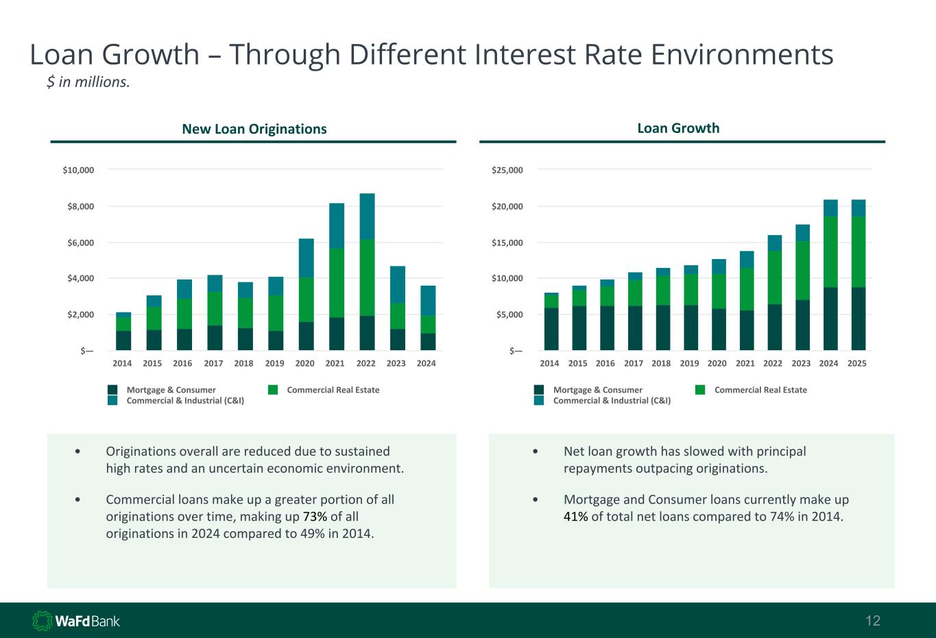12 Loan Growth – Through Different Interest Rate Environments • Net loan growth has slowed with principal repayments outpacing originations. • Mortgage and Consumer loans currently make up 41% of total net loans compared to 74% in 2014. Loan GrowthNew Loan Originations $ in millions. • Originations overall are reduced due to sustained high rates and an uncertain economic environment. • Commercial loans make up a greater portion of all originations over time, making up 73% of all originations in 2024 compared to 49% in 2014. Mortgage & Consumer Commercial Real Estate Commercial & Industrial (C&I) 2014 2015 2016 2017 2018 2019 2020 2021 2022 2023 2024 $— $2,000 $4,000 $6,000 $8,000 $10,000 Mortgage & Consumer Commercial Real Estate Commercial & Industrial (C&I) 2014 2015 2016 2017 2018 2019 2020 2021 2022 2023 2024 2025 $— $5,000 $10,000 $15,000 $20,000 $25,000