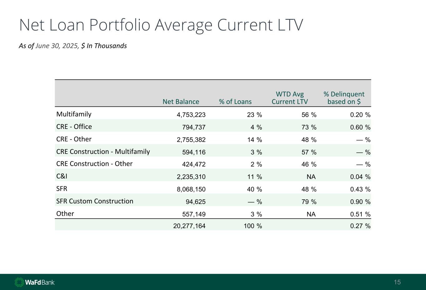 Strong Credit Quality 14 Net Loan Charge-offs (recoveries) Average NCOs Per Year – Last 20 Years Source: S&P Global, Company Filings 1 Peers represent Proxy Peers as specified in the Company’s latest Proxy Statement (1) Strong Credit Quality Characterized by Limited Charge-Offs The Bank experienced nine consecutive years of net recoveries, fiscal 2014 through fiscal 2022, during which net recoveries totaled $74.9 million. Net charge-offs have remained low through YTD 2025. 2.01% 1.23% 0.93% 0.24% (0.18)% (0.06)% (0.13)% (0.13)% (0.10)% (0.03)% (0.03)% (0.05)% (0.02)% 0.26% 0.01% 2010 2011 2012 2013 2014 2015 2016 2017 2018 2019 2020 2021 2022 2023 2024 (0.50)% —% 0.50% 1.00% 1.50% 2.00% 2.50%