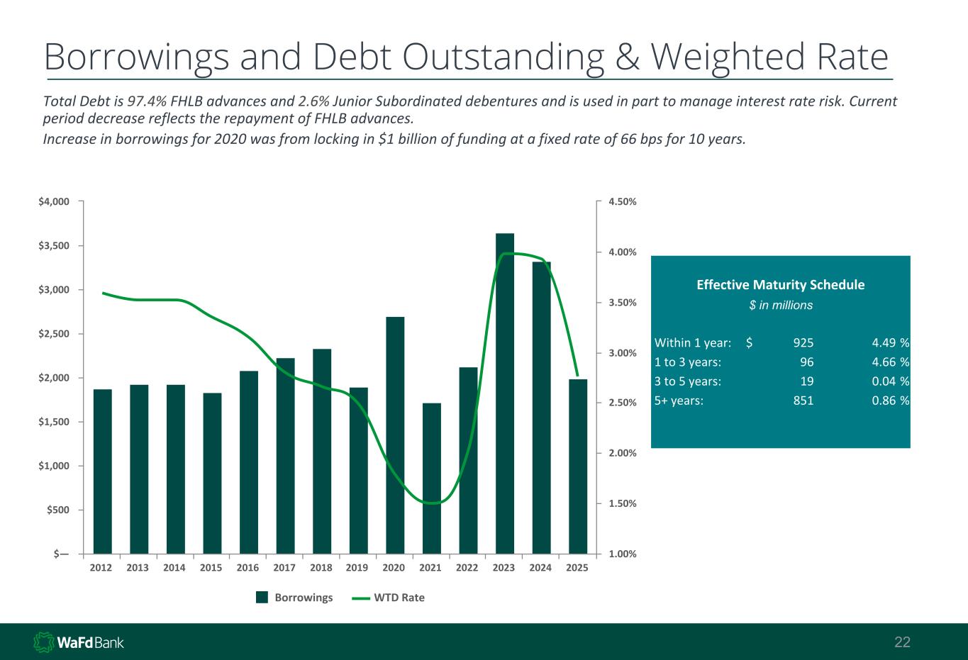 21 Deposit Flows *(Balances $ in thousands) • Deposit balances increased in FY24 as a result of the LBC merger. The merger added $3.7 billion in time deposits and $1.9 billion in transaction accounts. • 76% of deposits are collateralized or insured. Overall changes by quarter and balances by type Customer Deposit Accounts 3/31/2023 6/30/2023 9/30/2023 12/31/2023 3/31/2024 6/30/2024 9/30/2024 12/31/2024 3/31/2025 6/30/2025 Checking - Noninterest Bearing 3,070,895 2,856,165 2,729,888 2,604,281 2,482,010 2,514,310 2,500,467 2,489,394 2,400,172 2,487,816 Checking - Interest Bearing 3,971,814 4,125,554 4,124,463 4,084,933 4,579,413 4,481,465 4,486,444 4,554,922 4,625,596 4,705,457 Savings 1,002,034 943,915 817,547 777,204 771,260 733,973 718,560 714,755 715,199 703,085 Money Market 4,503,090 3,954,709 3,358,603 3,191,646 4,506,179 4,199,257 4,111,714 4,094,788 4,113,017 4,072,766 CDs 3,412,203 3,980,605 4,863,849 5,380,723 9,000,911 9,255,760 9,556,785 9,584,918 9,573,442 9,417,447 Total 15,960,036 15,860,948 15,894,350 16,038,787 21,339,773 21,184,765 21,373,970 21,438,777 21,427,426 21,386,571 Quarter % Change (0.4) % (0.6) % 1.6 % (0.5) % 33.1 % (0.7) % 0.9 % 0.3 % (0.1) % (0.2) % Quarter $ Change (69,535) (99,087) 259,476 (81,637) 5,300,986 (155,008) 189,205 64,807 (11,351) (40,855) Uninsured & Uncollateralized Deposits 4,238,629 4,033,174 4,124,355 4,182,289 5,436,402 5,238,217 5,134,192 5,317,511 5,490,142 5,094,400 % of Total Deposits 26.6 % 25.4 % 25.6 % 26.1 % 25.5 % 24.7 % 24.0 % 24.8 % 25.6 % 23.8 %