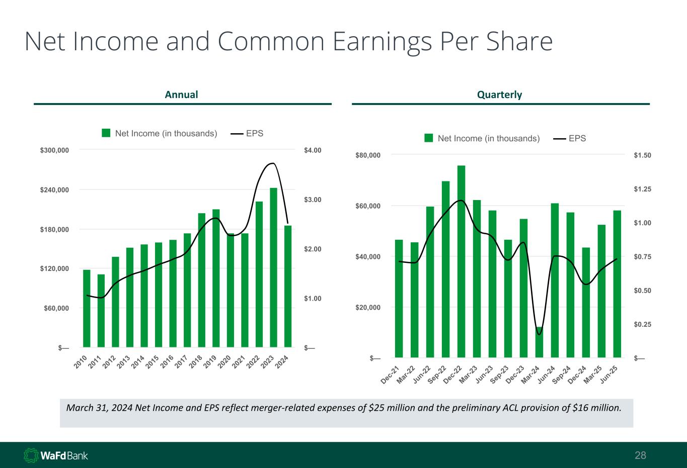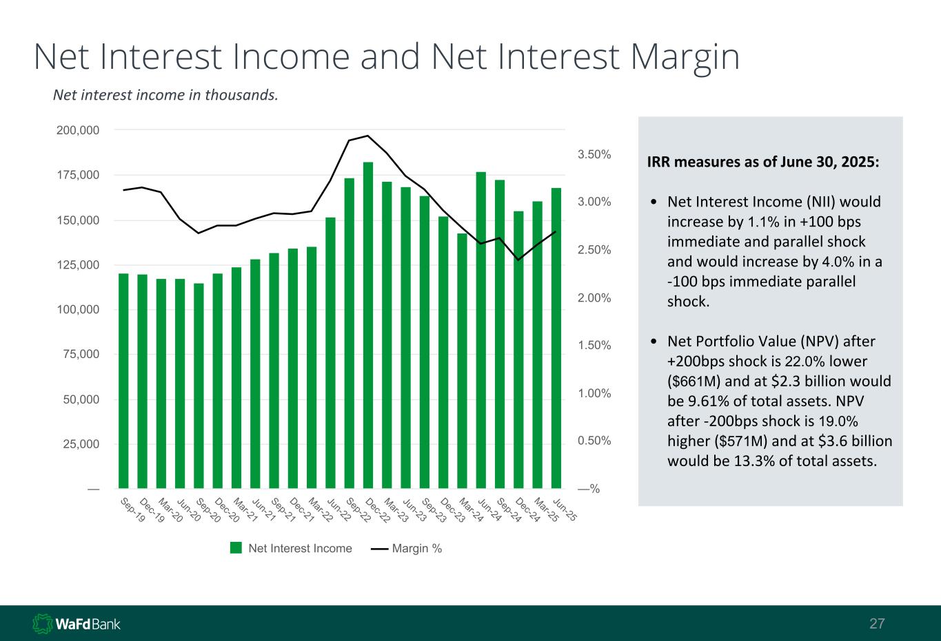 27 Net Interest Income and Net Interest Margin Net interest income in thousands. IRR measures as of June 30, 2025: • Net Interest Income (NII) would increase by 1.1% in +100 bps immediate and parallel shock and would increase by 4.0% in a -100 bps immediate parallel shock. • Net Portfolio Value (NPV) after +200bps shock is 22.0% lower ($661M) and at $2.3 billion would be 9.61% of total assets. NPV after -200bps shock is 19.0% higher ($571M) and at $3.6 billion would be 13.3% of total assets. Net Interest Income Margin % Sep-19 Dec-19 Mar-20 Jun-20 Sep-20 Dec-20 Mar-21 Jun-21 Sep-21 Dec-21 Mar-22 Jun-22 Sep-22 Dec-22 Mar-23 Jun-23 Sep-23 Dec-23 Mar-24 Jun-24 Sep-24 Dec-24 Mar-25 Jun-25 — 25,000 50,000 75,000 100,000 125,000 150,000 175,000 200,000 —% 0.50% 1.00% 1.50% 2.00% 2.50% 3.00% 3.50%