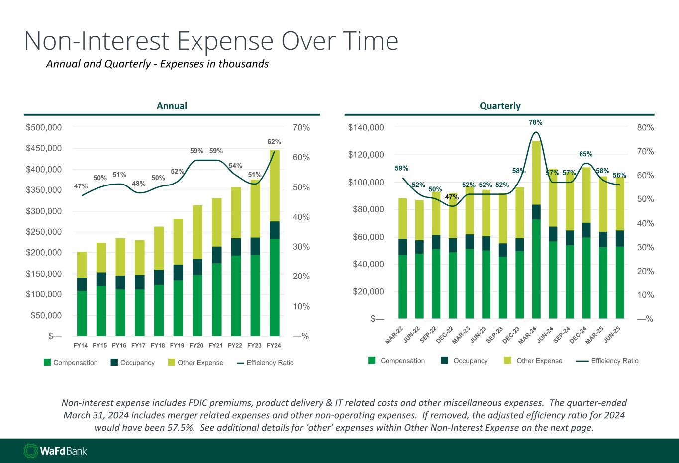 Non-Interest Income 29 Diverse sources of Non-Interest Income provide steady growth and balance our revenue profile Non-Interest Income for Quarter-Ended June 30, 2025 Non-Interest Income Over Time ($MM) Non-Interest Income / Total Loan Revenue Other Income includes: • BOLI income • Rental income • Income on equity method investments Loan Fees, 9.0% Deposit Fees, 41.5% WaFd Insurance Commissions, 25.6% Other Income, 23.9% 11% 9% 11% 16% 12% 10% 6% 5% FY 2017 FY 2018 FY 2019 FY 2020 FY 2021 FY 2022 FY 2023 FY 2024 $4.3 $3.8 $3.9 $7.3 $6.9 $7.2 $3.9 $22.6 $25.9 $24.9 $23.7 $24.7 $25.9 $26.1 $27.5 $7.8 $9.3 $10.2 $10.9 $11.9 $13.4 $14.6 $17.4 $15.4 $5.4 $13.1 $13.2 $16.7 $19.8 $8.5 $12.5 $3.5 $10.1 $30.7 $0.7 Loan Fees Deposit Fees WaFd Insurance Other Income Gain on Sale of Investments Gain on Sale of Buildings FY 2017 FY 2018 FY 2019 FY 2020 FY 2021 FY 2022 FY 2023 FY 2024