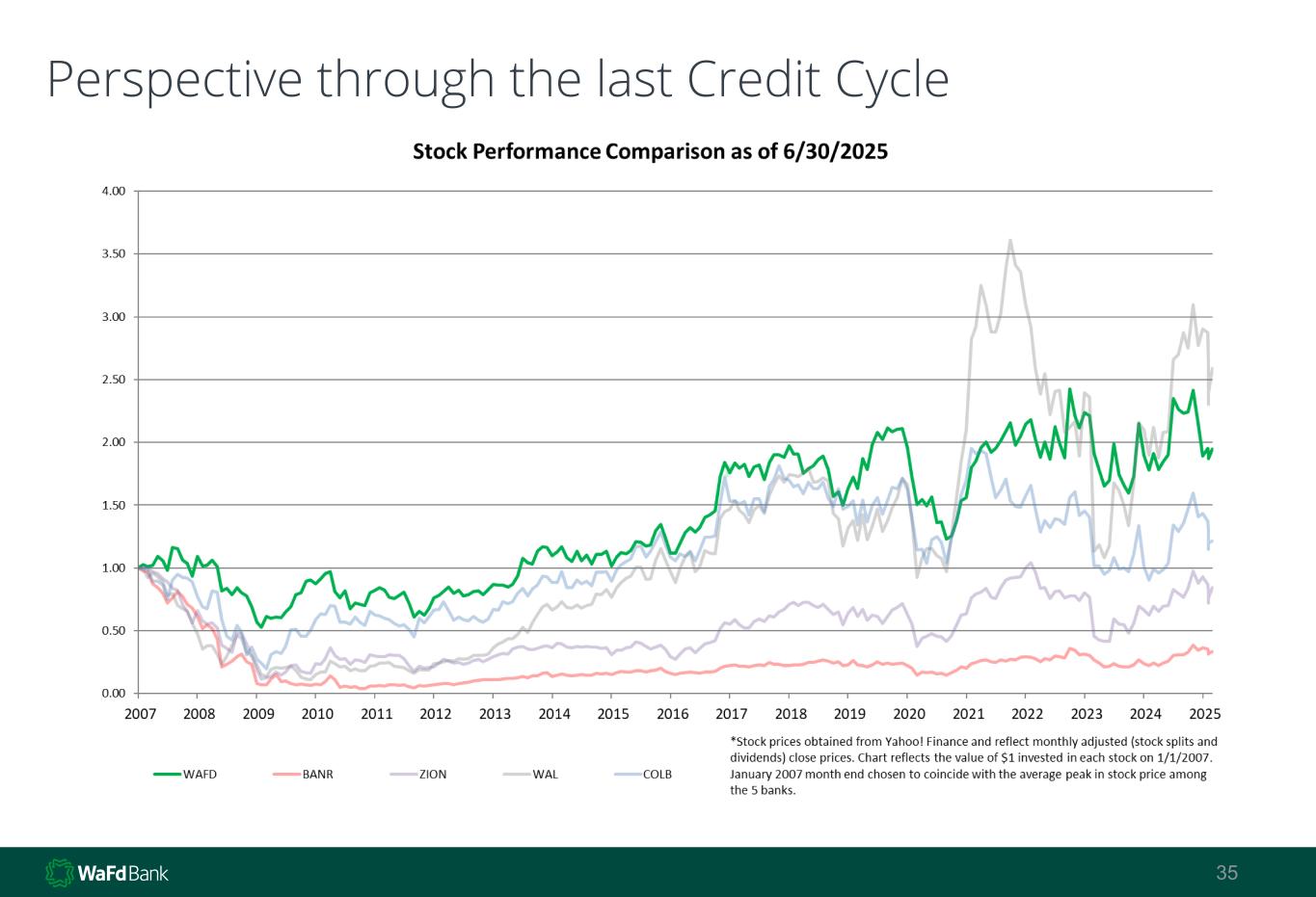 32 Capital Ratios WAFD does not seek to maximize leverage. Rather, we aspire to be the bank that can best weather the next storm on the horizon. • Source: S&P Global, Company Filings Common Equity Tier 1 Ratio WaFd Inc. Top 100 Banks Peer Banks Well Capitalized Sep 2019 Sep 2020 Sep 2021 Sep 2022 Sep 2023 Sep 2024 Jun 2025 —% 2.00% 4.00% 6.00% 8.00% 10.00% 12.00% 14.00% 16.00% Total Risk-Based Capital WaFd Inc. Top 100 Banks Peer Banks Well Capitalized Sep 2019 Sep 2020 Sep 2021 Sep 2022 Sep 2023 Sep 2024 Jun 2025 —% 2.00% 4.00% 6.00% 8.00% 10.00% 12.00% 14.00% 16.00% 18.00% TCE+ACL/Tang Assets Sep 2019 Sep 2020 Sep 2021 Sep 2022 Sep 2023 Sep 2024 Jun 2025 9.00% 9.50% 10.00% 10.50% 11.00% 11.50% 12.00%