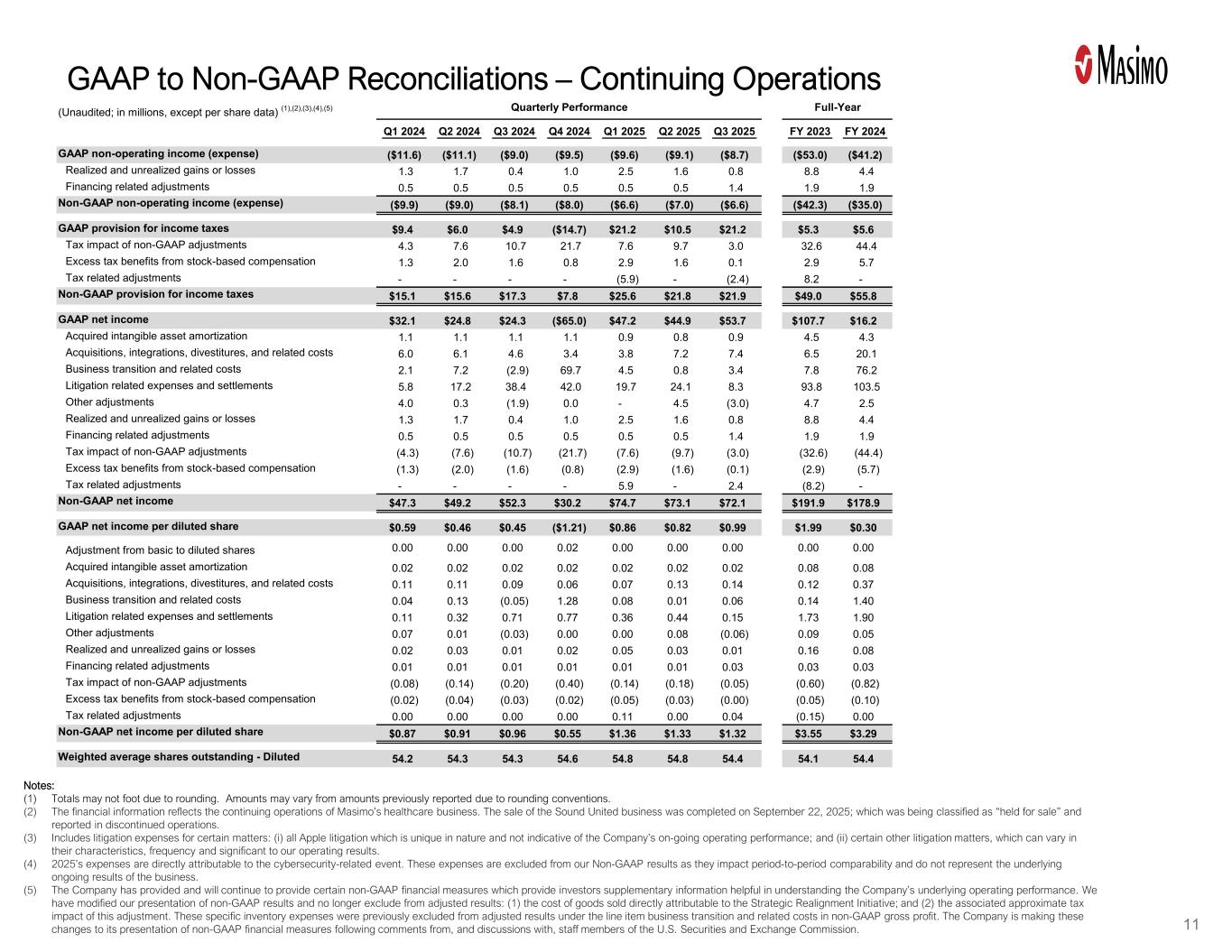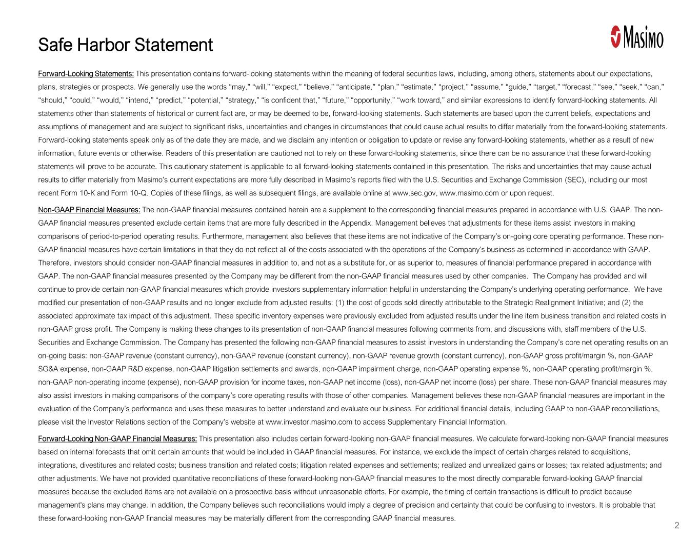 All statements other than statements of historical facts included in this press release that address activities, events or developments that we expect, believe or anticipate will or may occur in the future are forward-looking statements including, in particular, the statements about our expectations regarding updated full-year 2025 financial guidance, including GAAP and non-GAAP revenue and revenue growth percentage, operating profit/income, operating margin, net income from continuing operations, and net income from continuing operation per diluted share. These forward-looking statements are based on management’s current expectations and beliefs and are subject to uncertainties and factors, all of which are difficult to predict and many of which are beyond our control and could cause actual results to differ materially and adversely from those described in the forward-looking statements. These risks include, but are not limited to, those related to: our dependence on Masimo SET® and Masimo rainbow SET® products and technologies for substantially all of our revenue; any failure in protecting our intellectual property exposure to competitors’ assertions of intellectual property claims; the highly competitive nature of the markets in which we sell our products and technologies; any failure to continue developing innovative products and technologies; our ability to address and expand into new markets; the lack of acceptance of any of our current or future products and technologies; obtaining regulatory approval of our current and future products and technologies; the risk that the implementation of our international realignment will not continue to produce anticipated operational and financial benefits, including a continued lower effective tax rate; the loss of our customers; the failure to retain and recruit senior management; matters relating to future board and management leadership; product liability claims exposure; a failure to obtain expected returns from the amount of intangible assets we have recorded; the maintenance of our brand; the amount and type of equity awards that we may grant to employees and service providers in the future; our ongoing litigation and related matters; the possibility of disruption, disputes, litigation or unanticipated costs in connection with the non-healthcare separation; the uncertainty of the expected financial performance of Masimo following completion of the non-healthcare business separation; evolving legal, regulatory and tax regimes; potential negative effects or impact on our business from new international trade tariffs and tax law changes, changes in general economic and/or industry specific conditions; actions by third parties, including government agencies and government shutdowns; and other factors discussed in the “Risk Factors” section of our most recent periodic reports filed with the Securities and Exchange Commission (“SEC”), including our most recent Form 10-K and Form 10-Q, all of which you may obtain for free on the SEC’s website at www.sec.gov. Although we believe that the expectations reflected in our forward-looking statements are reasonable, we do not know whether our expectations will prove correct. You are cautioned not to place undue reliance on these forward-looking statements, which speak only as of the date hereof, even if subsequently made available by us on our website or otherwise. We do not undertake any obligation to update, amend or clarify these forward-looking statements, whether as a result of new information, future events or otherwise, except as may be required under applicable securities laws.