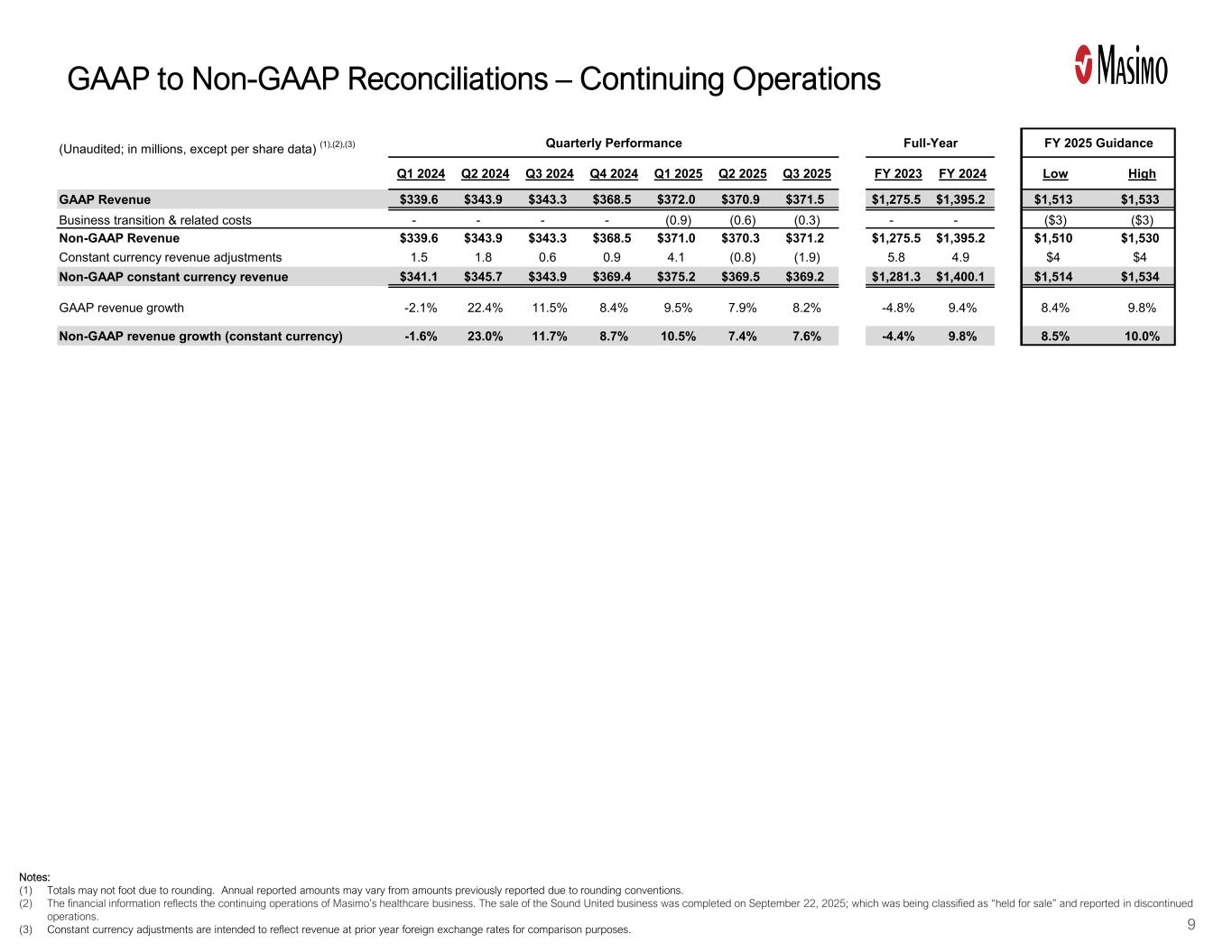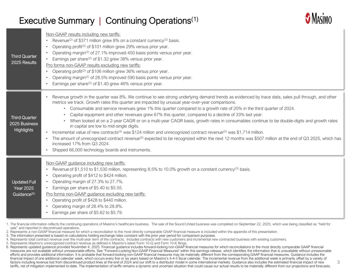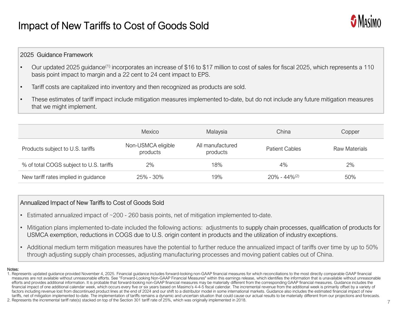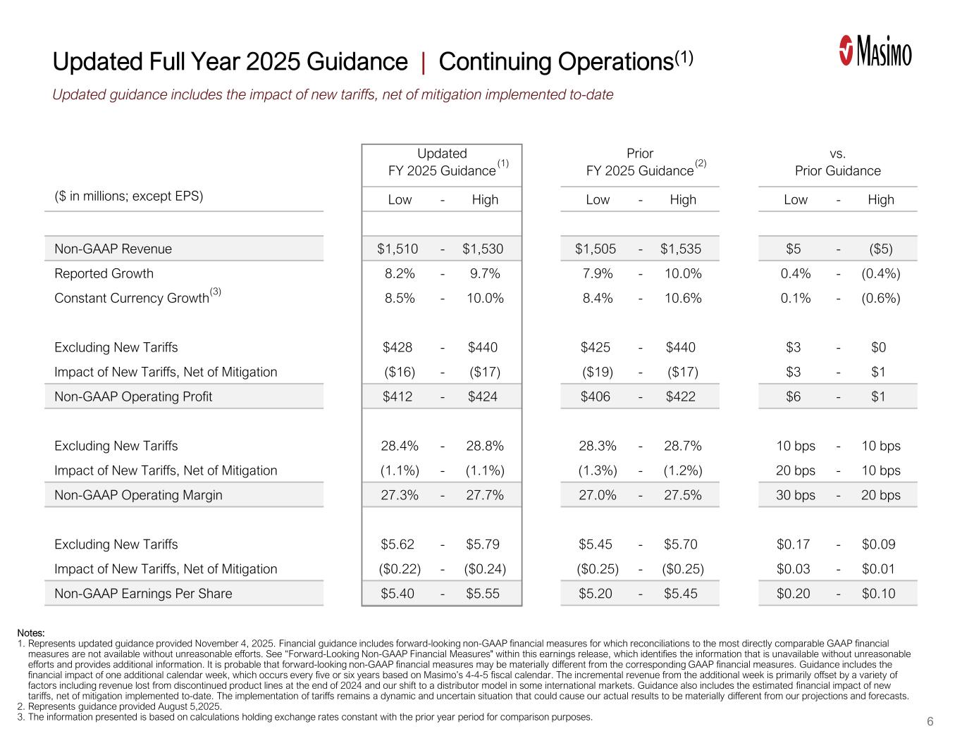 Represents updated guidance provided November 4, 2025. Financial guidance includes forward-looking non-GAAP financial measures for which reconciliations to the most directly comparable GAAP financial measures are not available without unreasonable efforts. See “Forward-Looking Non-GAAP Financial Measures” within this earnings release, which identifies the information that is unavailable without unreasonable efforts and provides additional information. It is probable that forward-looking non-GAAP financial measures may be materially different from the corresponding GAAP financial measures. Guidance includes the financial impact of one additional calendar week, which occurs every five or six years based on Masimo’s 4-4-5 fiscal calendar. The incremental revenue from the additional week is primarily offset by a variety of factors including revenue lost from discontinued product lines at the end of 2024 and our shift to a distributor model in some international markets. Guidance also includes the estimated financial impact of new tariffs, net of mitigation implemented to date. The implementation of tariffs remains a dynamic and uncertain situation that could cause our actual results to be materially different from our projections and forecasts. |