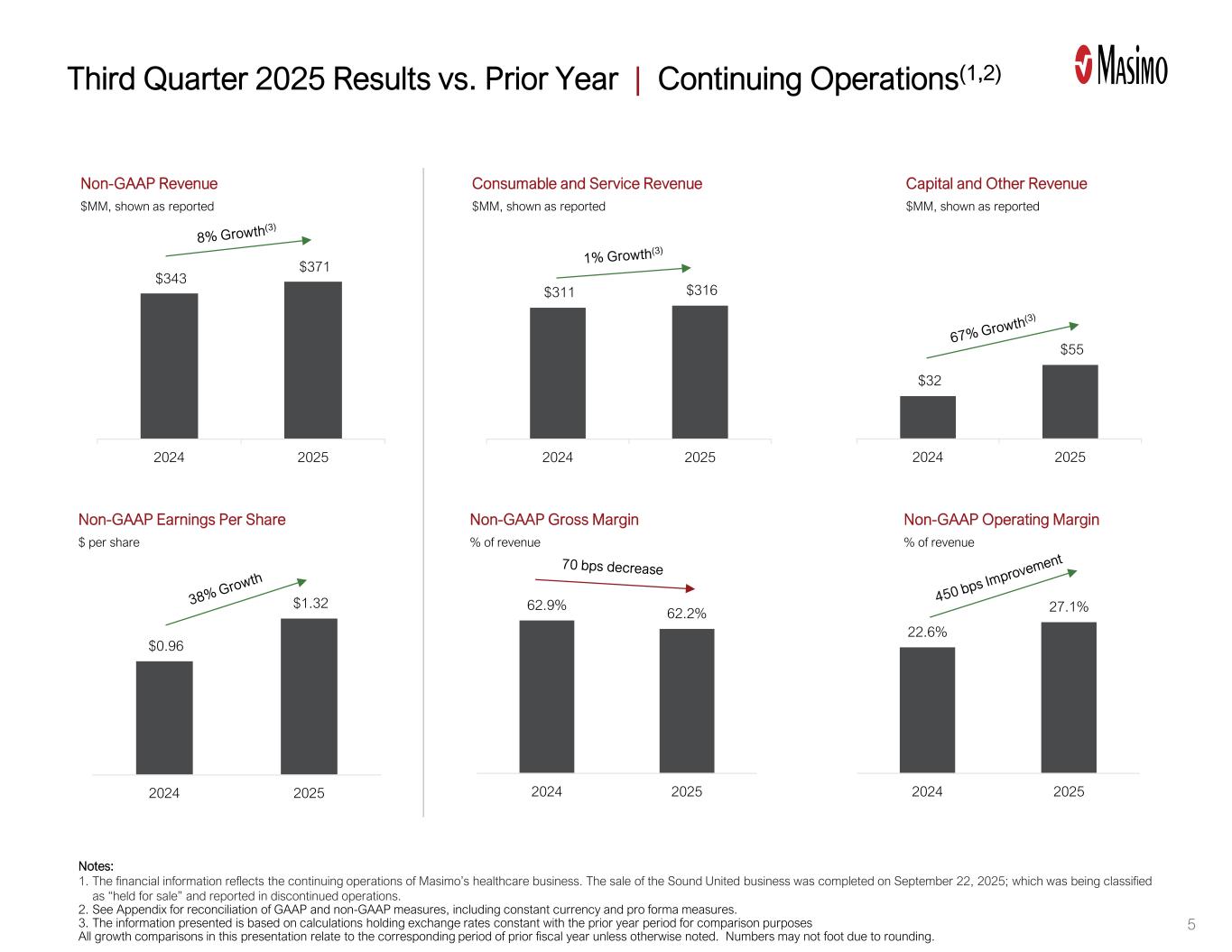 Katie Szyman, Chief Executive Officer of Masimo, said, “In the third quarter, we saw continued positive momentum across our core healthcare business, driven by the power of our innovative products. Revenues grew 8%, operating margin improved by 450 basis points, and EPS grew by 38%, all driven by sales growth and our successful operating efficiency initiatives. During the quarter, we closed the sale of Sound United to Harman and used the net proceeds to repurchase common stock. We also announced the expansion of our strategic partnership with Philips. We continue to invest in our core healthcare business to position for strong, sustainable long-term growth, and look forward to sharing more details on our strategy and innovations at our upcoming Investor Day on December 3rd.”