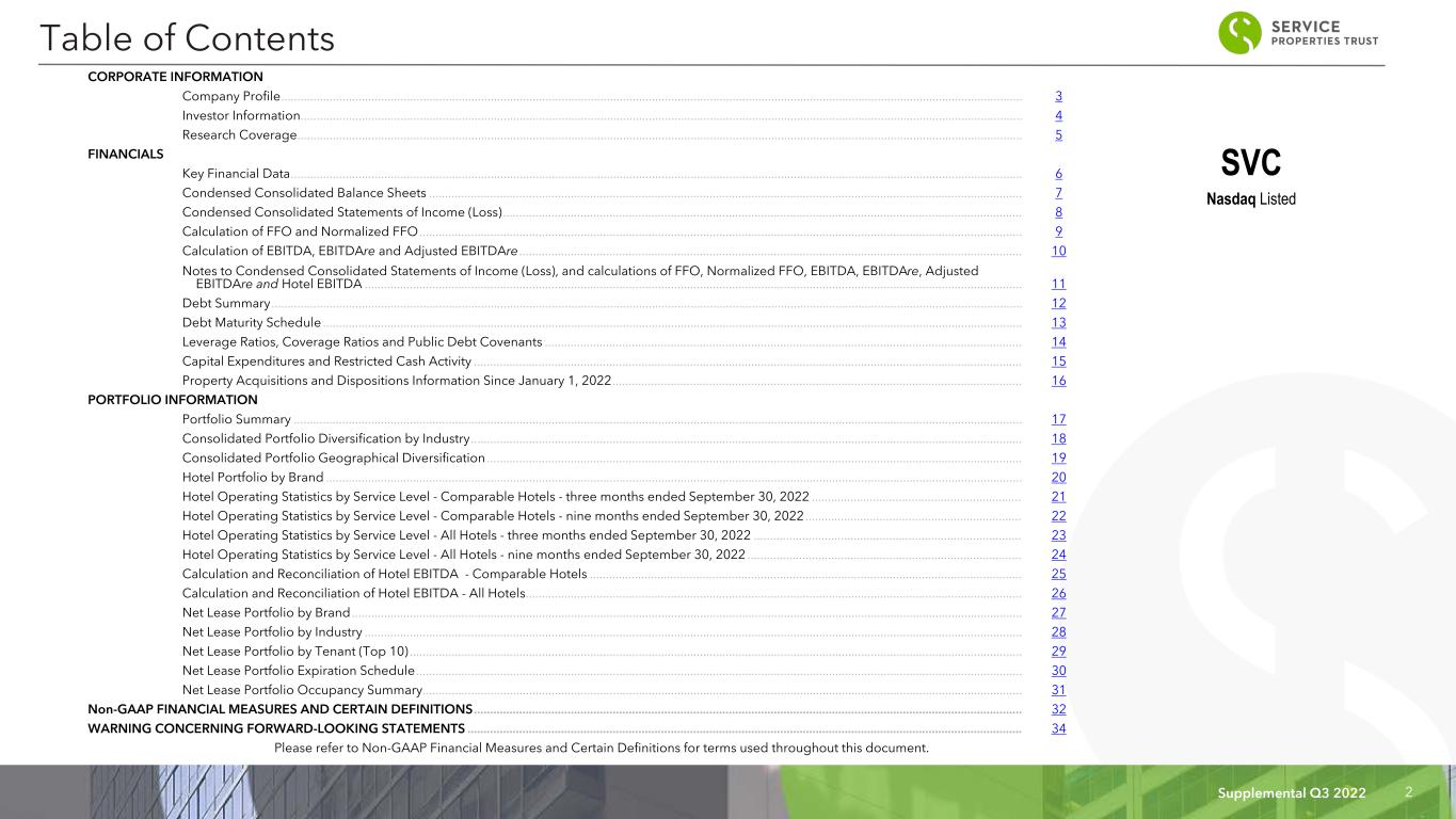 Supplemental Q3 2022 2 Table of Contents CORPORATE INFORMATION Company Profile ...................................................................................................................................................................................................................................... 3 Investor Information ................................................................................................................................................................................................................................ 4 Research Coverage ................................................................................................................................................................................................................................. 5 FINANCIALS Key Financial Data ................................................................................................................................................................................................................................... 6 Condensed Consolidated Balance Sheets ........................................................................................................................................................................................ 7 Condensed Consolidated Statements of Income (Loss) ................................................................................................................................................................. 8 Calculation of FFO and Normalized FFO ........................................................................................................................................................................................... 9 Calculation of EBITDA, EBITDAre and Adjusted EBITDAre ............................................................................................................................................................ 10 Notes to Condensed Consolidated Statements of Income (Loss), and calculations of FFO, Normalized FFO, EBITDA, EBITDAre, Adjusted EBITDAre and Hotel EBITDA ............................................................................................................................................................................................................ 11 Debt Summary ......................................................................................................................................................................................................................................... 12 Debt Maturity Schedule ......................................................................................................................................................................................................................... 13 Leverage Ratios, Coverage Ratios and Public Debt Covenants .................................................................................................................................................... 14 Capital Expenditures and Restricted Cash Activity .......................................................................................................................................................................... 15 Property Acquisitions and Dispositions Information Since January 1, 2022 ............................................................................................................................... 16 PORTFOLIO INFORMATION Portfolio Summary .................................................................................................................................................................................................................................. 17 Consolidated Portfolio Diversification by Industry ........................................................................................................................................................................... 18 Consolidated Portfolio Geographical Diversification ...................................................................................................................................................................... 19 Hotel Portfolio by Brand ........................................................................................................................................................................................................................ 20 Hotel Operating Statistics by Service Level - Comparable Hotels - three months ended September 30, 2022 ................................................................. 21 Hotel Operating Statistics by Service Level - Comparable Hotels - nine months ended September 30, 2022 ................................................................... 22 Hotel Operating Statistics by Service Level - All Hotels - three months ended September 30, 2022 ................................................................................... 23 Hotel Operating Statistics by Service Level - All Hotels - nine months ended September 30, 2022 ..................................................................................... 24 Calculation and Reconciliation of Hotel EBITDA - Comparable Hotels ...................................................................................................................................... 25 Calculation and Reconciliation of Hotel EBITDA - All Hotels .......................................................................................................................................................... 26 Net Lease Portfolio by Brand ................................................................................................................................................................................................................ 27 Net Lease Portfolio by Industry .....................................................................................................................................................................................
