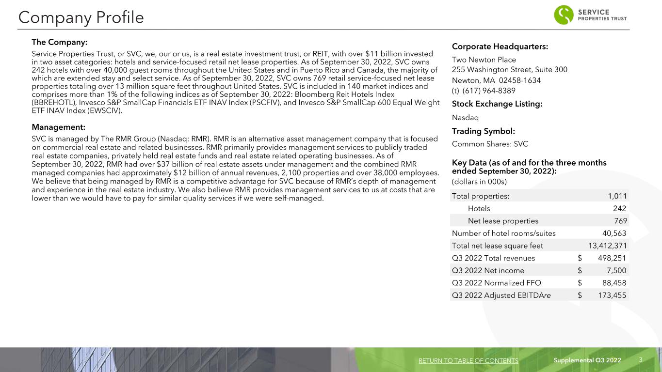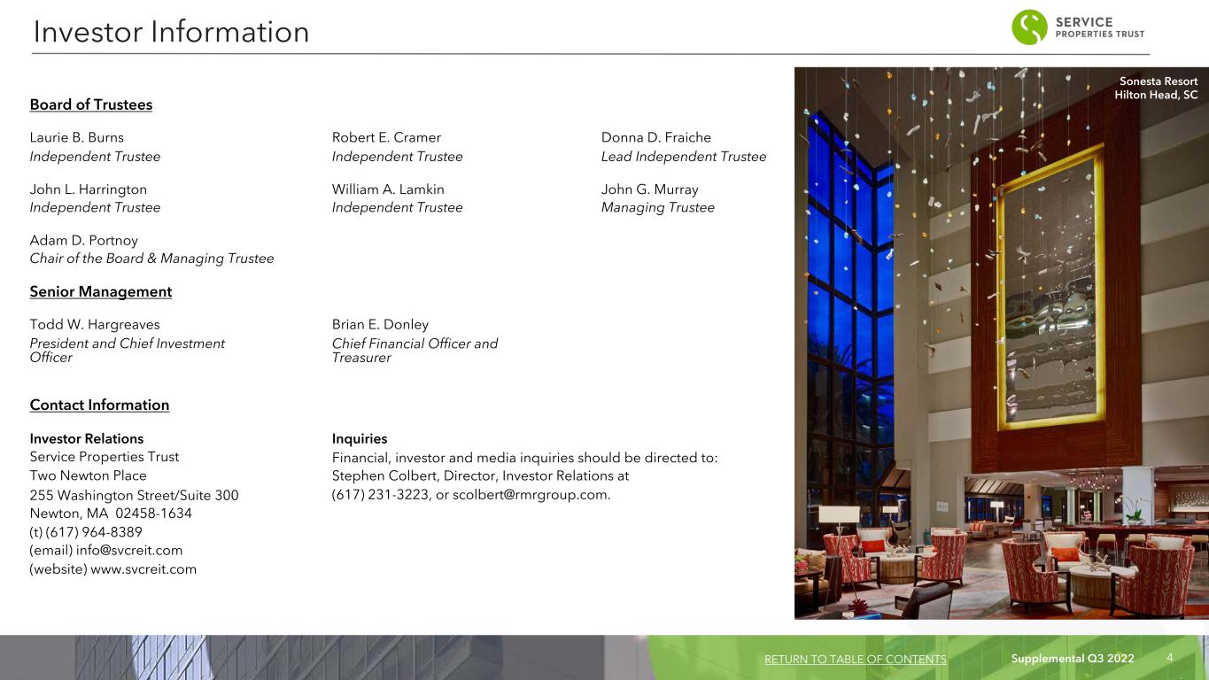 Supplemental Q3 2022 3 Corporate Headquarters: Two Newton Place 255 Washington Street, Suite 300 Newton, MA 02458-1634 (t) (617) 964-8389 Stock Exchange Listing: Nasdaq Trading Symbol: Common Shares: SVC Key Data (as of and for the three months ended September 30, 2022): (dollars in 000s) Total properties: 1,011 Hotels 242 Net lease properties 769 Number of hotel rooms/suites 40,563 Total net lease square feet 13,412,371 Q3 2022 Total revenues $ 498,251 Q3 2022 Net income $ 7,500 Q3 2022 Normalized FFO $ 88,458 Q3 2022 Adjusted EBITDAre $ 173,455 The Company: Service Properties Trust, or SVC, we, our or us, is a real estate investment trust, or REIT, with over $11 billion invested in two asset categories: hotels and service-focused retail net lease properties. As of September 30, 2022, SVC owns 242 hotels with over 40,000 guest rooms throughout the United States and in Puerto Rico and Canada, the majority of which are extended stay and select service. As of September 30, 2022, SVC owns 769 retail service-focused net lease properties totaling over 13 million square feet throughout United States. SVC is included in 140 market indices and comprises more than 1% of the following indices as of September 30, 2022: Bloomberg Reit Hotels Index (BBREHOTL), Invesco S&P SmallCap Financials ETF INAV Index (PSCFIV), and Invesco S&P SmallCap 600 Equal Weight ETF INAV Index (EWSCIV). Management: SVC is managed by The RMR Group (Nasdaq: RMR). RMR is an alternative asset management company that is focused on commercial real estate and related businesses. RMR primarily provides management services to publicly traded real estate companies, privately held real estate funds and real estate related operating businesses. As of September 30, 2022, RMR had over $37 billion of real estate assets under management and the combined RMR managed companies had approximately $12 billion of annual revenues, 2,100 properties and over 38,000 employees. We believe that being managed by RMR is a competitive advantage for SVC because of RMR’s depth of management and experience in the real estate industry. We also believe RMR provides management services to us at costs that are lower than we would have to pay for similar quality services if we were self-managed. Company Profile RETURN TO TABLE OF CONTENTS