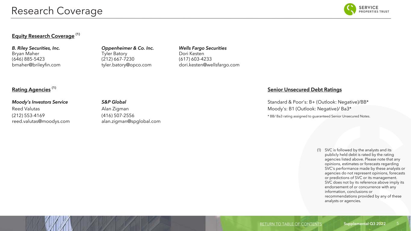 Supplemental Q3 2022 4 Board of Trustees Laurie B. Burns Robert E. Cramer Donna D. Fraiche Independent Trustee Independent Trustee Lead Independent Trustee John L. Harrington William A. Lamkin John G. Murray Independent Trustee Independent Trustee Managing Trustee Adam D. Portnoy Chair of the Board & Managing Trustee Senior Management Todd W. Hargreaves Brian E. Donley President and Chief Investment Officer Chief Financial Officer and Treasurer Contact Information Investor Relations Inquiries Service Properties Trust Financial, investor and media inquiries should be directed to: Two Newton Place Stephen Colbert, Director, Investor Relations at 255 Washington Street/Suite 300 (617) 231-3223, or scolbert@rmrgroup.com. Newton, MA 02458-1634 (t) (617) 964-8389 (email) info@svcreit.com (website) www.svcreit.com Investor Information RETURN TO TABLE OF CONTENTS Sonesta Resort Hilton Head, SC