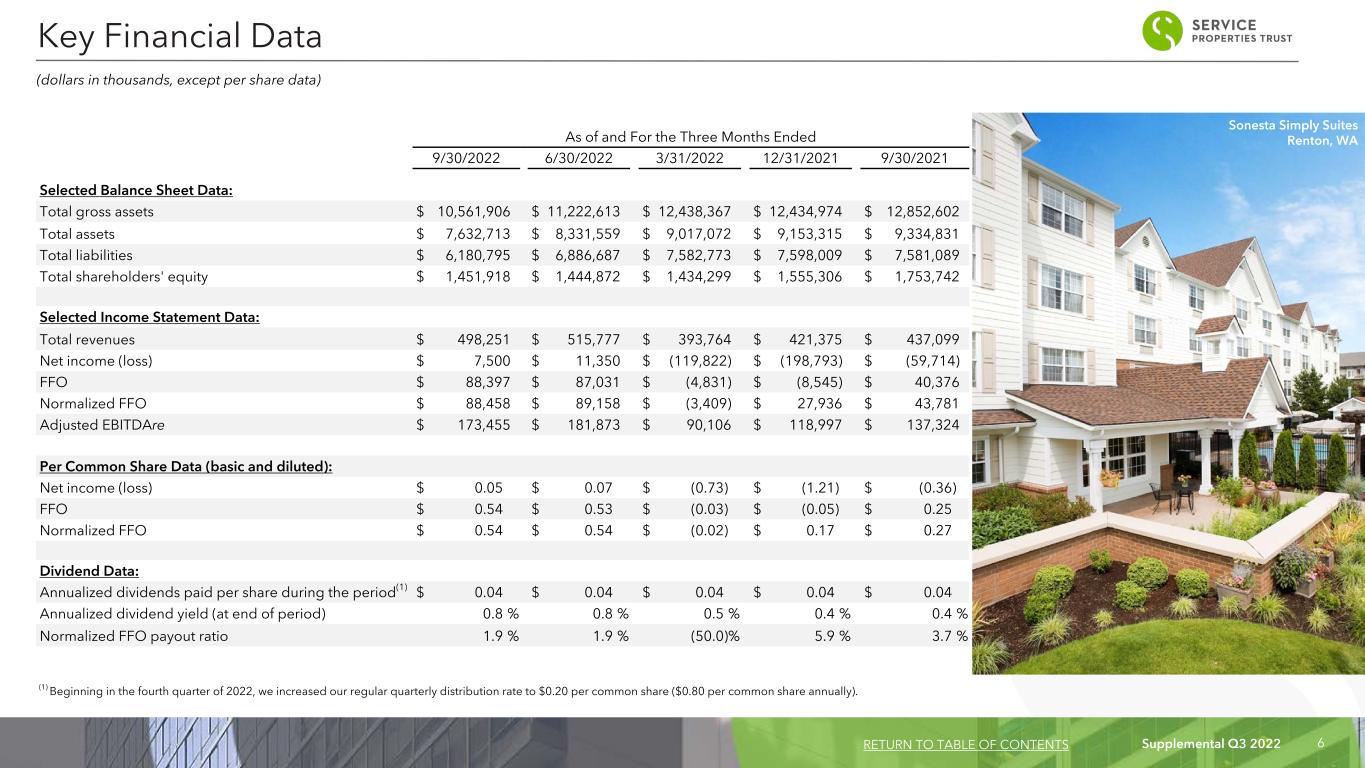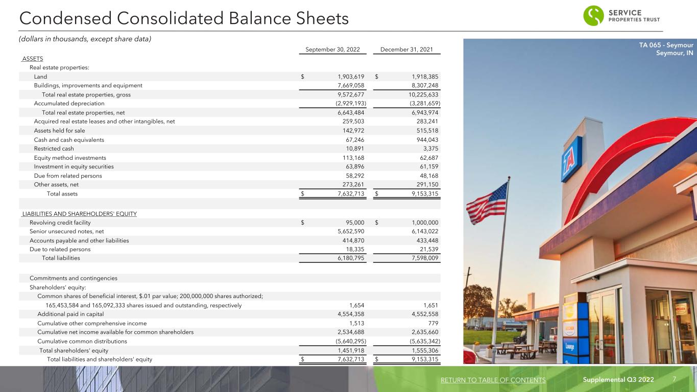 Supplemental Q3 2022 6 As of and For the Three Months Ended 9/30/2022 6/30/2022 3/31/2022 12/31/2021 9/30/2021 Selected Balance Sheet Data: Total gross assets $ 10,561,906 $ 11,222,613 $ 12,438,367 $ 12,434,974 $ 12,852,602 Total assets $ 7,632,713 $ 8,331,559 $ 9,017,072 $ 9,153,315 $ 9,334,831 Total liabilities $ 6,180,795 $ 6,886,687 $ 7,582,773 $ 7,598,009 $ 7,581,089 Total shareholders' equity $ 1,451,918 $ 1,444,872 $ 1,434,299 $ 1,555,306 $ 1,753,742 Selected Income Statement Data: Total revenues $ 498,251 $ 515,777 $ 393,764 $ 421,375 $ 437,099 Net income (loss) $ 7,500 $ 11,350 $ (119,822) $ (198,793) $ (59,714) FFO $ 88,397 $ 87,031 $ (4,831) $ (8,545) $ 40,376 Normalized FFO $ 88,458 $ 89,158 $ (3,409) $ 27,936 $ 43,781 Adjusted EBITDAre $ 173,455 $ 181,873 $ 90,106 $ 118,997 $ 137,324 Per Common Share Data (basic and diluted): Net income (loss) $ 0.05 $ 0.07 $ (0.73) $ (1.21) $ (0.36) FFO $ 0.54 $ 0.53 $ (0.03) $ (0.05) $ 0.25 Normalized FFO $ 0.54 $ 0.54 $ (0.02) $ 0.17 $ 0.27 Dividend Data: Annualized dividends paid per share during the period(1) $ 0.04 $ 0.04 $ 0.04 $ 0.04 $ 0.04 Annualized dividend yield (at end of period) 0.8 % 0.8 % 0.5 % 0.4 % 0.4 % Normalized FFO payout ratio 1.9 % 1.9 % (50.0) % 5.9 % 3.7 % (dollars in thousands, except per share data) Key Financial Data RETURN TO TABLE OF CONTENTS Sonesta Simply Suites Renton, WA (1) Beginning in the fourth quarter of 2022, we increased our regular quarterly distribution rate to $0.20 per common share ($0.80 per common share annually).