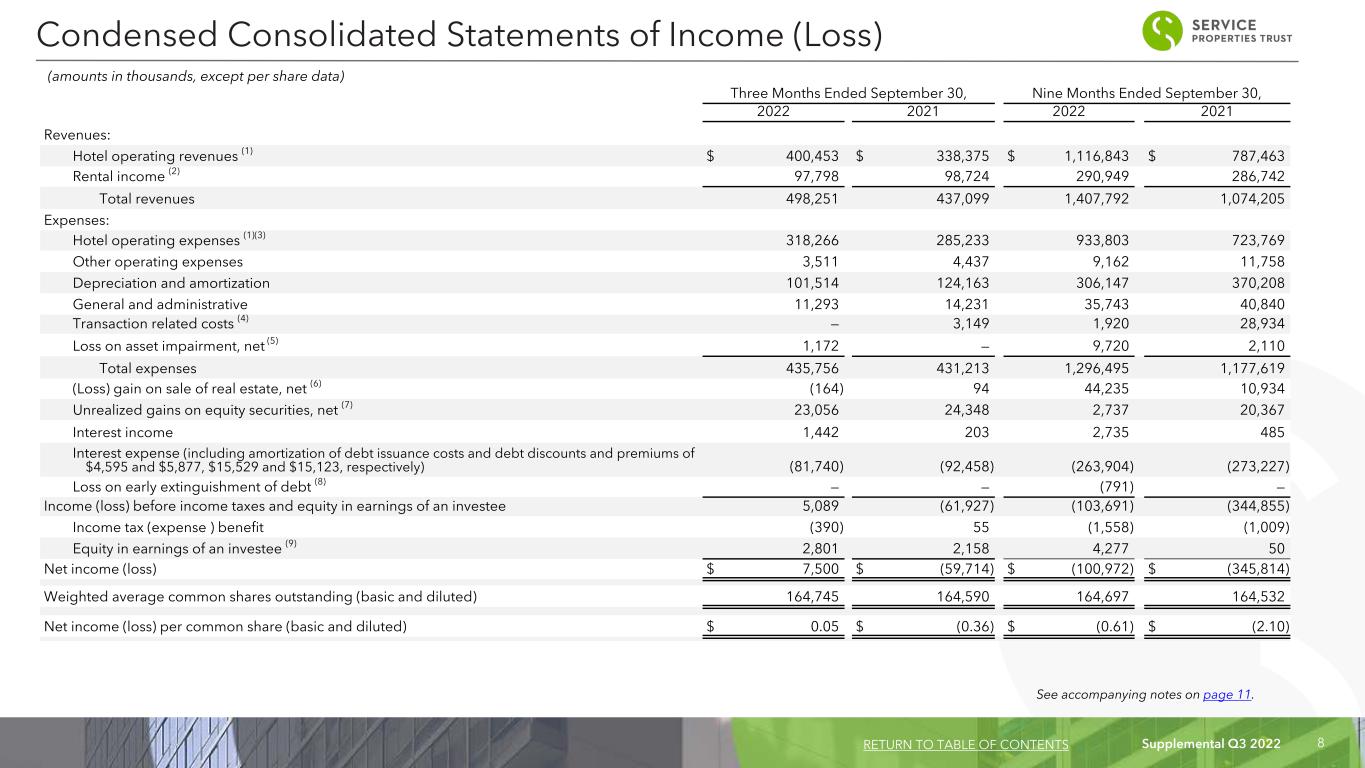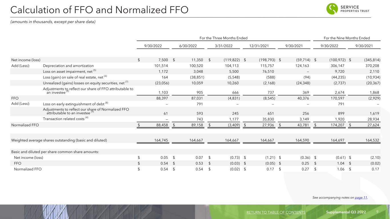 Supplemental Q3 2022 8 Three Months Ended September 30, Nine Months Ended September 30, 2022 2021 2022 2021 Revenues: Hotel operating revenues (1) $ 400,453 $ 338,375 $ 1,116,843 $ 787,463 Rental income (2) 97,798 98,724 290,949 286,742 Total revenues 498,251 437,099 1,407,792 1,074,205 Expenses: Hotel operating expenses (1)(3) 318,266 285,233 933,803 723,769 Other operating expenses 3,511 4,437 9,162 11,758 Depreciation and amortization 101,514 124,163 306,147 370,208 General and administrative 11,293 14,231 35,743 40,840 Transaction related costs (4) — 3,149 1,920 28,934 Loss on asset impairment, net (5) 1,172 — 9,720 2,110 Total expenses 435,756 431,213 1,296,495 1,177,619 (Loss) gain on sale of real estate, net (6) (164) 94 44,235 10,934 Unrealized gains on equity securities, net (7) 23,056 24,348 2,737 20,367 Interest income 1,442 203 2,735 485 Interest expense (including amortization of debt issuance costs and debt discounts and premiums of $4,595 and $5,877, $15,529 and $15,123, respectively) (81,740) (92,458) (263,904) (273,227) Loss on early extinguishment of debt (8) — — (791) — Income (loss) before income taxes and equity in earnings of an investee 5,089 (61,927) (103,691) (344,855) Income tax (expense ) benefit (390) 55 (1,558) (1,009) Equity in earnings of an investee (9) 2,801 2,158 4,277 50 Net income (loss) $ 7,500 $ (59,714) $ (100,972) $ (345,814) Weighted average common shares outstanding (basic and diluted) 164,745 164,590 164,697 164,532 Net income (loss) per common share (basic and diluted) $ 0.05 $ (0.36) $ (0.61) $ (2.10) (amounts in thousands, except per share data) Condensed Consolidated Statements of Income (Loss) RETURN TO TABLE OF CONTENTS See accompanying notes on page 11.