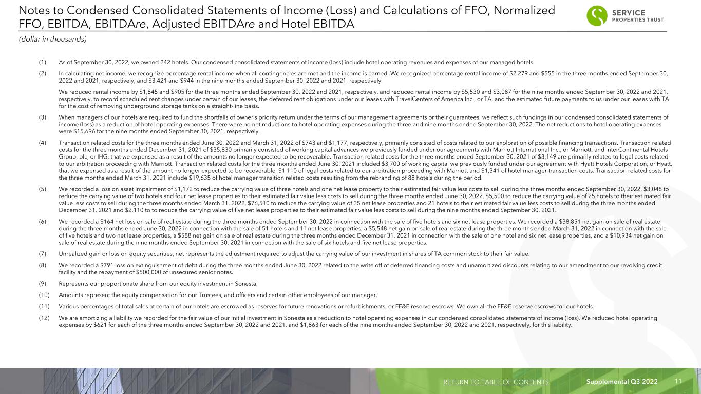 Supplemental Q3 2022 10 For the Three Months Ended For the For the Nine Months Ended 9/30/2022 6/30/2022 3/31/2022 12/31/2021 9/30/2021 9/30/2022 9/30/2021 Net income (loss) $ 7,500 $ 11,350 $ (119,822) $ (198,793) $ (59,714) $ (100,972) $ (345,814) Add (Less): Interest expense 81,740 89,820 92,344 92,494 92,458 263,904 273,227 Income tax (benefit) expense 390 473 695 (1,950) (55) 1,558 1,009 Depreciation and amortization 101,514 100,520 104,113 115,757 124,163 306,147 370,208 EBITDA 191,144 202,163 77,330 7,508 156,852 470,637 298,630 Add (Less): Loss on asset impairment, net (5) 1,172 3,048 5,500 76,510 — 9,720 2,110 (Gain) loss on sale of real estate, net (6) 164 (38,851) (5,548) (588) (94) (44,235) (10,934) Adjustments to reflect our share of EBITDAre attributable to an investee (9) 2,787 2,074 680 781 464 5,541 2,123 EBITDAre 195,267 168,434 77,962 84,211 157,222 441,663 291,929 Add (less): Unrealized (gains) losses on equity securities, net (7) (23,056) 10,059 10,260 (2,168) (24,348) (2,737) (20,367) Loss on early extinguishment of debt (8) — 791 — — — 791 — Adjustments to reflect our share of Adjusted EBITDAre attributable to an investee (9) 272 1,014 280 651 256 1,566 1,619 Transaction related costs (4) — 743 1,177 35,830 3,149 1,920 28,934 General and administrative expense paid in common shares (10) 972 832 462 473 1,045 2,266 2,490 Adjusted EBITDAre $ 173,455 $ 181,873 $ 90,141 $ 118,997 $ 137,324 $ 445,469 $ 304,605 Calculation of EBITDA, EBITDAre and Adjusted EBITDAre (dollars in thousands) See accompanying notes on page 11. RETURN TO TABLE OF CONTENTS