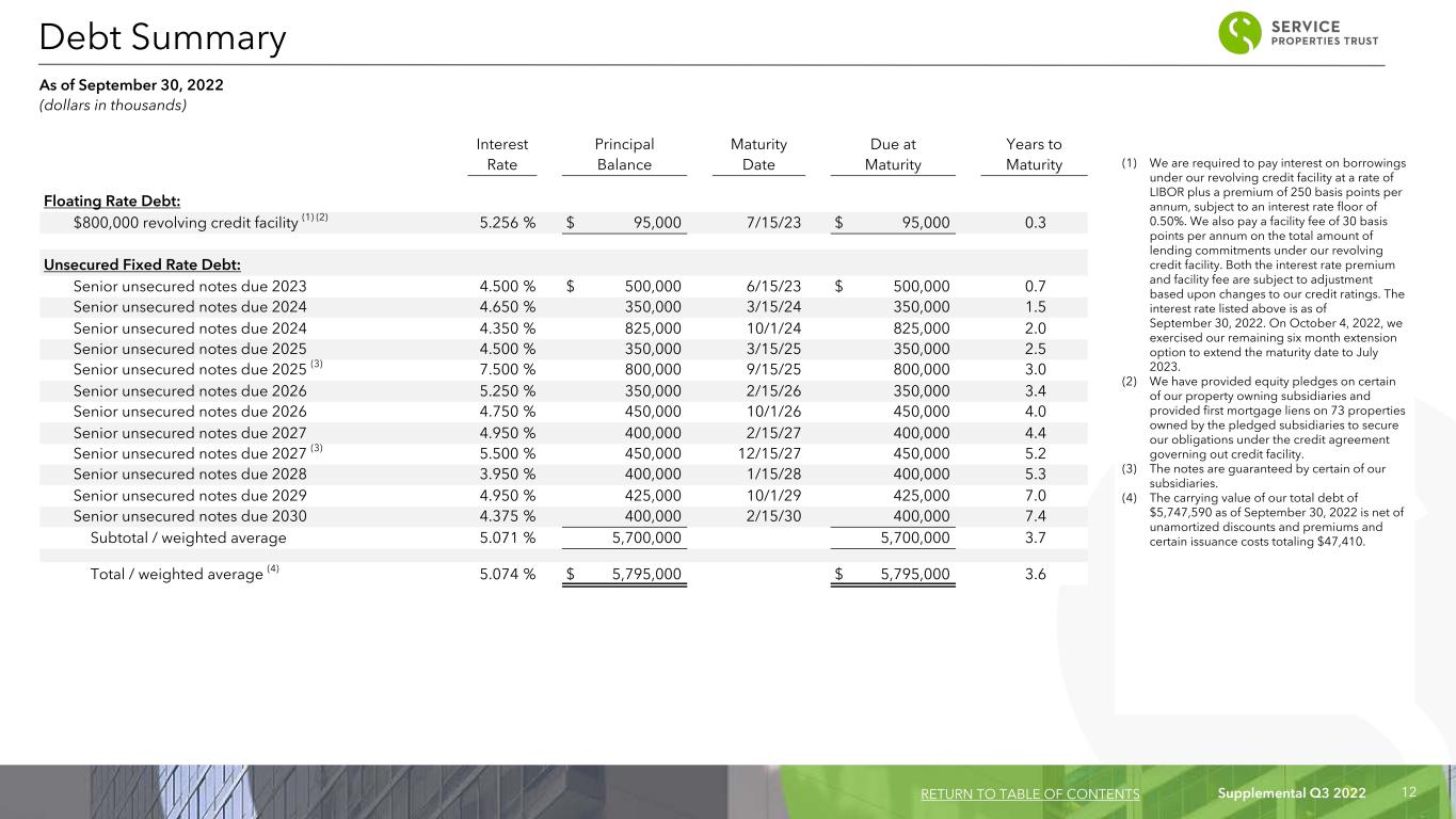 Supplemental Q3 2022 11 Notes to Condensed Consolidated Statements of Income (Loss) and Calculations of FFO, Normalized FFO, EBITDA, EBITDAre, Adjusted EBITDAre and Hotel EBITDA (dollar in thousands) RETURN TO TABLE OF CONTENTS (1) As of September 30, 2022, we owned 242 hotels. Our condensed consolidated statements of income (loss) include hotel operating revenues and expenses of our managed hotels. (2) In calculating net income, we recognize percentage rental income when all contingencies are met and the income is earned. We recognized percentage rental income of $2,279 and $555 in the three months ended September 30, 2022 and 2021, respectively, and $3,421 and $944 in the nine months ended September 30, 2022 and 2021, respectively. We reduced rental income by $1,845 and $905 for the three months ended September 30, 2022 and 2021, respectively, and reduced rental income by $5,530 and $3,087 for the nine months ended September 30, 2022 and 2021, respectively, to record scheduled rent changes under certain of our leases, the deferred rent obligations under our leases with TravelCenters of America Inc., or TA, and the estimated future payments to us under our leases with TA for the cost of removing underground storage tanks on a straight-line basis. (3) When managers of our hotels are required to fund the shortfalls of owner’s priority return under the terms of our management agreements or their guarantees, we reflect such fundings in our condensed consolidated statements of income (loss) as a reduction of hotel operating expenses. There were no net reductions to hotel operating expenses during the three and nine months ended September 30, 2022. The net reductions to hotel operating expenses were $15,696 for the nine months ended September 30, 2021, respectively. (4) Transaction related costs for the three months ended June 30, 2022 and March 31, 2022 of $743 and $1,177, respectively, primarily consisted of costs related to our exploration of possible financing transactions. Transaction related costs for the three months ended December 31, 2021 of $35,830 primarily consisted of working capital advances we previously funded under our agreements with Marriott International Inc., or Marriott, and InterContinental Hotels Group, plc, or IHG, that we expensed as a result of the amounts no longer expected to be recoverable. Transaction related costs for the three months ended September 30, 2021 of $3,149 are primarily related to legal costs related to our arbitration proceeding with Marriott. Transaction related costs for the three months ended June 30, 2021 included $3,700 of working capital we previously funded under our agreement with Hyatt Hotels Corporation, or Hyatt, that we expensed as a result of the amount no longer expected to be recoverable, $1,110 of legal costs related to our arbitration proceeding with Marriott and $1,341 of hotel manager transaction costs. Transaction related costs for the three months ended March 31, 2021 include $19,635 of hotel manager transition related costs resulting from the rebranding of 88 hotels during the period. (5) We recorded a loss on asset impairment of $1,172 to reduce the carrying value of three hotels and one net lease property to their estimated fair value less costs to sell during the three months ended September 30, 2022, $3,048 to reduce the carrying value of two hotels and four net lease properties to their estimated fair value less costs to sell during the three months ended June 30, 2022, $5,500 to reduce the carrying value of 25 hotels to their estimated fair value less costs to sell during the three months ended March 31, 2022, $76,510 to reduce the carrying value of 35 net lease properties and 21 hotels to their estimated fair value less costs to sell during the three months ended December 31, 2021 and $2,110 to to reduce the carrying value of five net lease properties to their estimated fair value less costs to sell during the nine months ended September 30, 2021. (6) We recorded a $164 net loss on sale of real estate during the three months ended September 30, 2022 in connection with the sale of five hotels and six net lease properties. We recorded a $38,851 net gain on sale of real estate during the three months ended June 30, 2022 in connection with the sale of 51 hotels and 11 net lease properties, a $5,548 net gain on sale of real estate during the three months ended March 31, 2022 in connection with the sale of five hotels and two net lease properties, a $588 net gain on sale of real estate during the three months ended December 31, 2021 in connection with the sale of one hotel and six net lease properties, and a $10,934 net gain on sale of real estate during the nine months ended September 30, 2021 in connection with the sale of six hotels and five net lease properties. (7) Unrealized gain or loss on equity securities, net represents the adjustment required to adjust the carrying value of our investment in shares of TA common stock to their fair value. (8) We recorded a $791 loss on extinguishment of debt during the three months ended June 30, 2022 related to the write off of deferred financing costs and unamortized discounts relating to our amendment to our revolving credit facility and the repayment of $500,000 of unsecured senior notes. (9) Represents our proportionate share from our equity investment in Sonesta. (10) Amounts represent the equity compensation for our Trustees, and officers and certain other employees of our manager. (11) Various percentages of total sales at certain of our hotels are escrowed as reserves for future renovations or refurbishments, or FF&E reserve escrows. We own all the FF&E reserve escrows for our hotels. (12) We are amortizing a liability we recorded for the fair value of our initial investment in Sonesta as a reduction to hotel operating expenses in our condensed consolidated statements of income (loss). We reduced hotel operating expenses by $621 for each of the three months ended Septemb