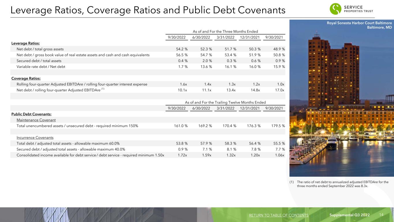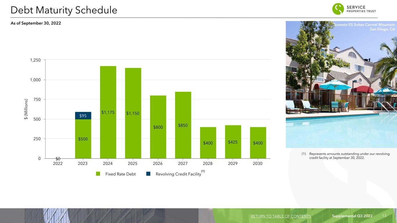 Supplemental Q3 2022 13 (1) Represents amounts outstanding under our revolving credit facility at September 30, 2022. $ (M ill io ns ) $0 $500 $1,175 $1,150 $800 $850 $400 $425 $400 $— $95 Fixed Rate Debt Revolving Credit Facility 2022 2023 2024 2025 2026 2027 2028 2029 2030 0 250 500 750 1,000 1,250 Debt Maturity Schedule As of September 30, 2022 RETURN TO TABLE OF CONTENTS (1) Sonesta ES Suites Carmel Mountain San Diego, CA
