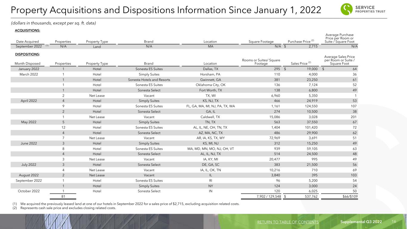 Supplemental Q3 2022 15 Capital Expenditures For the Three Months Ended 9/30/2022 6/30/2022 3/31/2022 12/31/2021 9/30/2021 Hotel capital improvements & FF&E Reserve fundings (1) $ 22,841 $ 17,517 $ 28,144 $ 30,010 $ 19,384 Net lease capital improvements 1,520 3,190 740 402 403 Total capital improvements & FF&E Reserve fundings $ 24,361 $ 20,707 $ 28,884 $ 30,412 $ 19,787 Restricted Cash As of and For the Three Months Ended 9/30/2022 6/30/2022 3/31/2022 12/31/2021 9/30/2021 Total restricted cash (beginning of period) 64,901 2,963 3,375 1,657 1,295 Manager deposits into FF&E Reserve 2,700 2,425 1,408 1,312 1,393 SVC fundings into FF&E Reserve: Marriott — — — 75 69 Hotel improvements funded from FF&E Reserve (1,577) (1,072) (787) (702) (1,100) FF&E reserves (end of period) 66,024 4,316 3,996 2,342 1,657 Proceeds from asset sales deposited into (withdrawn) revolving credit facility collateral account, net (55,133) 60,585 (1,033) 1,033 — Total restricted cash (end of period) $ 10,891 $ 64,901 $ 2,963 $ 3,375 $ 1,657 (1) Includes amounts we funded into our FF&E reserves and amounts directly reimbursed to our hotel managers for capital expenditures. (dollars in thousands) Capital Expenditures and Restricted Cash Activity RETURN TO TABLE OF CONTENTS The Clift Royal Sonesta San Francisco, CA