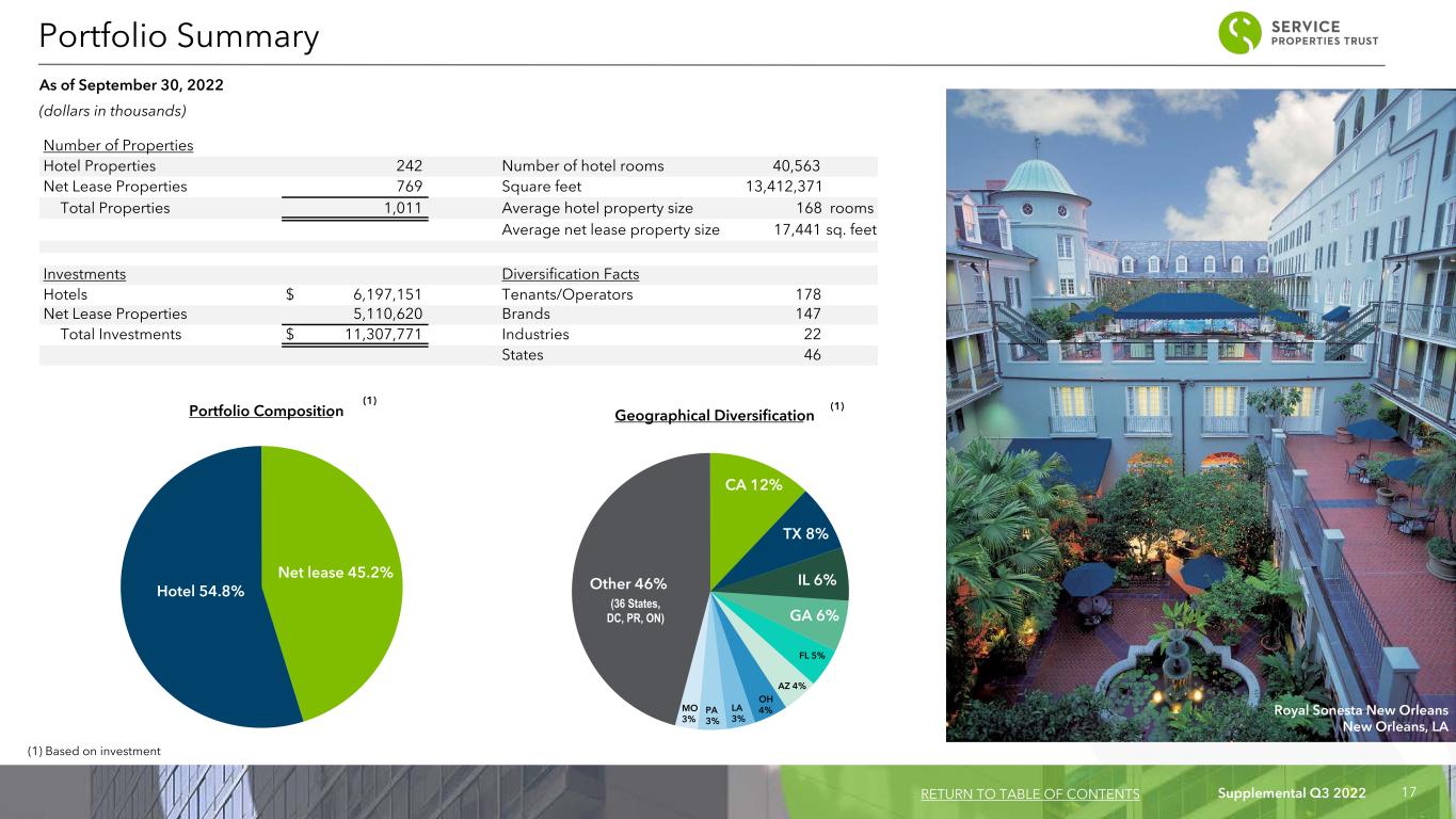 Supplemental Q3 2022 16 ACQUISITIONS: Square Footage Purchase Price (2) Average Purchase Price per Room or Suite / Square FootDate Acquired Properties Property Type Brand Location September 2022 (1) N/A Land N/A MA N/A $ 2,715 N/A DISPOSITIONS: Rooms or Suites/ Square Footage Average Sales Price per Room or Suite / Square FootMonth Disposed Properties Property Type Brand Location Sales Price (2) January 2022 1 Hotel Sonesta ES Suites Dallas, TX 295 $ 19,000 $ 64 March 2022 1 Hotel Simply Suites Horsham, PA 110 4,000 36 1 Hotel Sonesta Hotels and Resorts Gwinnett, GA 381 23,250 61 1 Hotel Sonesta ES Suites Oklahoma City, OK 136 7,124 52 1 Hotel Sonesta Select Fort Worth, TX 138 6,800 49 2 Net Lease Vacant TX, WI 6,960 5,350 1 April 2022 4 Hotel Simply Suites KS, NJ, TX 466 24,919 53 9 Hotel Sonesta ES Suites FL, GA, MA, MI, NJ, PA, TX, WA 1,161 124,550 107 2 Hotel Sonesta Select GA, IL 274 10,500 38 1 Net Lease Vacant Caldwell, TX 15,086 3,028 201 May 2022 5 Hotel Simply Suites TN, TX 563 37,550 67 12 Hotel Sonesta ES Suites AL, IL, NE, OH, TN, TX 1,404 101,420 72 4 Hotel Sonesta Select AZ, MA, NC, TX 486 29,900 62 7 Net Lease Vacant AR, IA, KS, TX, WY 72,969 3,691 51 June 2022 3 Hotel Simply Suites KS, MI, NJ 312 15,250 49 8 Hotel Sonesta ES Suites MA, MD, MN, MO, NJ, OH, VT 939 59,105 63 4 Hotel Sonesta Select AL, IL, NJ, TX 514 24,500 48 3 Net Lease Vacant IA, KY, MI 20,477 995 49 July 2022 3 Hotel Sonesta Select DE, GA, SC 383 21,500 56 4 Net Lease Vacant IA, IL, OK, TN 10,216 710 69 August 2022 2 Net Lease Vacant IL 3,840 395 103 September 2022 1 Hotel Sonesta ES Suites RI 96 5,200 54 1 Hotel Simply Suites NY 124 3,000 24 October 2022 1 Hotel Sonesta Select IN 120 6,025 50 81 7,902 / 129,548 $ 537,762 $66/$109 Property Acquisitions and Dispositions Information Since January 1, 2022 (dollars in thousands, except per sq. ft. data) (1) We acquired the previously leased land at one of our hotels in September 2022 for a sales price of $2,715, excluding acquisition related costs. (2) Represents cash sale price and excludes closing related costs. RETURN TO TABLE OF CONTENTS