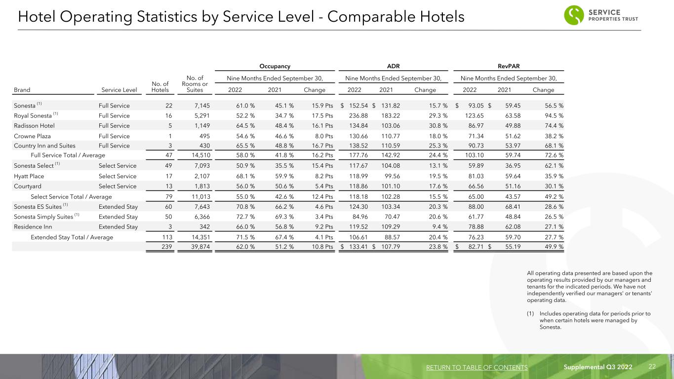 Supplemental Q3 2022 21 Occupancy ADR RevPAR No. of Hotels No. of Rooms or Suites Three Months Ended September 30, Three Months Ended September 30, Three Months Ended September 30, Brand Service Level 2022 2021 Change 2022 2021 Change 2022 2021 Change Sonesta Full Service 22 7,145 63.2 % 52.8 % 10.4 Pts $ 154.00 $ 146.77 4.9 % $ 97.33 $ 77.49 25.6 % Royal Sonesta (1) Full Service 17 5,663 60.3 % 43.5 % 16.8 Pts 241.75 201.76 19.8 % 145.78 87.77 66.1 % Radisson Hotel Full Service 5 1,149 65.8 % 58.1 % 7.7 Pts 138.88 113.20 22.7 % 91.38 65.77 38.9 % Crowne Plaza Full Service 1 495 59.0 % 51.1 % 7.9 Pts 135.27 123.47 9.6 % 79.81 63.09 26.5 % Country Inn and Suites Full Service 3 430 74.1 % 62.4 % 11.7 Pts 160.31 130.77 22.6 % 118.79 81.60 45.6 % Full Service Total / Average 48 14,882 62.4 % 50.1 % 12.3 Pts 184.93 159.67 15.8 % 115.40 79.99 44.3 % Sonesta Select (1) Select Service 49 7,093 56.5 % 42.3 % 14.2 Pts 123.75 117.86 5.0 % 69.92 49.85 40.3 % Hyatt Place Select Service 17 2,107 71.1 % 66.7 % 4.4 Pts 121.30 111.53 8.8 % 86.24 74.39 15.9 % Courtyard Select Service 13 1,813 62.0 % 61.1 % 0.9 Pts 123.62 114.08 8.4 % 76.64 69.70 10.0 % Select Service Total / Average 79 11,013 60.2 % 50.1 % 10.1 Pts 123.17 115.49 6.6 % 74.15 57.86 28.2 % Sonesta ES Suites Extended Stay 60 7,643 72.5 % 73.9 % (1.4)Pts 130.19 112.08 16.2 % 94.39 82.83 14.0 % Sonesta Simply Suites Extended Stay 50 6,366 75.5 % 79.1 % (3.6)Pts 88.70 75.75 17.1 % 66.97 59.92 11.8 % Residence Inn Extended Stay 3 342 70.9 % 69.9 % 1.0 Pts 125.90 118.37 6.4 % 89.26 82.74 7.9 % Extended Stay Total / Average 113 14,351 73.7 % 76.1 % (2.4)Pts 111.41 95.86 16.2 % 82.11 72.95 12.6 % 240 40,246 65.9 % 59.3 % 6.6 Pts $ 140.05 $ 120.08 16.6 % $ 92.29 $ 71.21 29.6 % Hotel Operating Statistics by Service Level - Comparable Hotels RETURN TO TABLE OF CONTENTS All operating data presented are based upon the operating results provided by our managers and tenants for the indicated periods. We have not independently verified our managers' or tenants' operating data. (1) Includes operating data for periods prior to when certain hotels were managed by Sonesta.