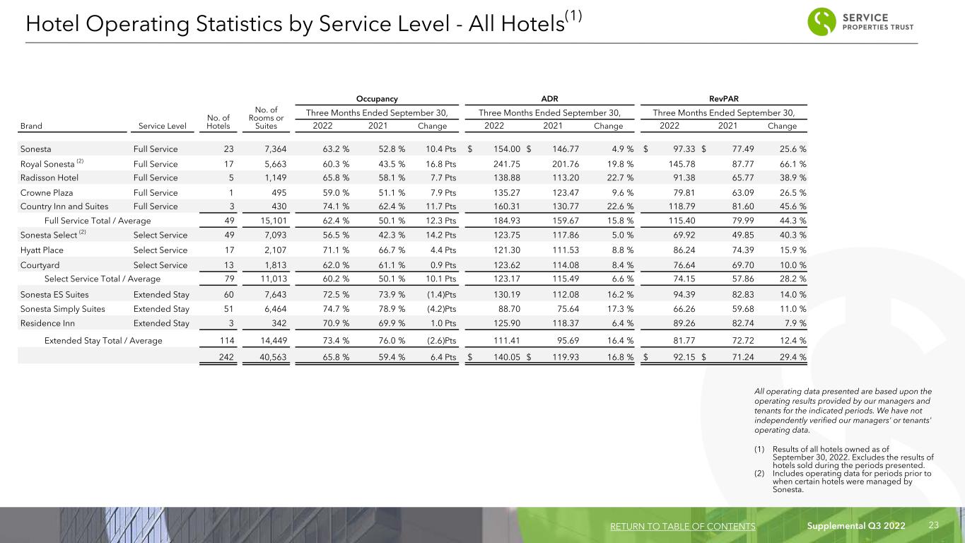 Supplemental Q3 2022 22 All operating data presented are based upon the operating results provided by our managers and tenants for the indicated periods. We have not independently verified our managers' or tenants' operating data. (1) Includes operating data for periods prior to when certain hotels were managed by Sonesta. Occupancy ADR RevPAR No. of Hotels No. of Rooms or Suites Nine Months Ended September 30, Nine Months Ended September 30, Nine Months Ended September 30, Brand Service Level 2022 2021 Change 2022 2021 Change 2022 2021 Change Sonesta (1) Full Service 22 7,145 61.0 % 45.1 % 15.9 Pts $ 152.54 $ 131.82 15.7 % $ 93.05 $ 59.45 56.5 % Royal Sonesta (1) Full Service 16 5,291 52.2 % 34.7 % 17.5 Pts 236.88 183.22 29.3 % 123.65 63.58 94.5 % Radisson Hotel Full Service 5 1,149 64.5 % 48.4 % 16.1 Pts 134.84 103.06 30.8 % 86.97 49.88 74.4 % Crowne Plaza Full Service 1 495 54.6 % 46.6 % 8.0 Pts 130.66 110.77 18.0 % 71.34 51.62 38.2 % Country Inn and Suites Full Service 3 430 65.5 % 48.8 % 16.7 Pts 138.52 110.59 25.3 % 90.73 53.97 68.1 % Full Service Total / Average 47 14,510 58.0 % 41.8 % 16.2 Pts 177.76 142.92 24.4 % 103.10 59.74 72.6 % Sonesta Select (1) Select Service 49 7,093 50.9 % 35.5 % 15.4 Pts 117.67 104.08 13.1 % 59.89 36.95 62.1 % Hyatt Place Select Service 17 2,107 68.1 % 59.9 % 8.2 Pts 118.99 99.56 19.5 % 81.03 59.64 35.9 % Courtyard Select Service 13 1,813 56.0 % 50.6 % 5.4 Pts 118.86 101.10 17.6 % 66.56 51.16 30.1 % Select Service Total / Average 79 11,013 55.0 % 42.6 % 12.4 Pts 118.18 102.28 15.5 % 65.00 43.57 49.2 % Sonesta ES Suites (1) Extended Stay 60 7,643 70.8 % 66.2 % 4.6 Pts 124.30 103.34 20.3 % 88.00 68.41 28.6 % Sonesta Simply Suites (1) Extended Stay 50 6,366 72.7 % 69.3 % 3.4 Pts 84.96 70.47 20.6 % 61.77 48.84 26.5 % Residence Inn Extended Stay 3 342 66.0 % 56.8 % 9.2 Pts 119.52 109.29 9.4 % 78.88 62.08 27.1 % Extended Stay Total / Average 113 14,351 71.5 % 67.4 % 4.1 Pts 106.61 88.57 20.4 % 76.23 59.70 27.7 % 239 39,874 62.0 % 51.2 % 10.8 Pts $ 133.41 $ 107.79 23.8 % $ 82.71 $ 55.19 49.9 % Hotel Operating Statistics by Service Level - Comparable Hotels RETURN TO TABLE OF CONTENTS
