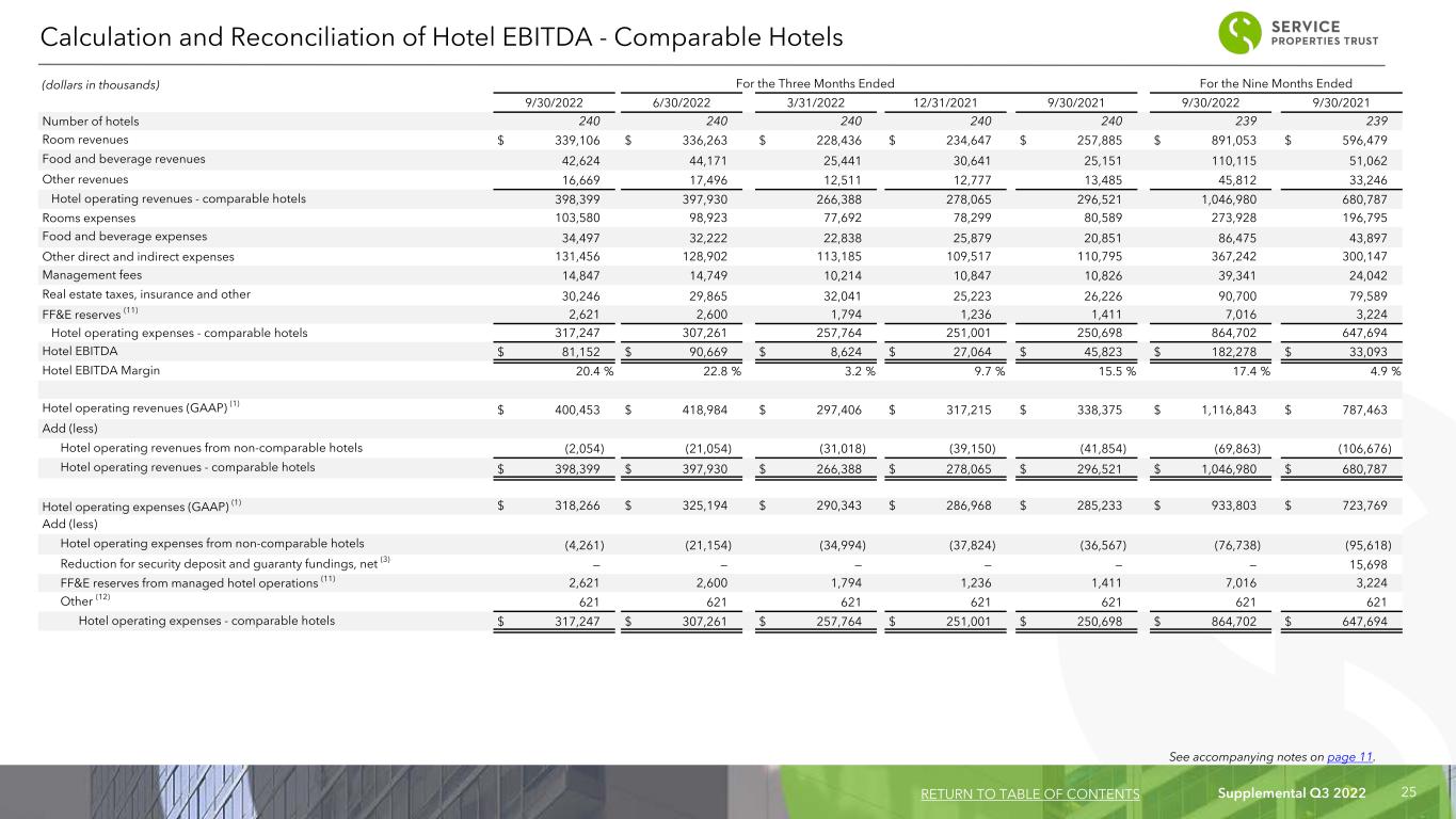 Supplemental Q3 2022 24 No. of Hotels No. of Rooms or Suites Occupancy ADR RevPAR Nine Months Ended September 30, Nine Months Ended September 30, Nine Months Ended September 30, Brand Service Level 2022 2021 Change 2022 2021 Change 2022 2021 Change Sonesta (2) Full Service 23 7,364 61.0 % 45.1 % 15.9 Pts $ 152.54 $ 131.82 15.7 % $ 93.05 $ 59.45 56.5 % Royal Sonesta (2) Full Service 17 5,663 52.5 % 34.3 % 18.2 Pts 236.17 183.10 29.0 % 123.99 62.80 97.4 % Radisson Hotel Full Service 5 1,149 64.5 % 48.4 % 16.1 Pts 134.84 103.06 30.8 % 86.97 49.88 74.4 % Crowne Plaza Full Service 1 495 54.6 % 46.6 % 8.0 Pts 130.66 110.77 18.0 % 71.34 51.62 38.2 % Country Inn and Suites Full Service 3 430 65.5 % 48.8 % 16.7 Pts 138.52 110.59 25.3 % 90.73 53.97 68.1 % Full Service Total / Average 49 15,101 57.9 % 41.6 % 16.3 Pts 178.95 143.17 25.0 % 103.61 59.56 74.0 % Sonesta Select (2) Select Service 49 7,093 50.9 % 35.5 % 15.4 Pts 117.67 104.08 13.1 % 59.89 36.95 62.1 % Hyatt Place Select Service 17 2,107 68.1 % 59.9 % 8.2 Pts 118.99 99.56 19.5 % 81.03 59.64 35.9 % Courtyard Select Service 13 1,813 56.0 % 50.6 % 5.4 Pts 118.86 101.10 17.6 % 66.56 51.16 30.1 % Select Service Total / Average 79 11,013 55.0 % 42.6 % 12.4 Pts 118.18 102.28 15.5 % 65.00 43.57 49.2 % Sonesta ES Suites (2) Extended Stay 60 7,643 70.8 % 66.2 % 4.6 Pts 124.30 103.34 20.3 % 88.00 68.41 28.6 % Sonesta Simply Suites (2) Extended Stay 51 6,464 71.9 % 69.4 % 2.5 Pts 84.96 70.35 20.8 % 61.09 48.82 25.1 % Residence Inn Extended Stay 3 342 66.0 % 56.8 % 9.2 Pts 119.52 109.29 9.4 % 78.88 62.08 27.1 % Extended Stay Total / Average 114 14,449 71.2 % 67.4 % 3.8 Pts 106.61 88.38 20.6 % 75.91 59.57 27.4 % 242 40,563 61.9 % 51.2 % 10.7 Pts $ 134.19 $ 107.78 24.5 % $ 83.06 $ 55.18 50.5 % Hotel Operating Statistics by Service Level - All Hotels(1) RETURN TO TABLE OF CONTENTS All operating data presented are based upon the operating results provided by our managers and tenants for the indicated periods. We have not independently verified our managers' or tenants' operating data. (1) Results of all hotels owned as of September 30, 2022. Excludes the results of hotels sold during the periods presented. (2) Includes operating data for periods prior to when certain hotels were managed by Sonesta.