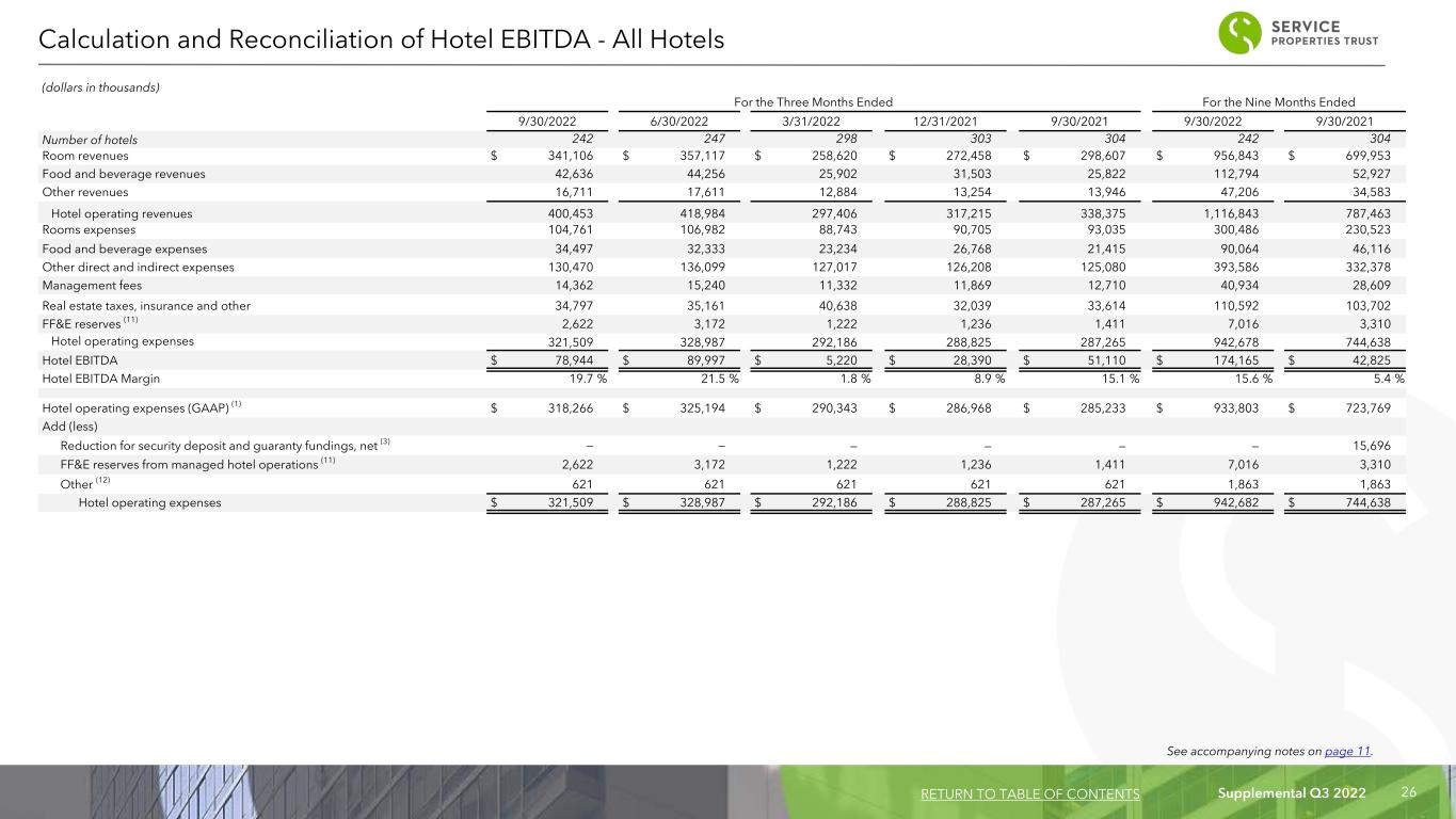 Supplemental Q3 2022 25 (dollars in thousands) For the Three Months Ended For the Nine Months Ended 9/30/2022 6/30/2022 3/31/2022 12/31/2021 9/30/2021 9/30/2022 9/30/2021 Number of hotels 240 240 240 240 240 239 239 Room revenues $ 339,106 $ 336,263 $ 228,436 $ 234,647 $ 257,885 $ 891,053 $ 596,479 Food and beverage revenues 42,624 44,171 25,441 30,641 25,151 110,115 51,062 Other revenues 16,669 17,496 12,511 12,777 13,485 45,812 33,246 Hotel operating revenues - comparable hotels 398,399 397,930 266,388 278,065 296,521 1,046,980 680,787 Rooms expenses 103,580 98,923 77,692 78,299 80,589 273,928 196,795 Food and beverage expenses 34,497 32,222 22,838 25,879 20,851 86,475 43,897 Other direct and indirect expenses 131,456 128,902 113,185 109,517 110,795 367,242 300,147 Management fees 14,847 14,749 10,214 10,847 10,826 39,341 24,042 Real estate taxes, insurance and other 30,246 29,865 32,041 25,223 26,226 90,700 79,589 FF&E reserves (11) 2,621 2,600 1,794 1,236 1,411 7,016 3,224 Hotel operating expenses - comparable hotels 317,247 307,261 257,764 251,001 250,698 864,702 647,694 Hotel EBITDA $ 81,152 $ 90,669 $ 8,624 $ 27,064 $ 45,823 $ 182,278 $ 33,093 Hotel EBITDA Margin 20.4 % 22.8 % 3.2 % 9.7 % 15.5 % 17.4 % 4.9 % Hotel operating revenues (GAAP) (1) $ 400,453 $ 418,984 $ 297,406 $ 317,215 $ 338,375 $ 1,116,843 $ 787,463 Add (less) Hotel operating revenues from non-comparable hotels (2,054) (21,054) (31,018) (39,150) (41,854) (69,863) (106,676) Hotel operating revenues - comparable hotels $ 398,399 $ 397,930 $ 266,388 $ 278,065 $ 296,521 $ 1,046,980 $ 680,787 Hotel operating expenses (GAAP) (1) $ 318,266 $ 325,194 $ 290,343 $ 286,968 $ 285,233 $ 933,803 $ 723,769 Add (less) Hotel operating expenses from non-comparable hotels (4,261) (21,154) (34,994) (37,824) (36,567) (76,738) (95,618) Reduction for security deposit and guaranty fundings, net (3) — — — — — — 15,698 FF&E reserves from managed hotel operations (11) 2,621 2,600 1,794 1,236 1,411 7,016 3,224 Other (12) 621 621 621 621 621 621 621 Hotel operating expenses - comparable hotels $ 317,247 $ 307,261 $ 257,764 $ 251,001 $ 250,698 $ 864,702 $ 647,694 Calculation and Reconciliation of Hotel EBITDA - Comparable Hotels RETURN TO TABLE OF CONTENTS See accompanying notes on page 11.